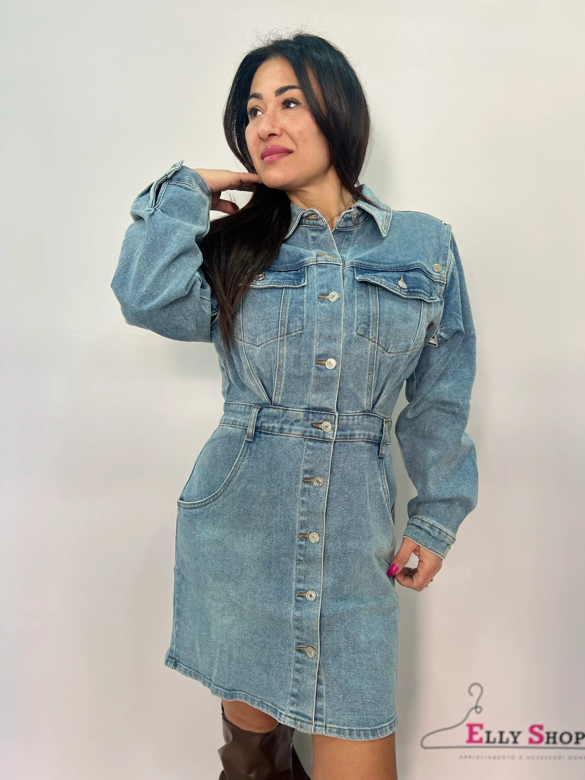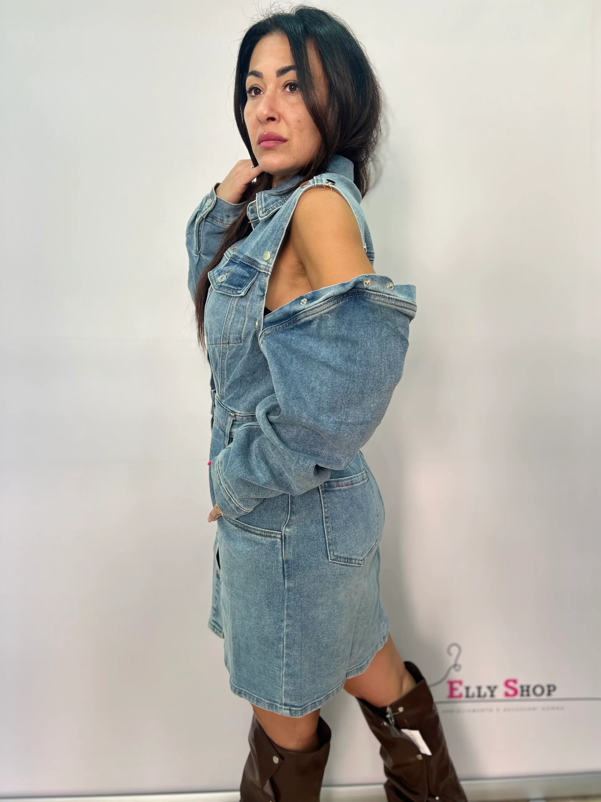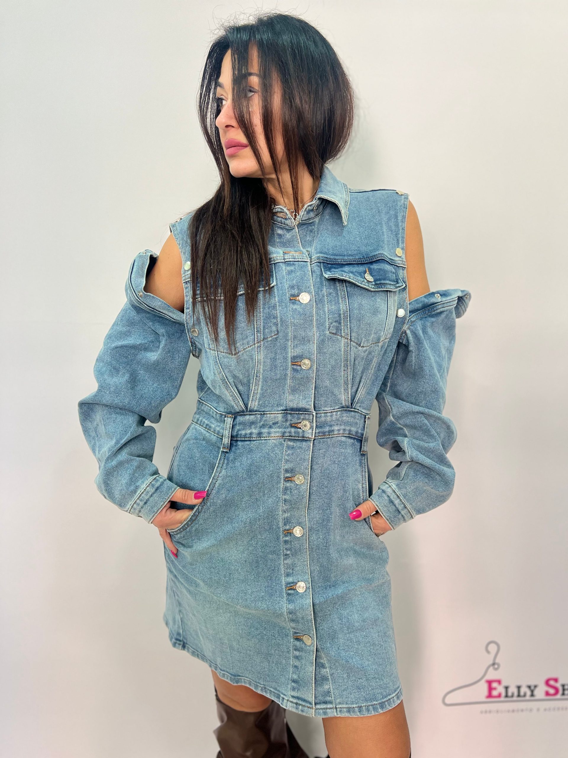 Abito chemisier in denim dal design moderno e versatile, perfetto per creare look casual di tendenza con un tocco originale. Il modello presenta colletto classico, chiusura frontale con bottoni e linea leggermente sagomata in vita che valorizza la silhouette. Le maniche lunghe sono rimovibili grazie ai pratici bottoni sulle spalle, permettendo di trasformare l’abito in una versione smanicata per adattarsi a diverse stagioni e occasioni. Dotato di tasche frontali e laterali, unisce stile e funzionalità. Il lavaggio denim chiaro lo rende facile da abbinare a stivali, sneakers o décolleté per outfit sempre attuali. Vestibilità regolare.