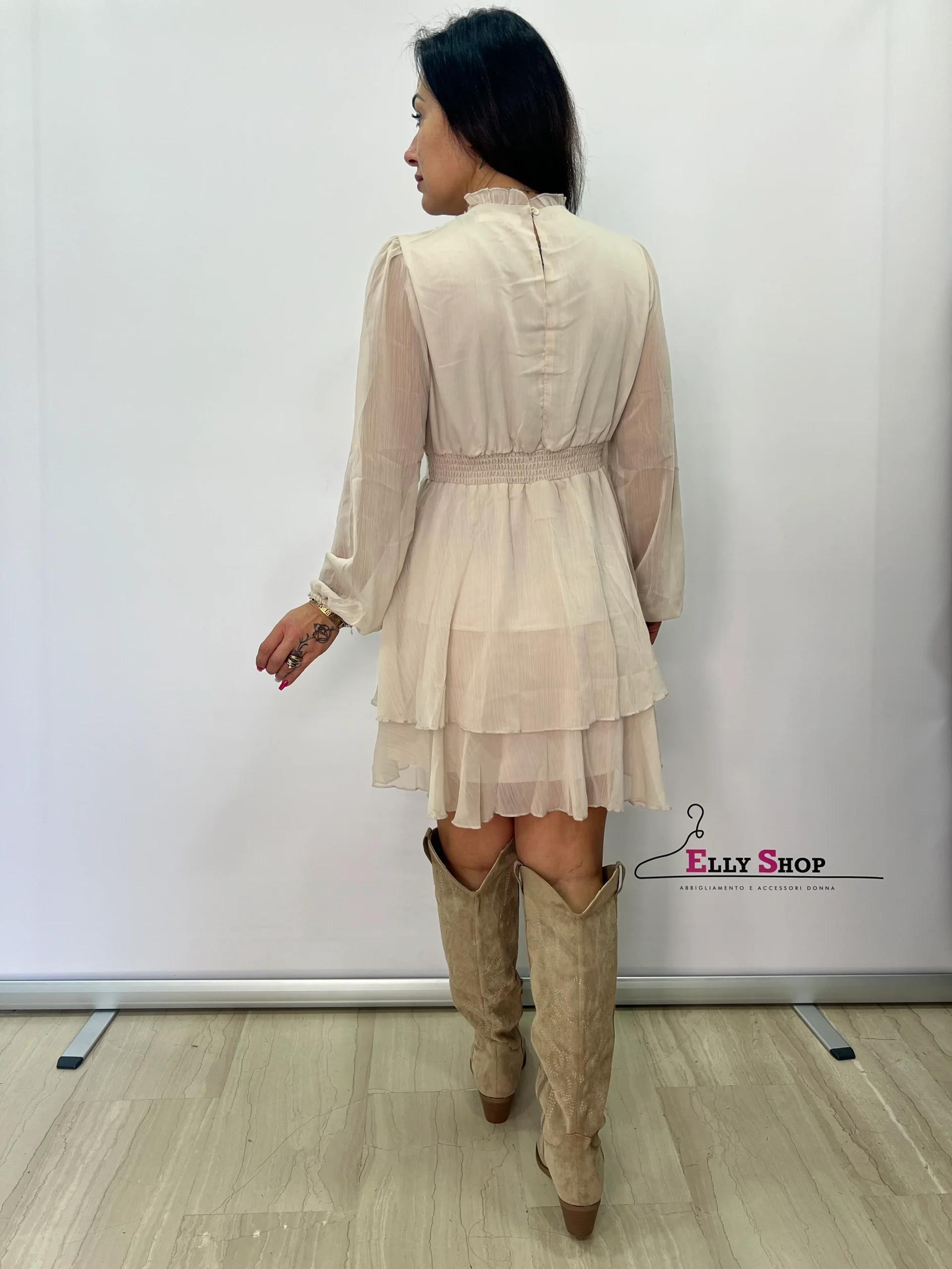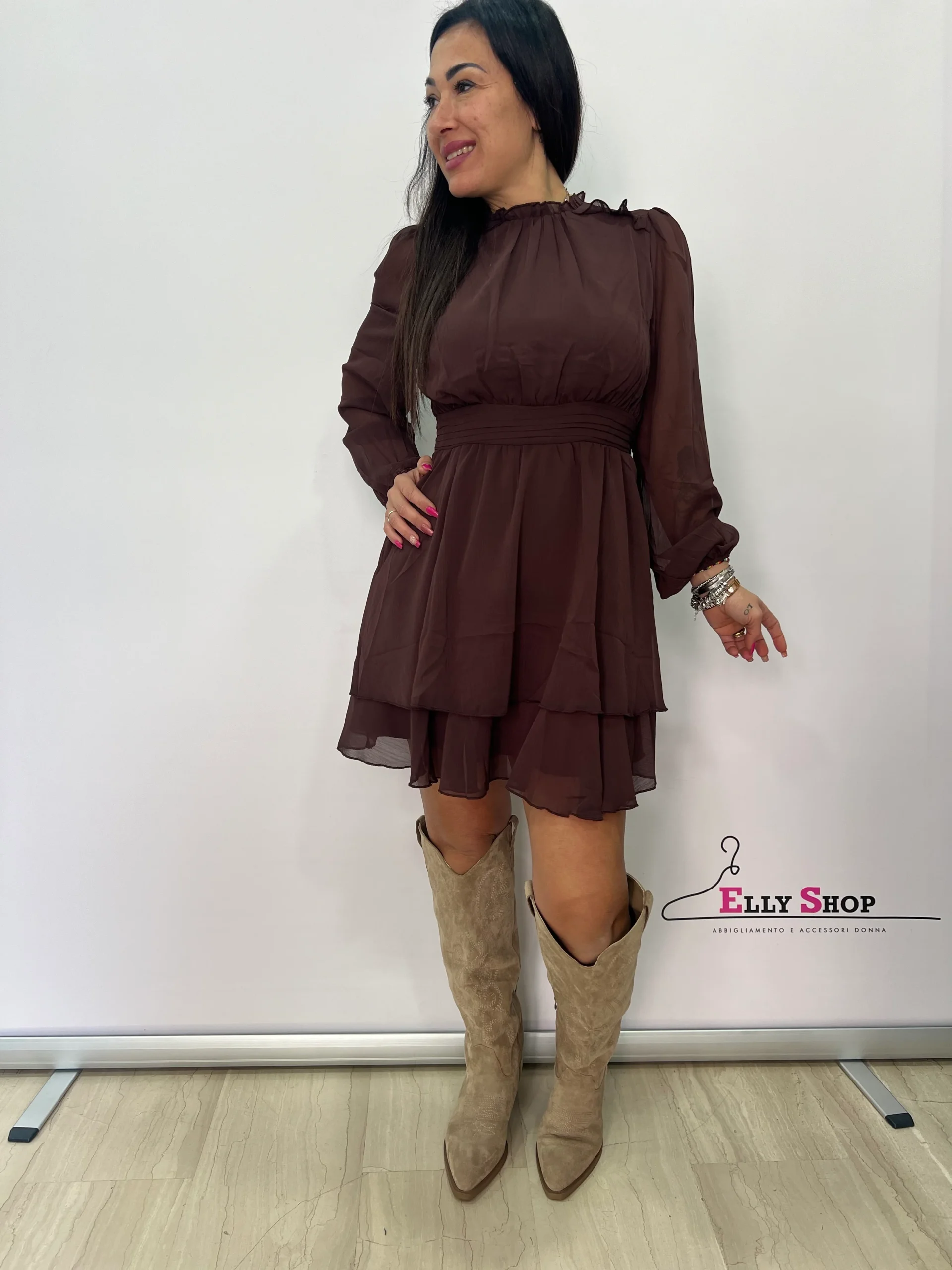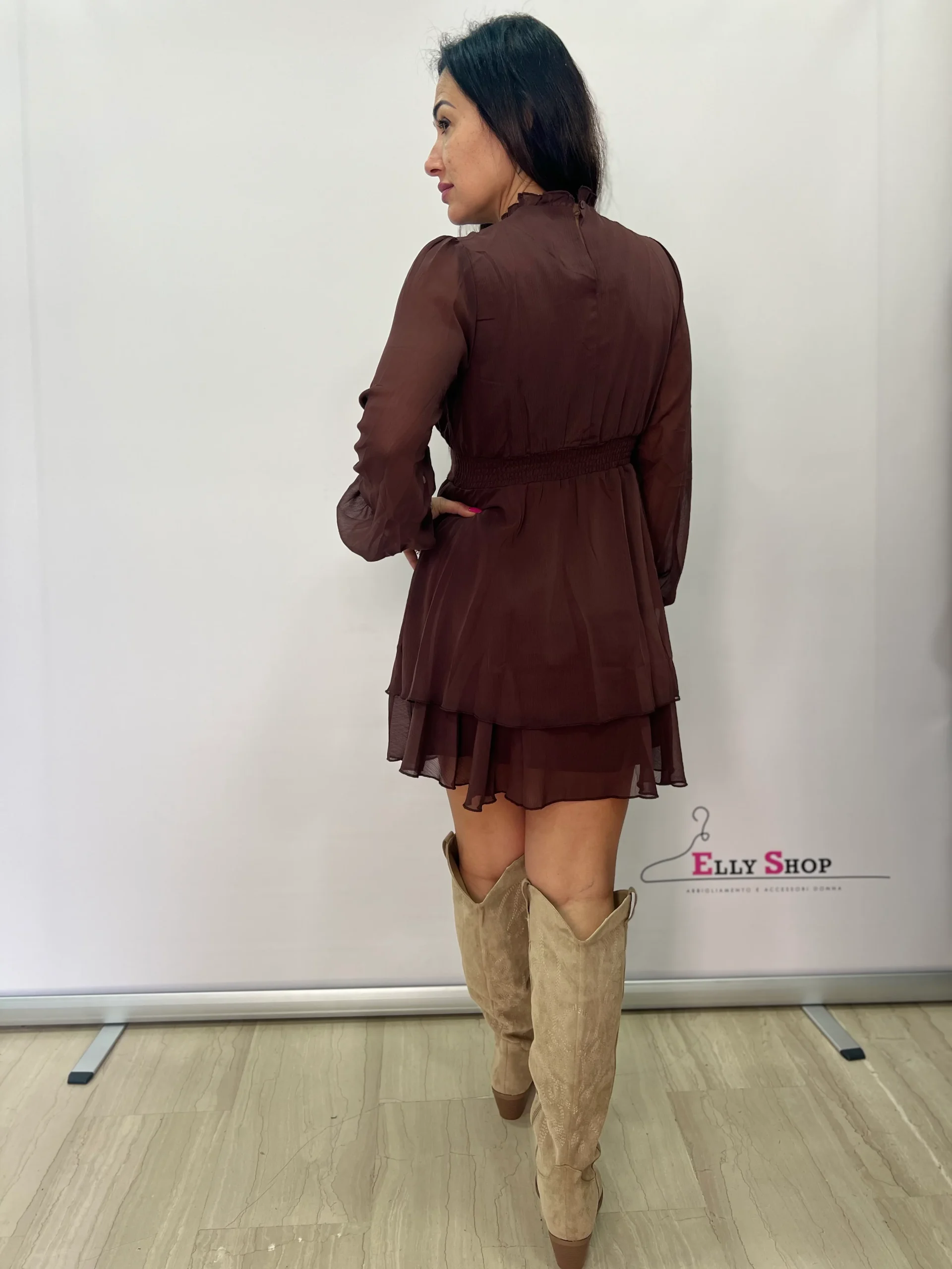 Abito corto dallo stile romantico e femminile, realizzato in leggero chiffon con delicato effetto mosso. Il design presenta collo alto con rouches e maniche lunghe leggermente ampie con polsino, per un’eleganza raffinata e senza tempo. Il punto vita è valorizzato da una fascia che definisce la silhouette, mentre la gonna a balze dona movimento e leggerezza ad ogni passo. Perfetto per cerimonie, eventi, serate speciali o per un look ricercato da giorno abbinato a stivali o décolleté. Disponibile nelle varianti beige e marrone, tonalità versatili e sofisticate ideali per la stagione autunnale e primaverile.