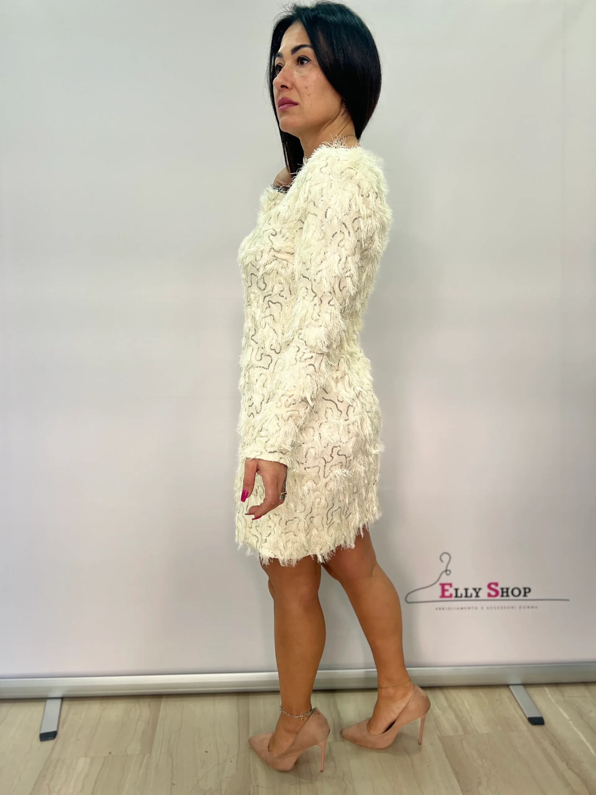 Abito corto donna dal design elegante e d’impatto, perfetto per occasioni speciali, serate ed eventi glamour. Il modello presenta una linea aderente che valorizza la silhouette, arricchita da una lavorazione effetto piumato con dettagli luminosi che donano movimento e brillantezza al look. Le maniche lunghe e lo scollo rotondo rendono l’abito raffinato ed equilibrato, ideale da abbinare a décolleté o sandali per un outfit sofisticato e femminile. Disponibile nelle varianti colore panna e nero, due tonalità intramontabili e versatili. Vestibilità regolare.