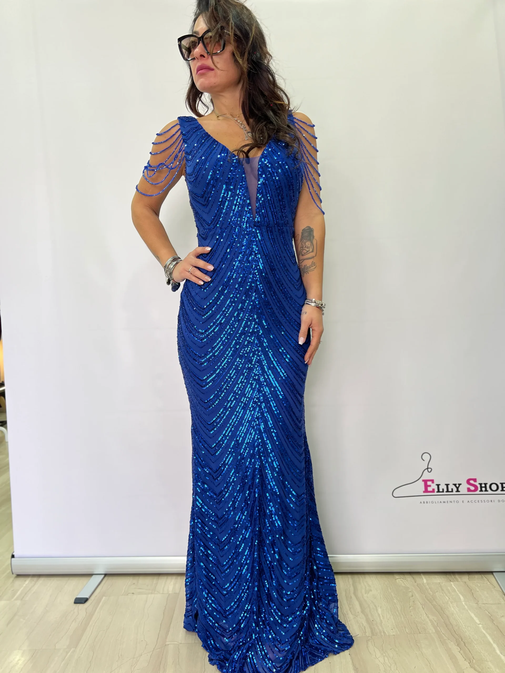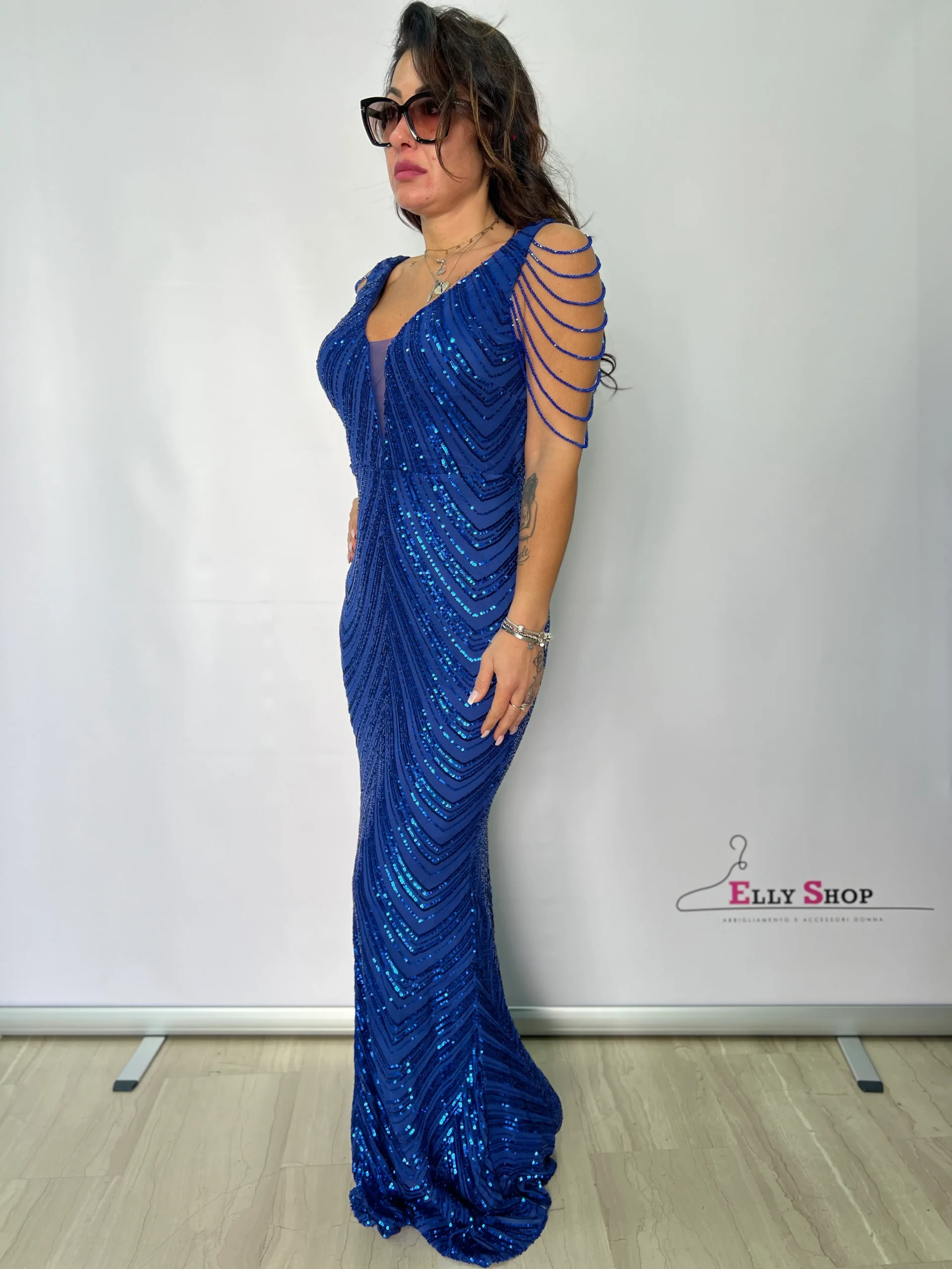 Brilla con eleganza in questo abito da sera lungo blu, ricoperto di paillettes scintillanti per un effetto glamour unico. Il design sofisticato presenta una profonda scollatura a V e raffinate maniche a catena, che aggiungono un tocco di classe e sensualitร . Perfetto per cerimonie, matrimoni, gala ed eventi speciali, questo vestito esalta la silhouette con una vestibilitร  impeccabile. Disponibile su Elly Shop.