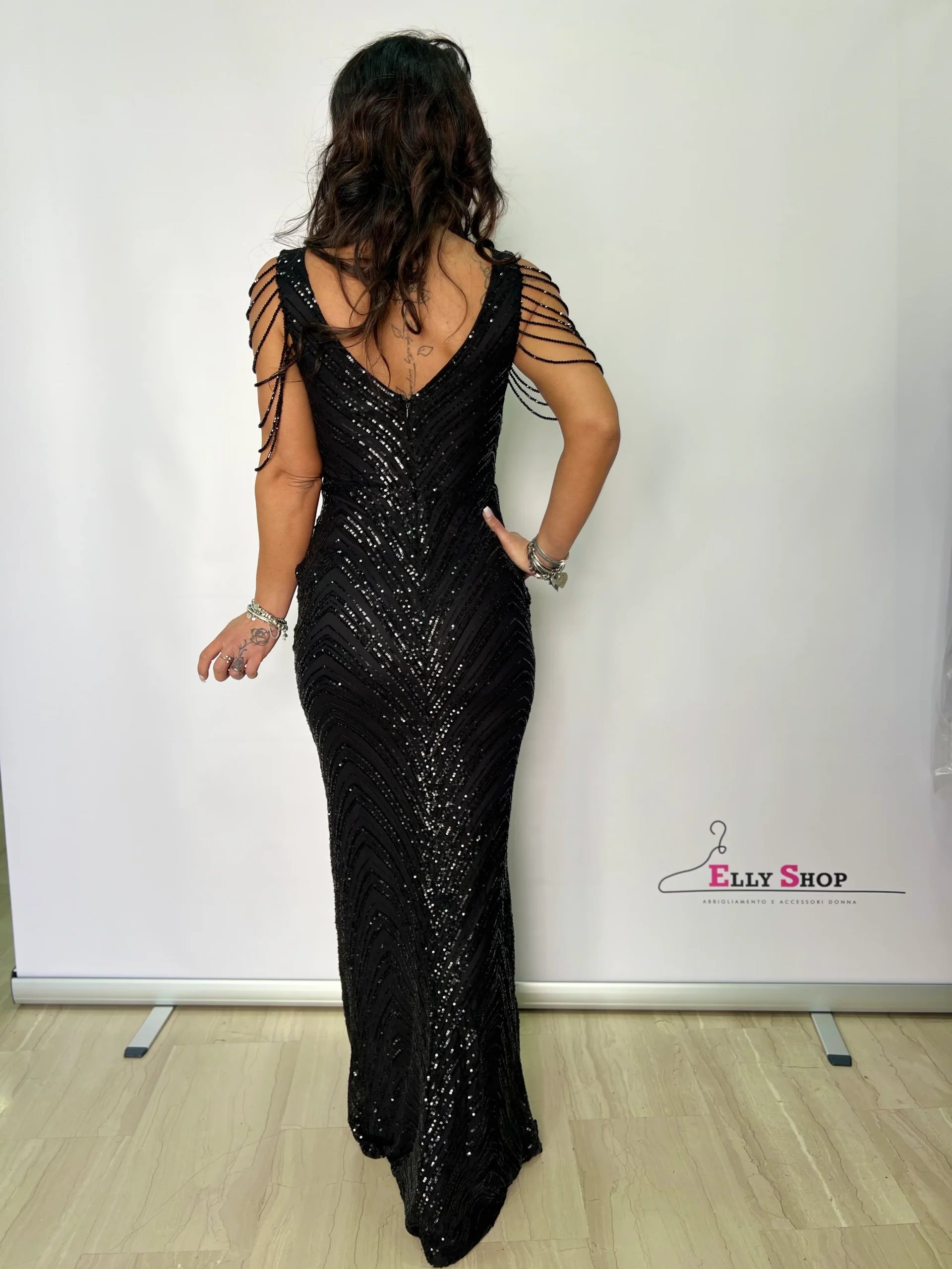 Abito da Sera Elegante Nero con Paillettes e Maniche a Catena – Vestito Lungo Donna