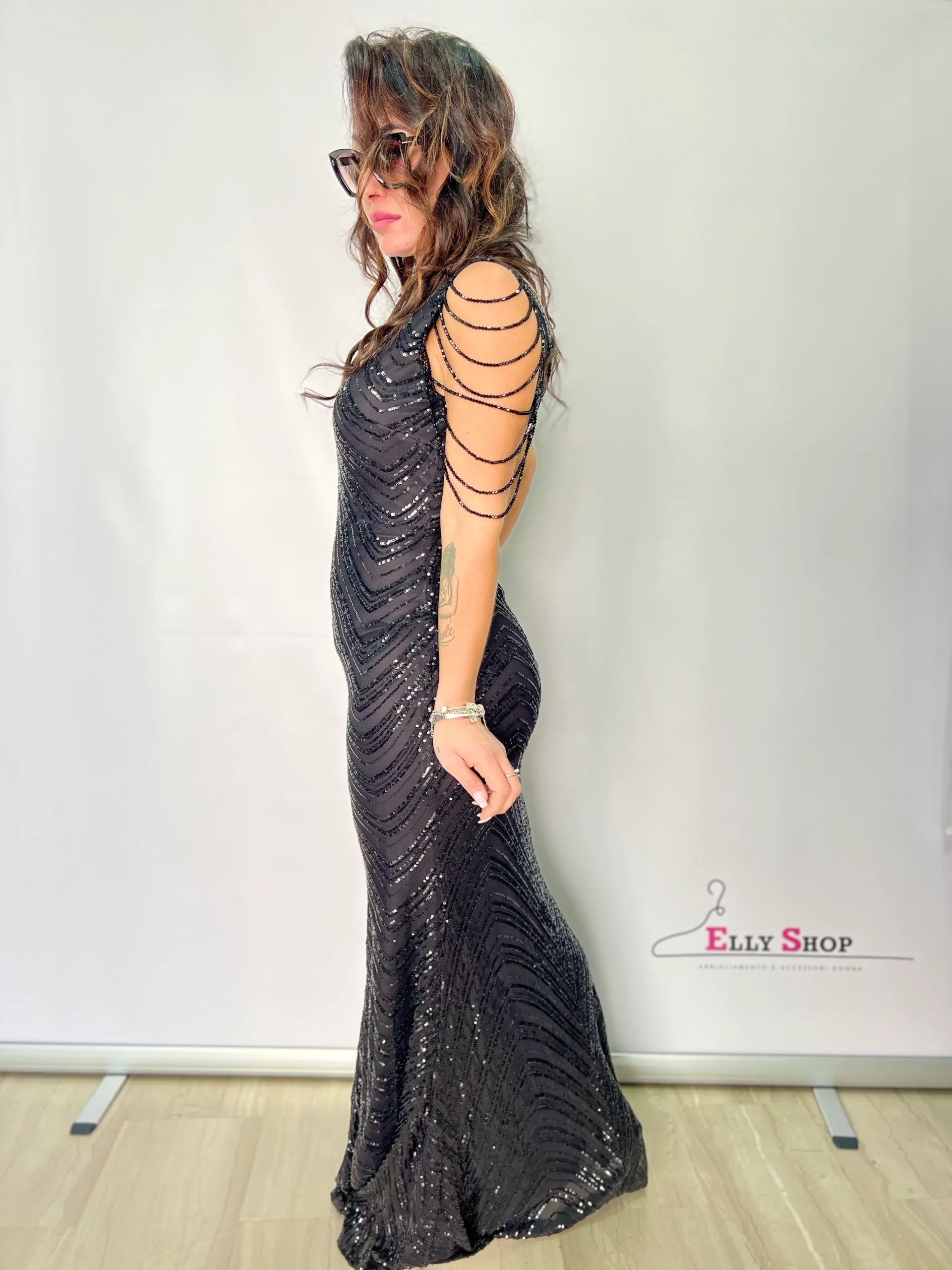 Recensisci per primo “Abito da Sera Elegante Nero con Paillettes e Maniche a Catena – Vestito Lungo Donna”
