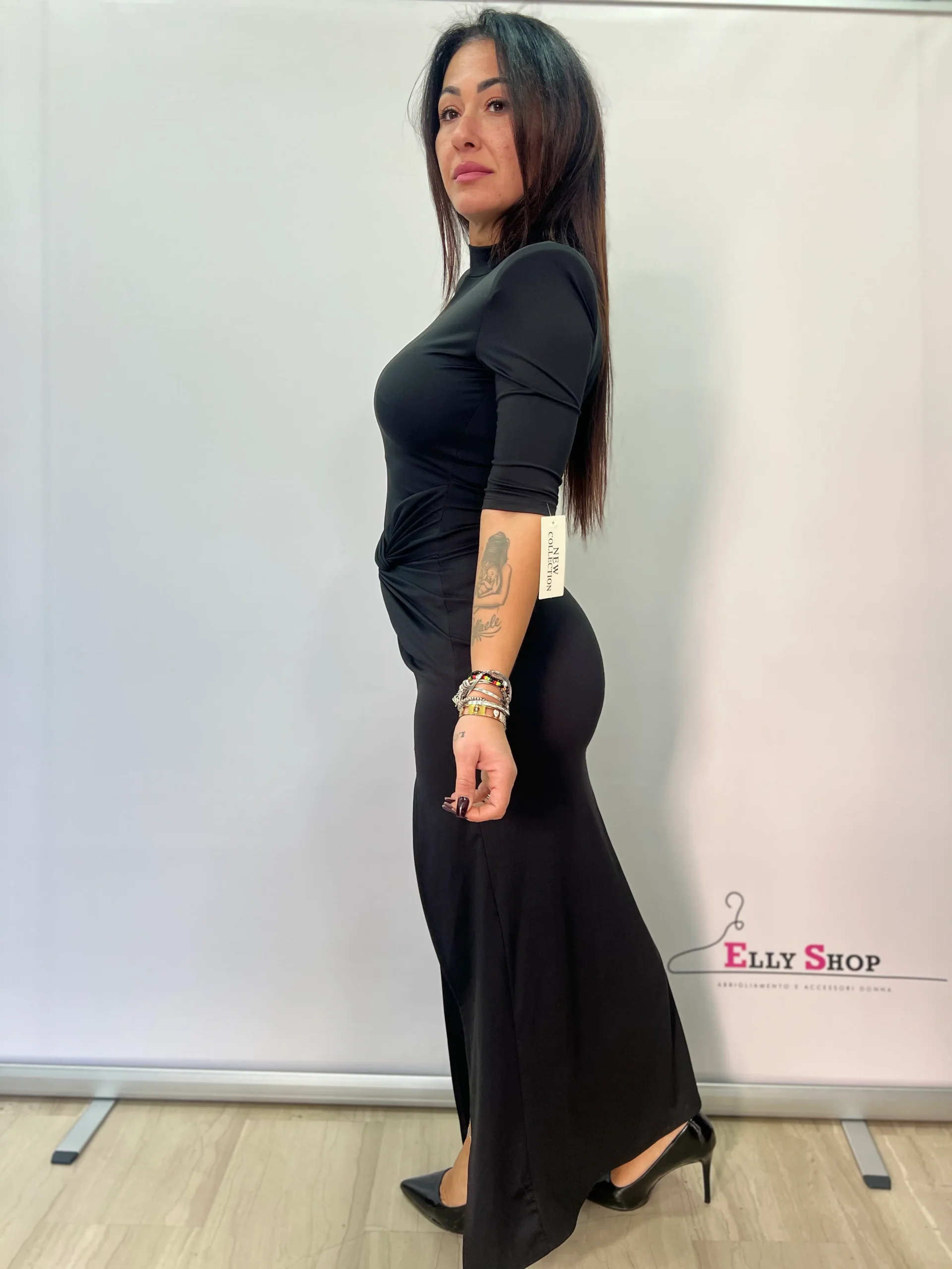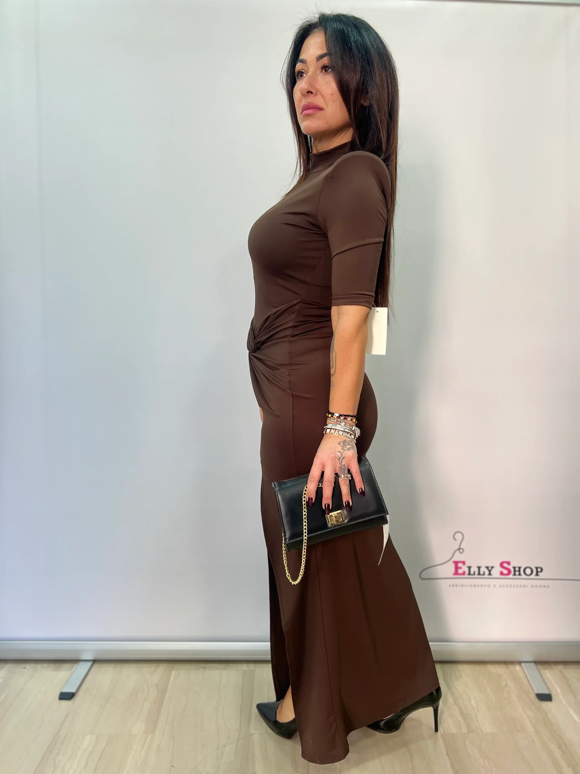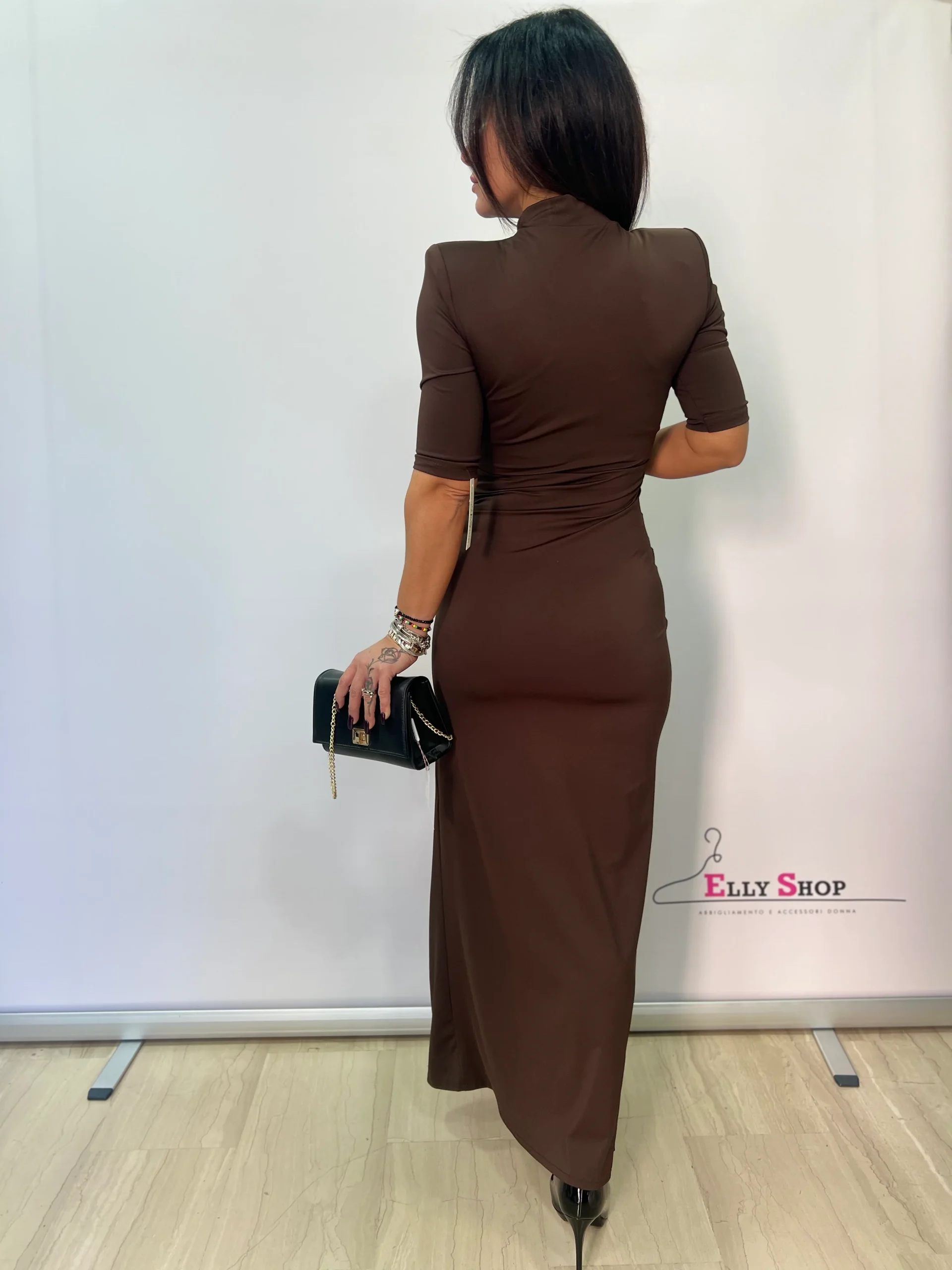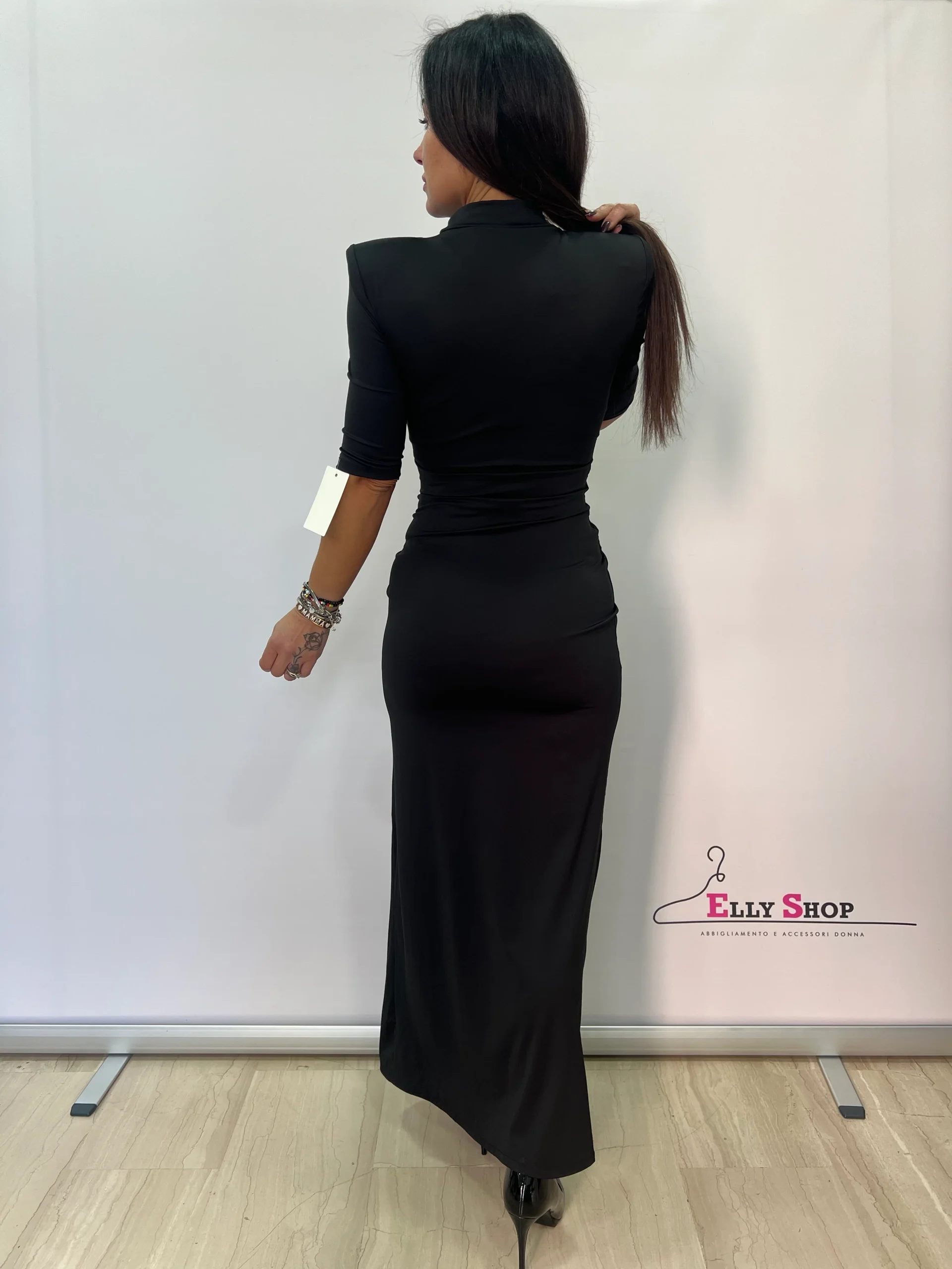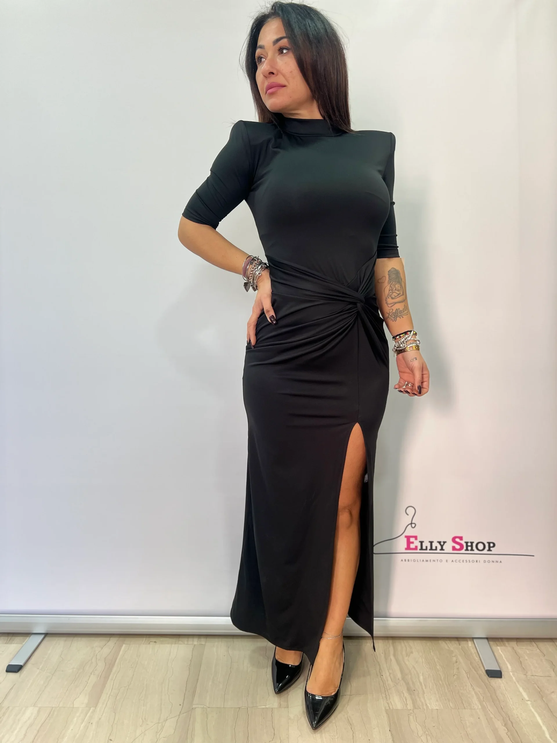 Abito donna elegante e sensuale, caratterizzato da una linea aderente che valorizza la silhouette e da un raffinato drappeggio laterale che dona movimento e femminilità. Il collo alto e le maniche a tre quarti rendono il capo sofisticato e versatile, perfetto per occasioni serali, eventi speciali o cene eleganti. Lo spacco laterale aggiunge un tocco deciso e glamour, mantenendo uno stile pulito e moderno. Disponibile in colori intramontabili, ideali per un look chic e senza tempo.