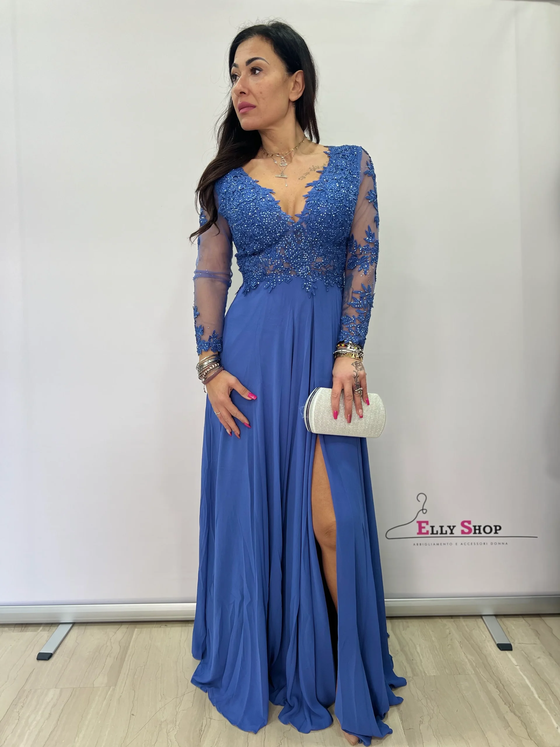 Abito lungo da cerimonia dal fascino sofisticato e romantico, ideale per matrimoni, eventi serali e occasioni speciali. Il modello presenta un corpetto riccamente decorato con applicazioni floreali e perline tono su tono, impreziosito da maniche lunghe trasparenti che donano leggerezza e raffinatezza. La scollatura a V valorizza il décolleté, mentre il retro con scollo profondo aggiunge un tocco sensuale ed elegante. La gonna ampia e fluida, con spacco laterale, slancia la figura accompagnando i movimenti con grazia. Disponibile in elegante tonalità blu, perfetta per look importanti e ricercati.