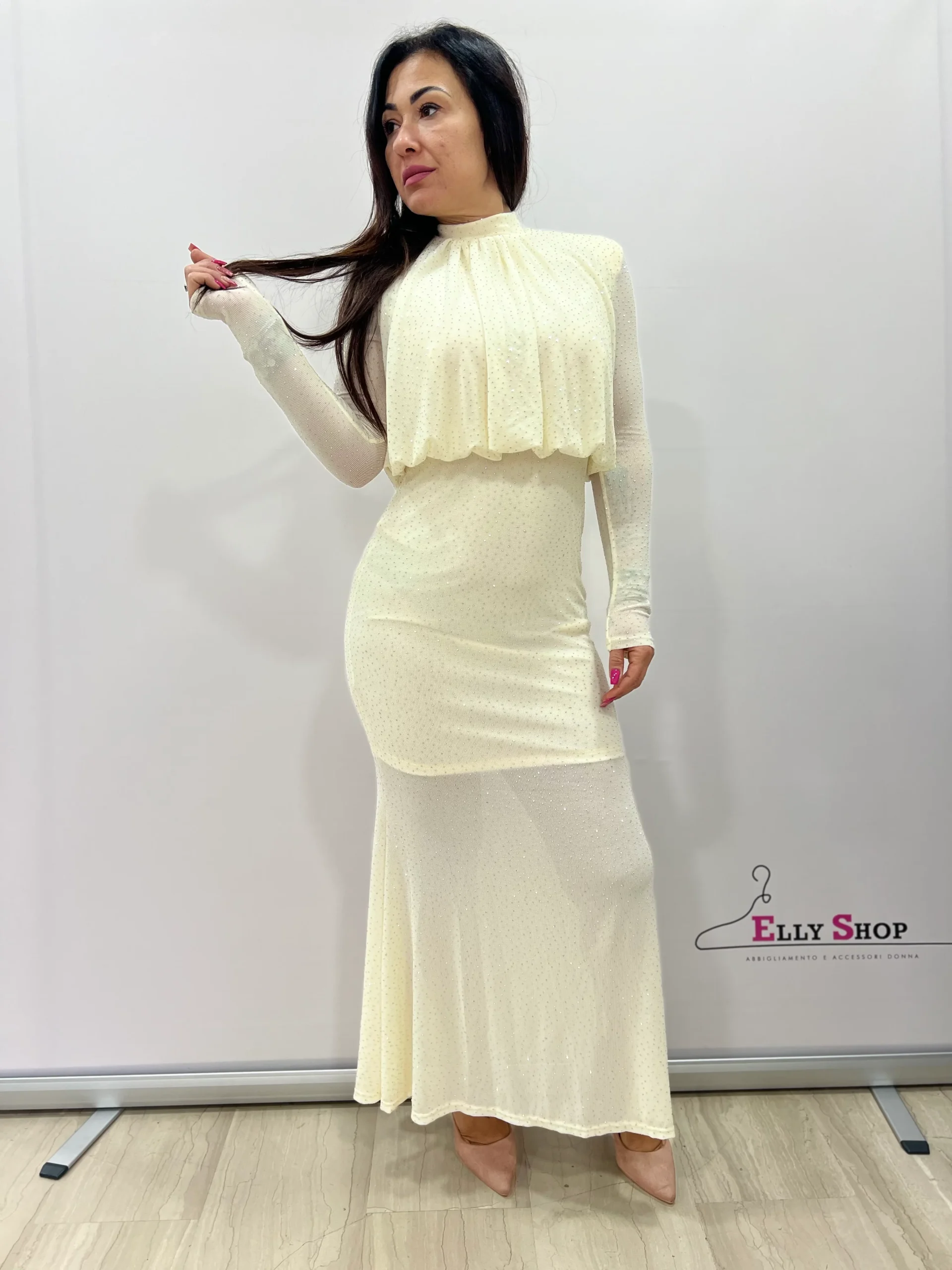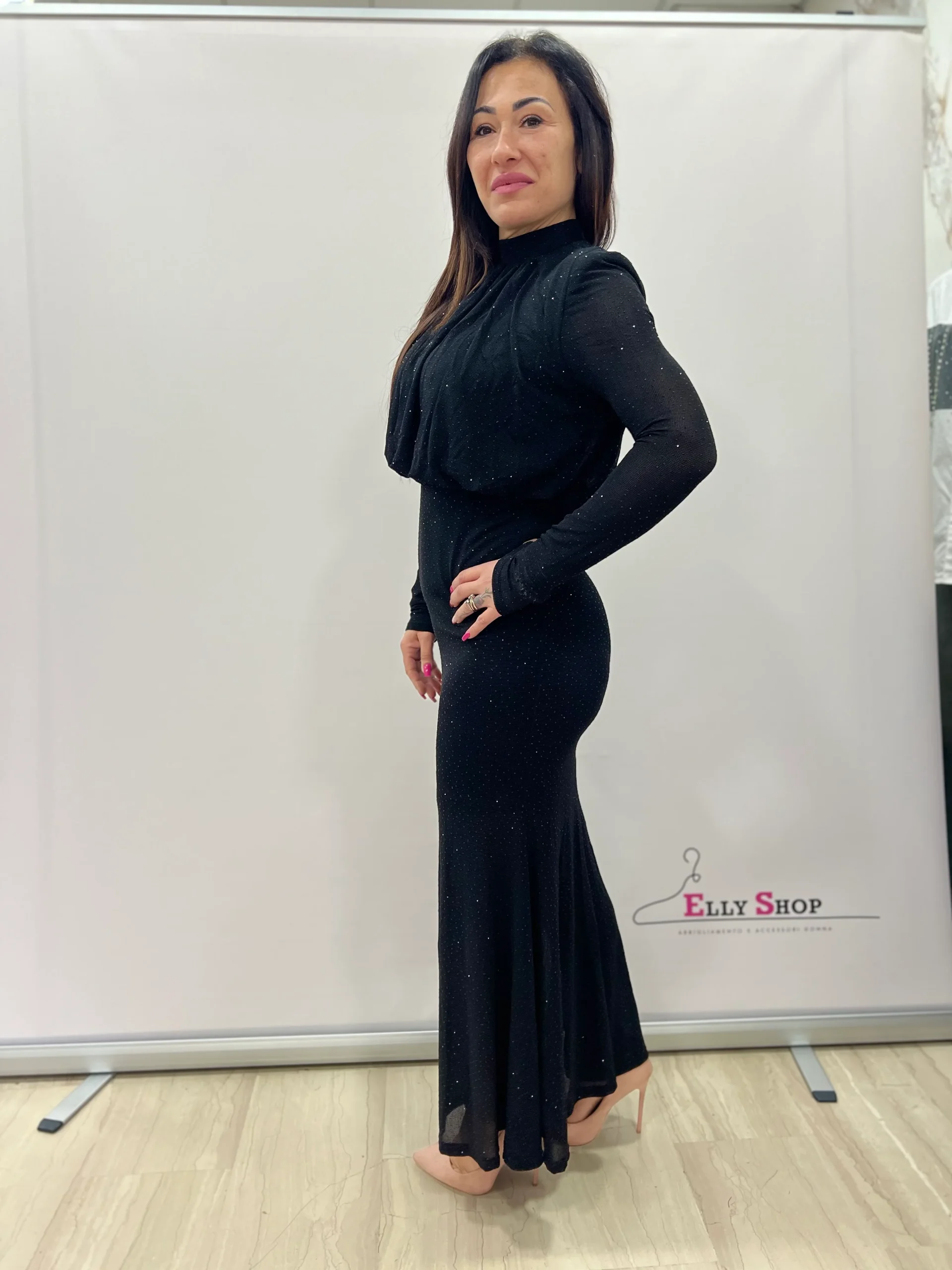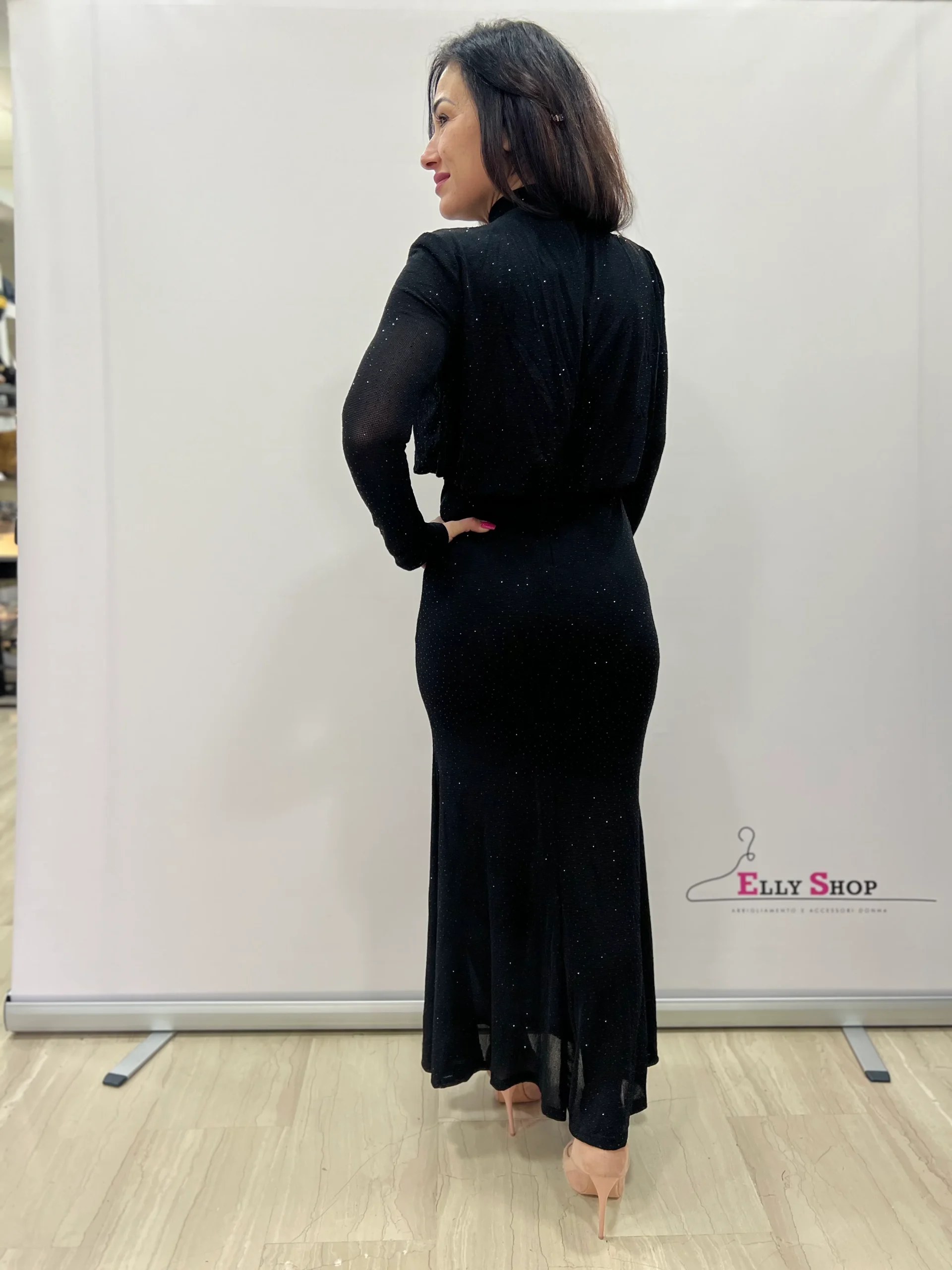 Dettaglio: Collo alto, maniche lunghe semi trasparenti, corpetto morbido con effetto blusa e gonna lunga leggermente svasata con micro glitter