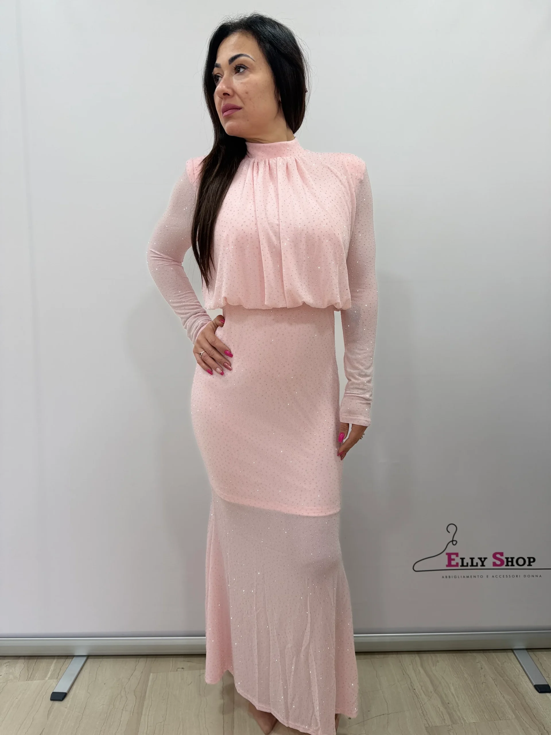 Abito lungo dal fascino elegante e raffinato, realizzato in delicato tessuto effetto tulle impreziosito da micro glitter luminosi che donano un tocco sofisticato e femminile. Il design con collo alto e maniche lunghe semi trasparenti valorizza la silhouette con equilibrio e classe, mentre la parte superiore leggermente drappeggiata crea movimento e morbidezza. La gonna lunga con fondo leggermente svasato slancia la figura, rendendolo perfetto per cerimonie, eventi serali e occasioni speciali. Disponibile nelle varianti rosa cipria, giallo pastello e nero. Un capo scenografico e di tendenza, ideale per la stagione Autunno/Inverno e Primavera.