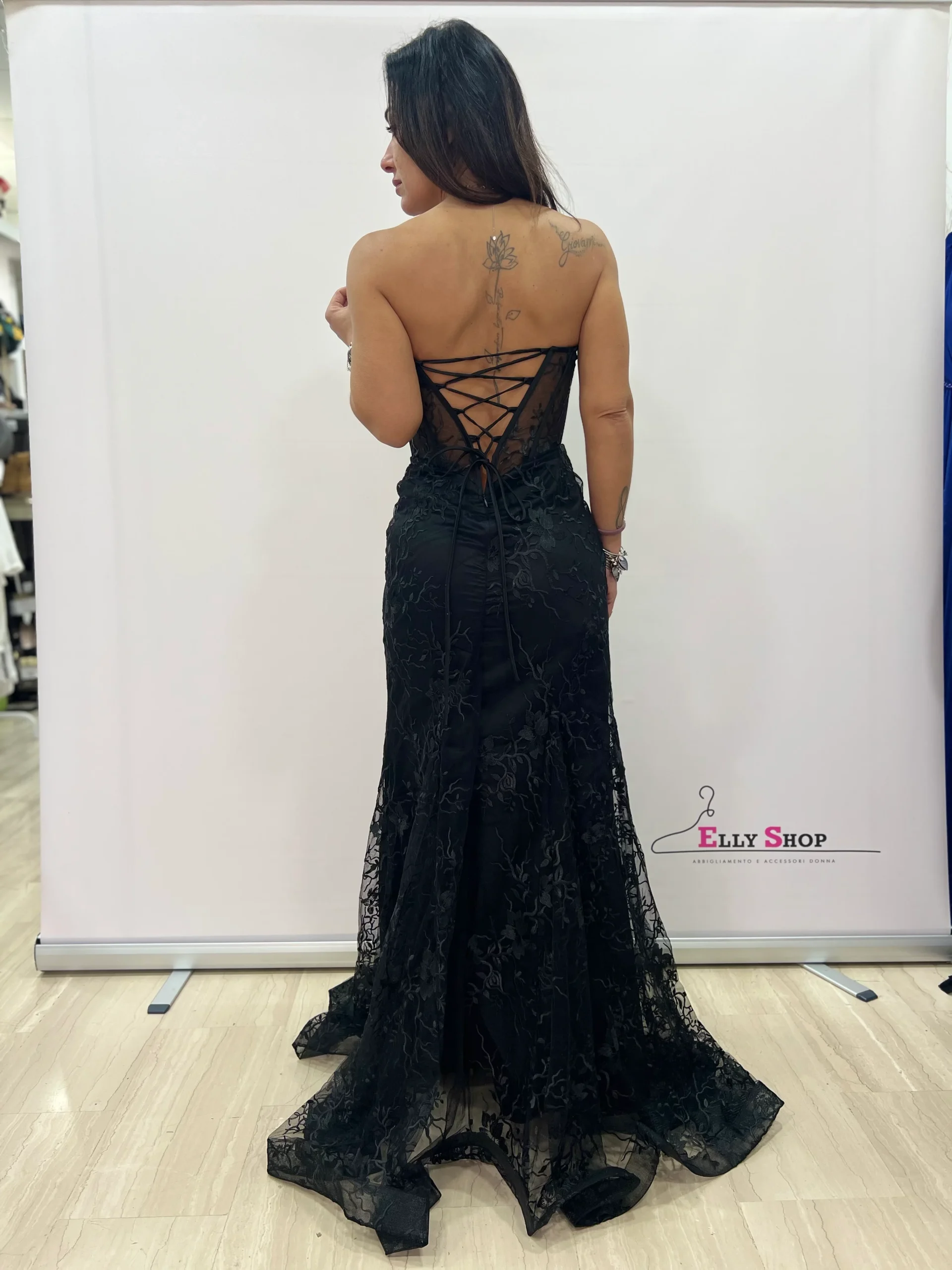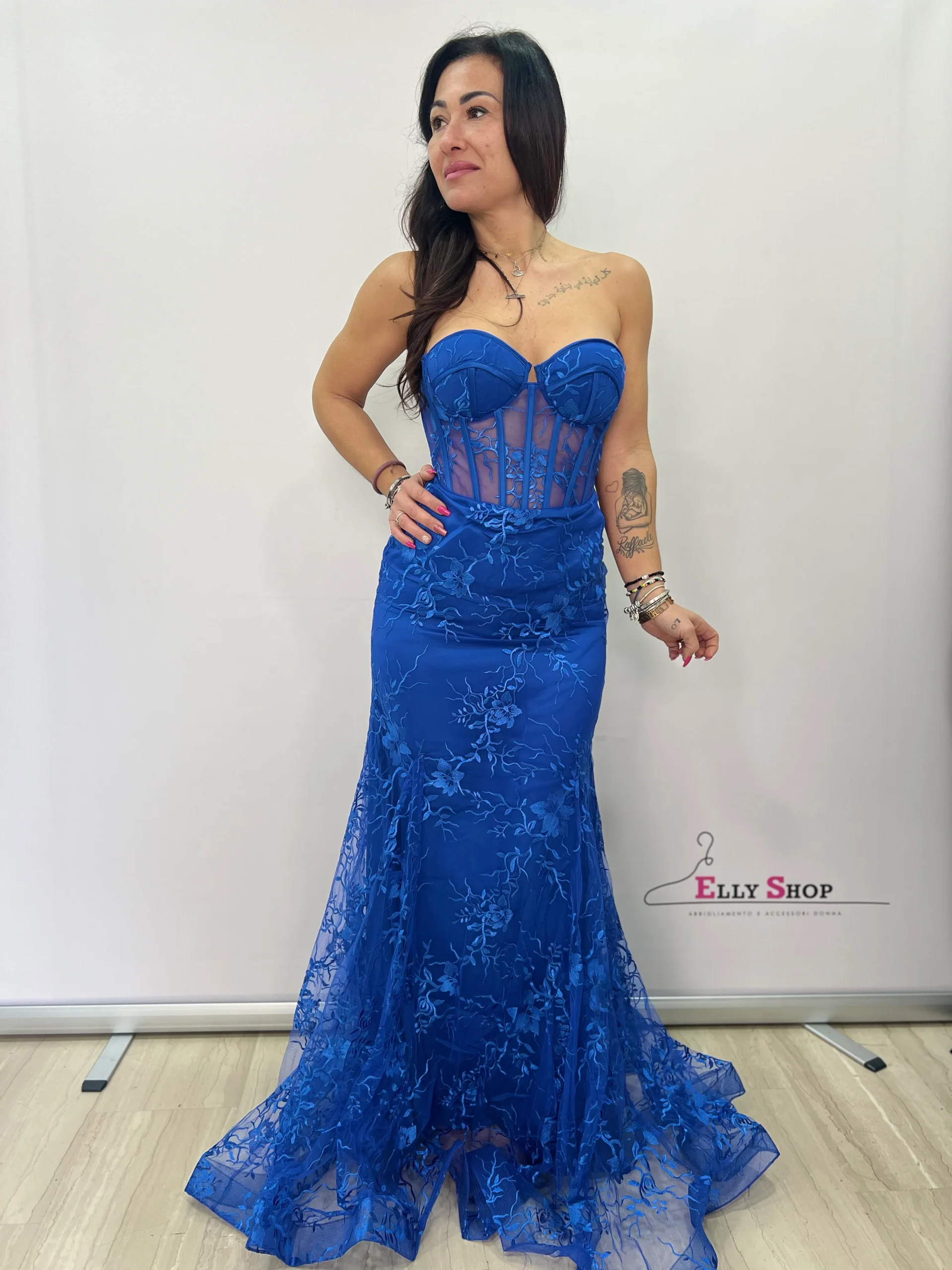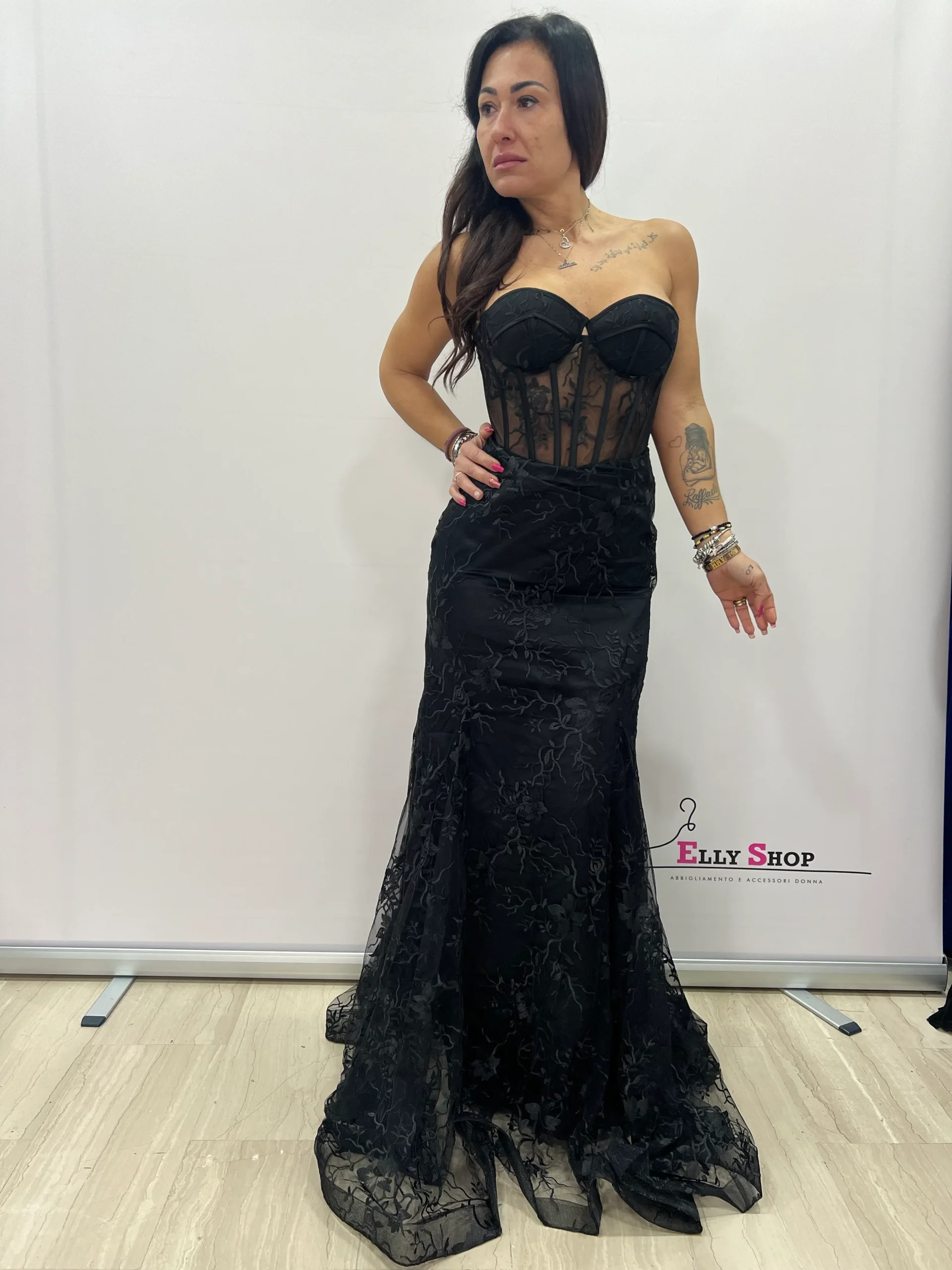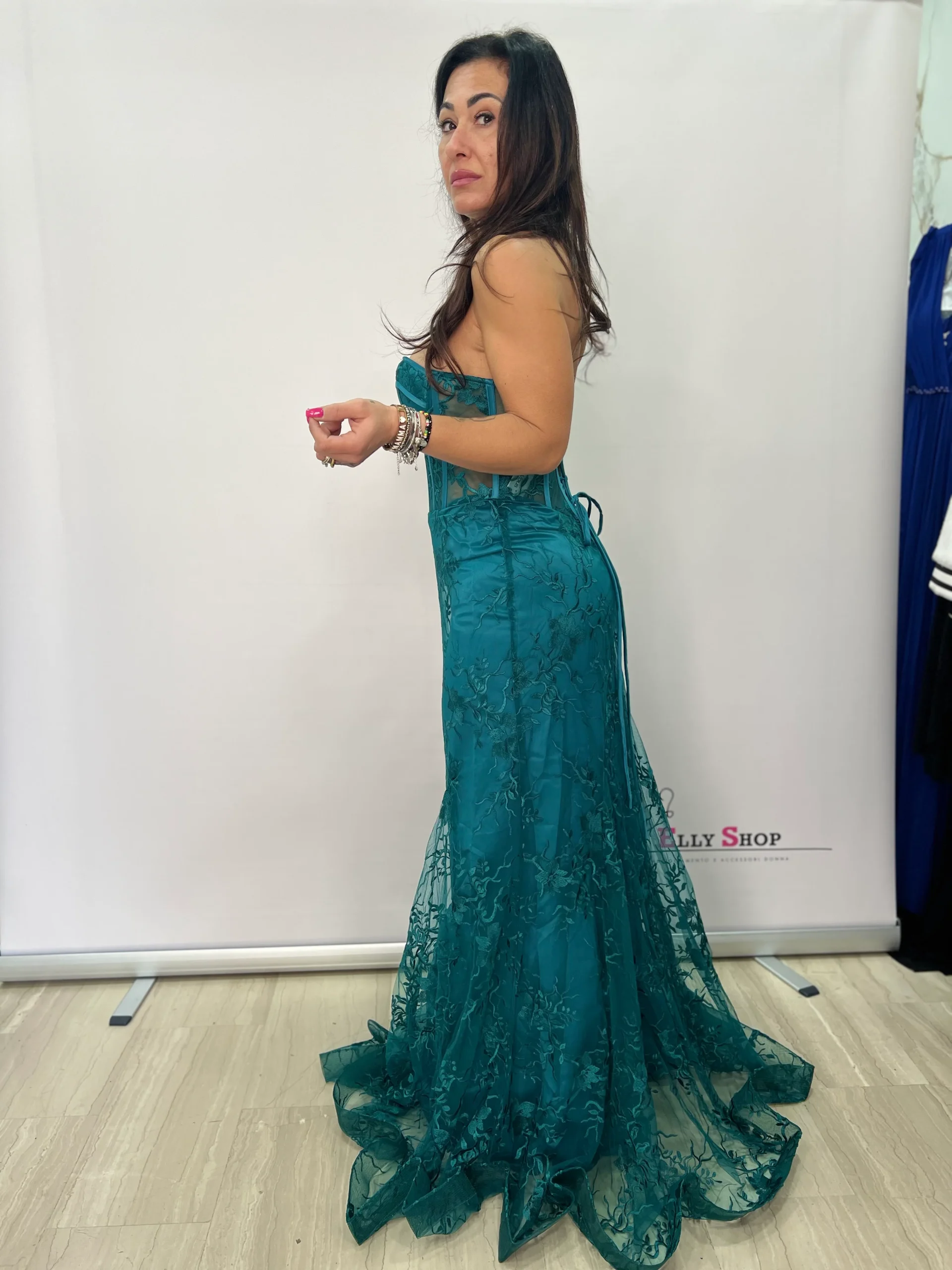 Abito lungo dallo stile sensuale e sofisticato, ideale per cerimonie, eventi esclusivi, serate di gala e occasioni speciali. Il corpetto strutturato a corsetto valorizza il punto vita e sostiene il décolleté grazie alla scollatura a cuore, mentre i ricami floreali in rilievo donano un effetto elegante e ricercato. Il retro con chiusura regolabile a lacci esalta la silhouette e garantisce una vestibilità personalizzata. La gonna modello sirena, aderente sui fianchi e morbida al fondo con leggero strascico, crea un movimento raffinato ad ogni passo. Disponibile nelle varianti verde petrolio, nero e blu royal, per uno stile deciso e di grande impatto. ART. 7067