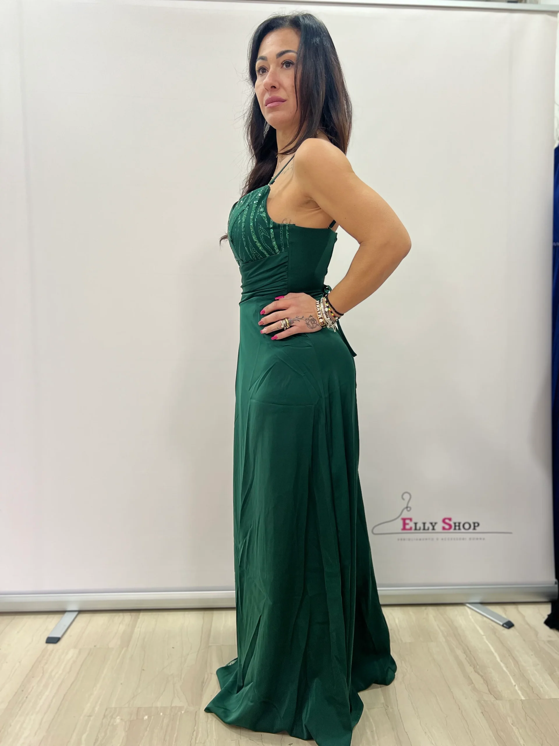 Abito lungo dallo stile sofisticato e scenografico, perfetto per cerimonie, eventi serali e occasioni eleganti. Il design combina un corpetto strutturato con scollatura a cuore e spalline sottili a una gonna fluida impreziosita da un pannello interno ricamato con motivo luminoso. Il drappeggio laterale avvolge delicatamente la silhouette, valorizzando il punto vita e creando un raffinato gioco di volumi. Il retro con chiusura a lacci regolabile garantisce una vestibilità personalizzata e femminile. Disponibile nell’intensa tonalità verde smeraldo, ideale per chi desidera un look elegante e ricercato. ART. 2742