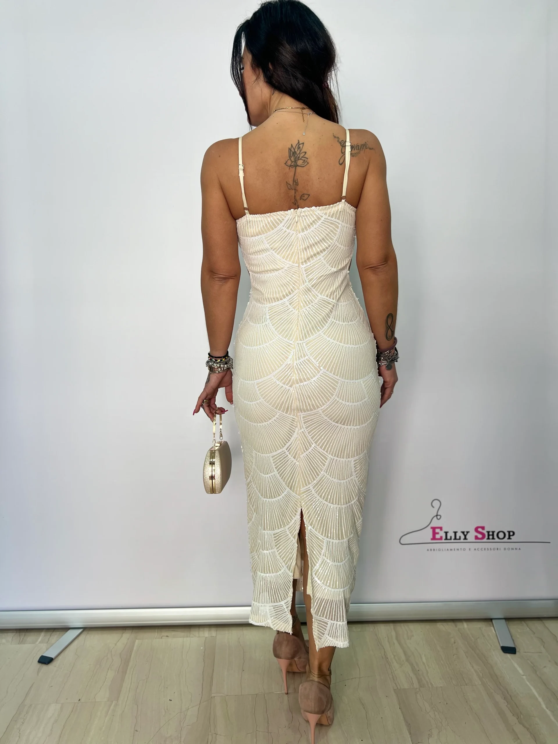 Un abito raffinato e femminile che valorizza la silhouette con eleganza. Questo modello midi presenta sottili spalline e una vestibilità aderente che segue delicatamente le linee del corpo, esaltando le forme con stile. Il design è impreziosito da una lavorazione decorativa con motivo geometrico a ventaglio e da sensuali dettagli cut out sui fianchi che donano un tocco moderno e sofisticato. Lo spacco posteriore garantisce comfort nei movimenti e aggiunge un dettaglio seducente. Perfetto per eventi eleganti, cerimonie, serate speciali o occasioni glamour. Disponibile in una delicata tonalità panna che illumina l’intero look.