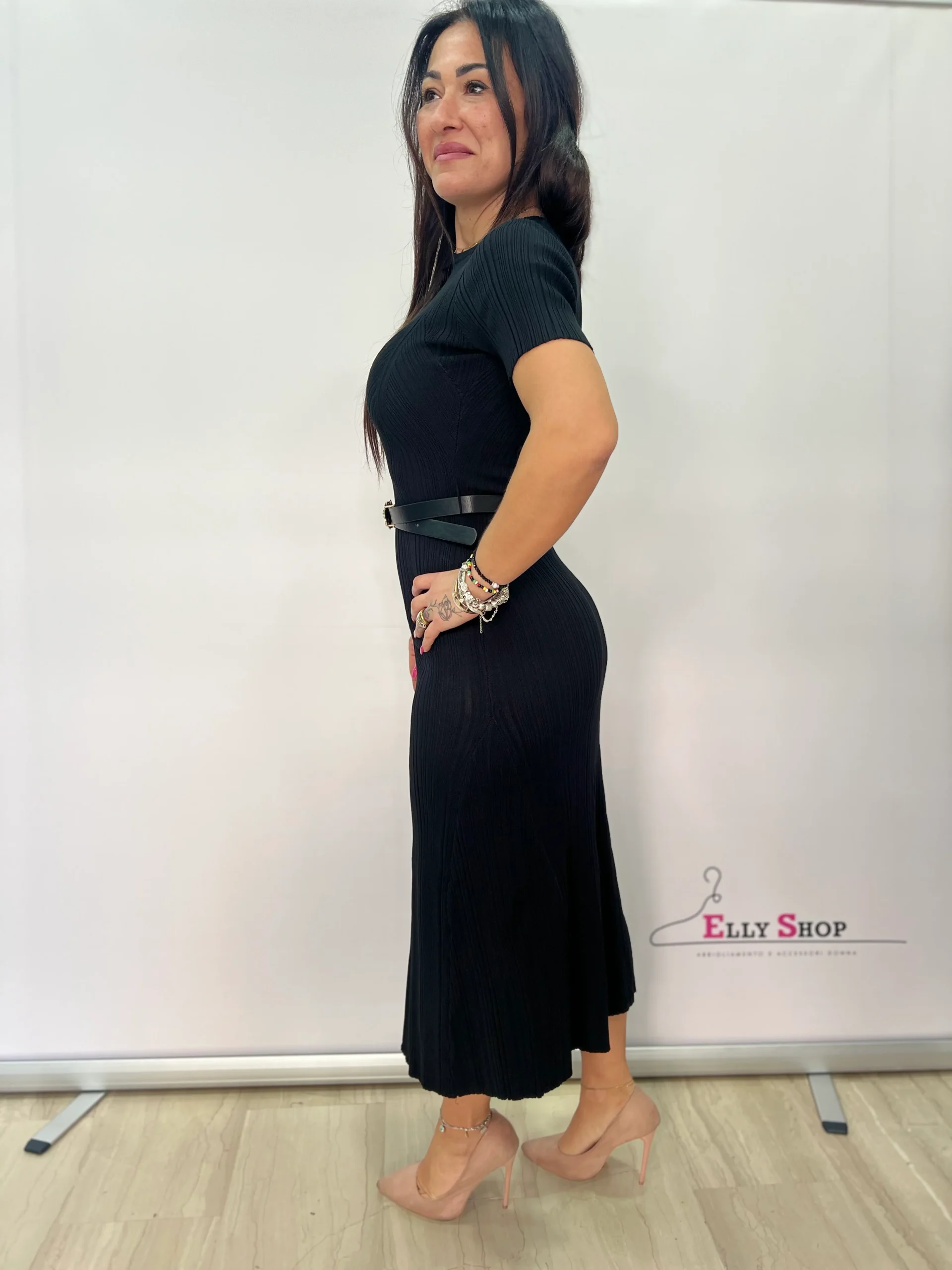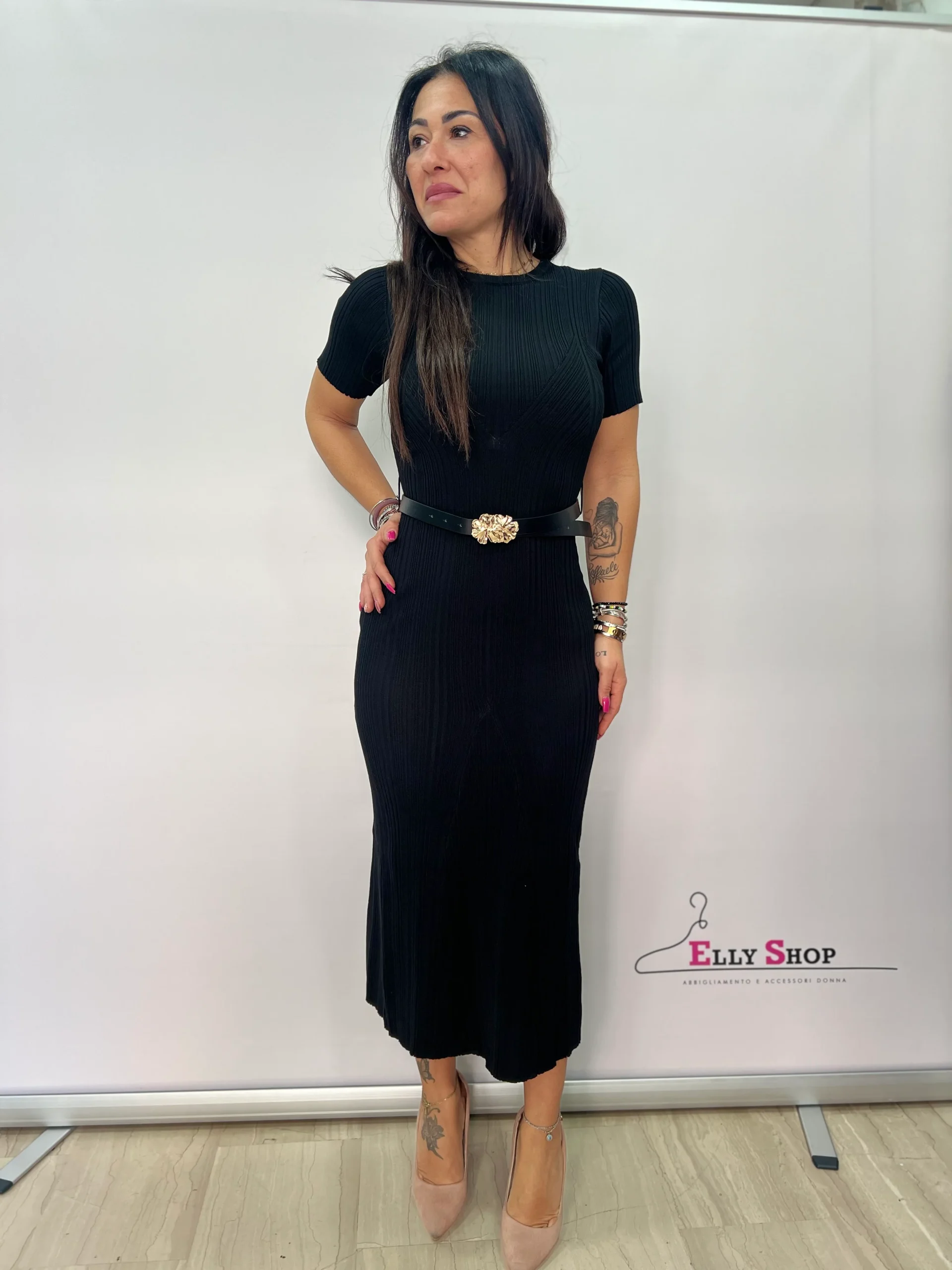 Abito midi elegante e versatile, perfetto per valorizzare la silhouette con semplicità e stile. Il tessuto a costine avvolge delicatamente le forme garantendo una vestibilità confortevole e femminile, mentre la linea aderente slancia la figura. Le maniche corte e il design minimal lo rendono ideale per creare look raffinati ma pratici, perfetti sia per il giorno che per la sera. La cintura con fibbia dorata inclusa in foto definisce il punto vita e aggiunge un tocco di eleganza al capo. Un abito essenziale e chic, facilmente abbinabile con tacchi, sandali o sneakers per outfit sempre curati.
