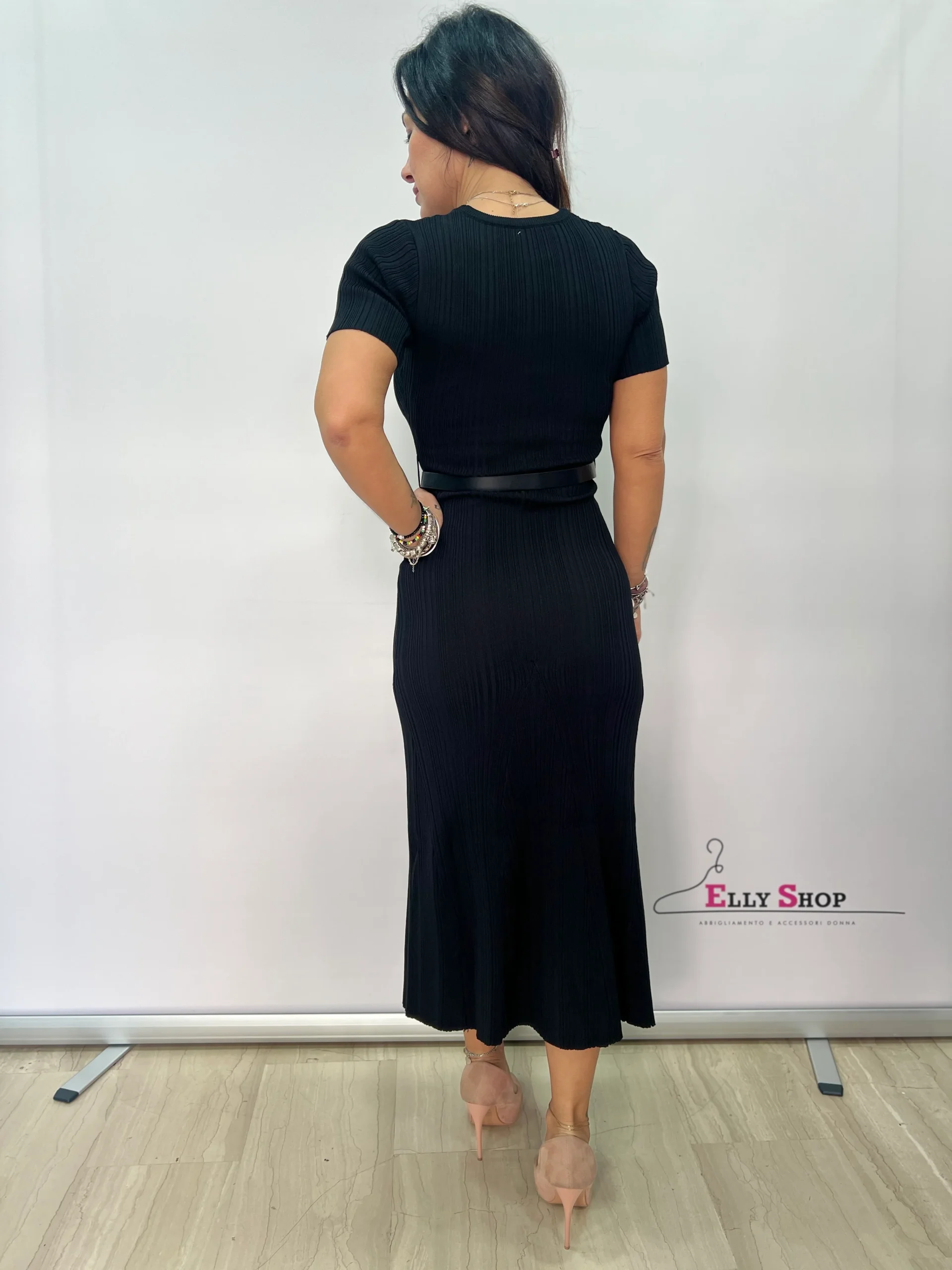 Abito midi nero a costine con cintura elegante