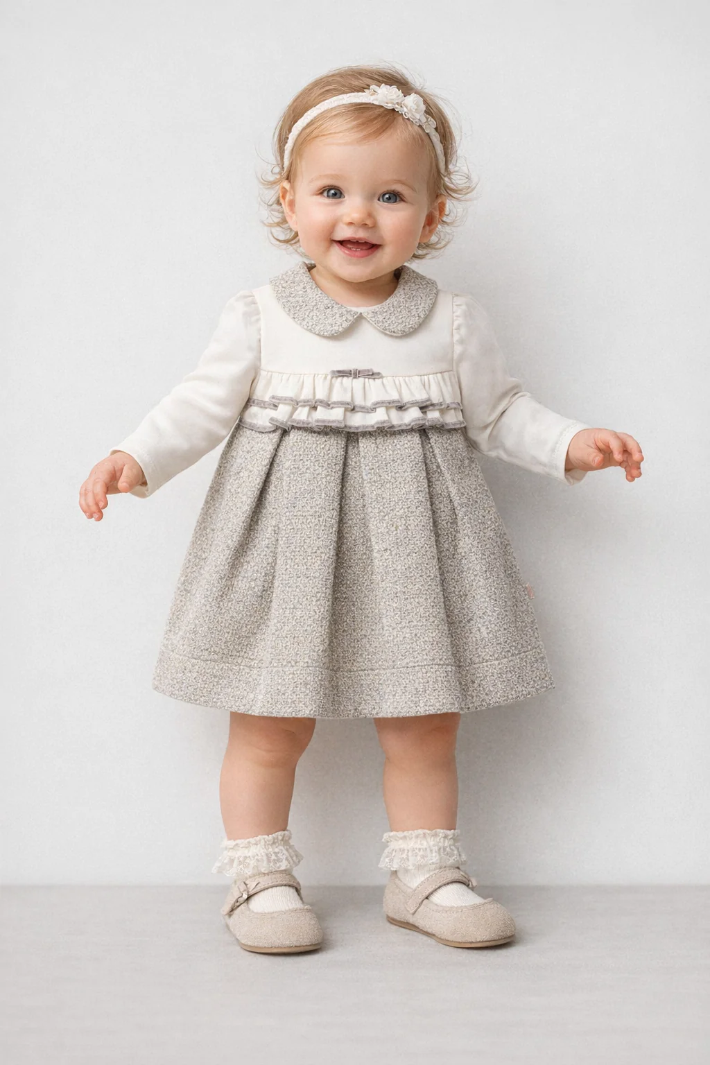 Raffinato abito per neonata dallo stile classico e senza tempo, perfetto per occasioni speciali e momenti importanti. Il design unisce eleganza e comfort, con una cura attenta dei dettagli e dei materiali. La parte superiore รจ realizzata in tessuto liscio color avorio, con colletto arrotondato in tessuto coordinato che incornicia delicatamente il viso. Il corpetto […]