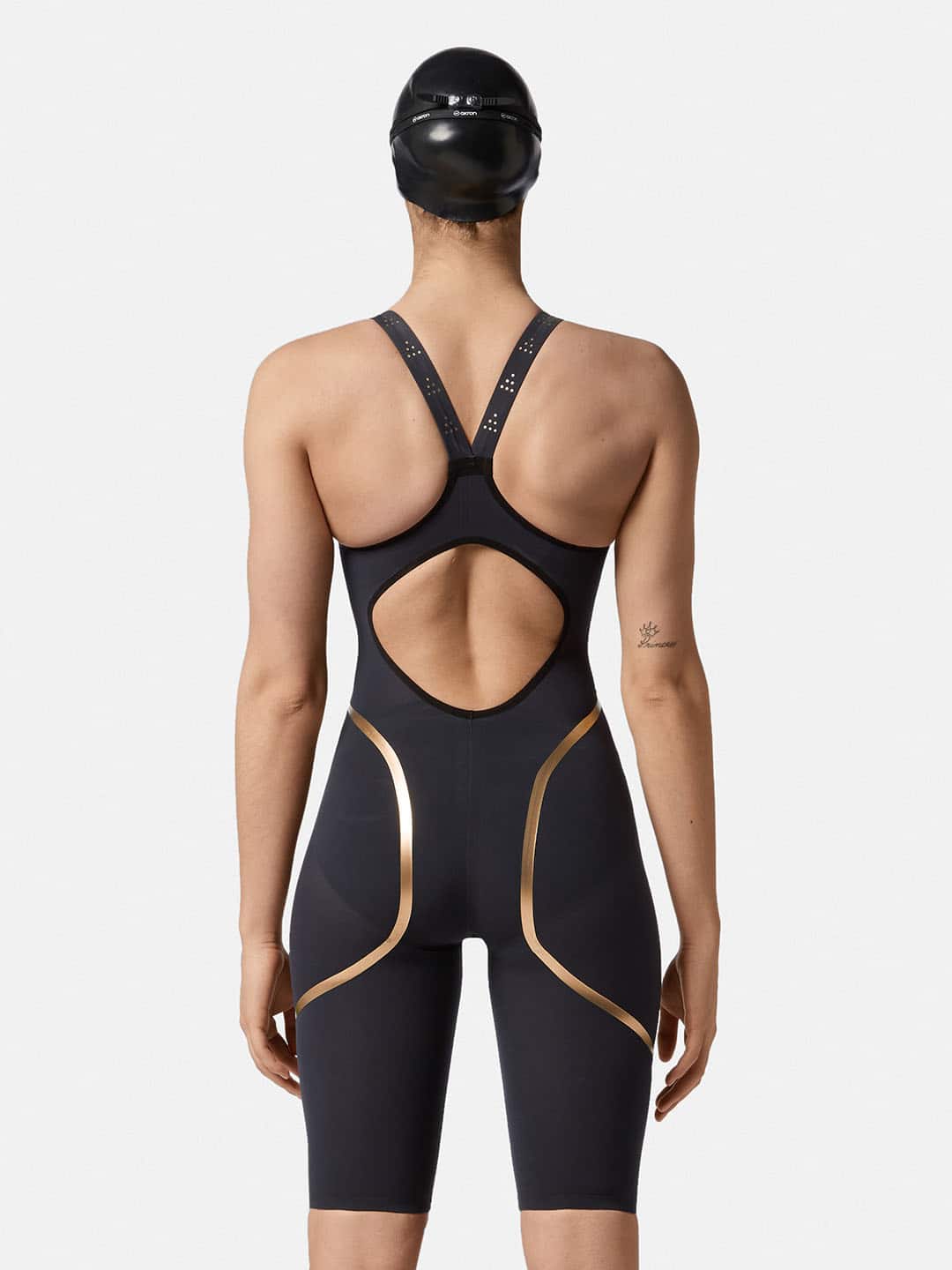 AKRON VENOM HERO donna OPEN Dark Blue Bronze progettato per la velocità, rappresenterà la linea “Premium” di AKRON. La costruzione ergonomica piatta della saldature aiuta a rigenerare più rapidamente i gruppi muscolari chiave e raddoppiare gli strati compressivi. Il design del tape esterno ha lo scopo di migliorare la turbolenza idrodinamica, ridurre l’ingresso di acqua e sviluppare lo scivolamento. Il taping speculare a doppia C offre la sensazione di sollevare il bacino durante il nuoto e un’ampia gamma di movimenti.