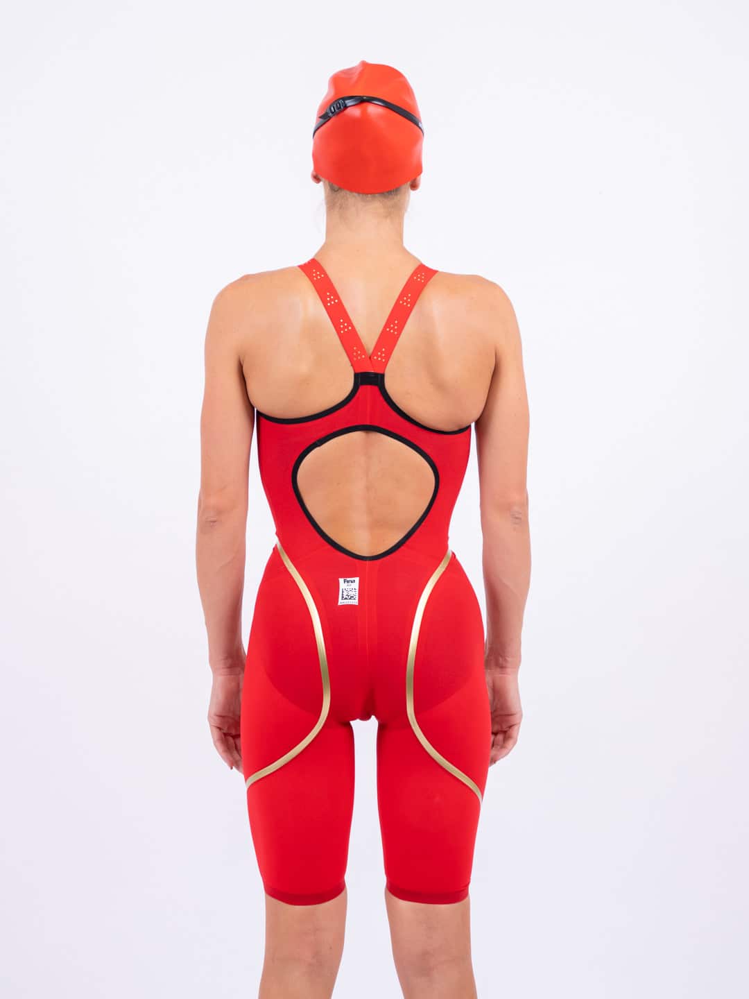 AKRON VENOM HERO donna OPEN Racing Red progettato per la velocità, rappresenterà la linea “Premium” di AKRON. La costruzione ergonomica piatta della saldature aiuta a rigenerare più rapidamente i gruppi muscolari chiave e raddoppiare gli strati compressivi. Il design del tape esterno ha lo scopo di migliorare la turbolenza idrodinamica, ridurre l’ingresso di acqua e sviluppare lo scivolamento. Il taping speculare a doppia C offre la sensazione di sollevare il bacino durante il nuoto e un’ampia gamma di movimenti.