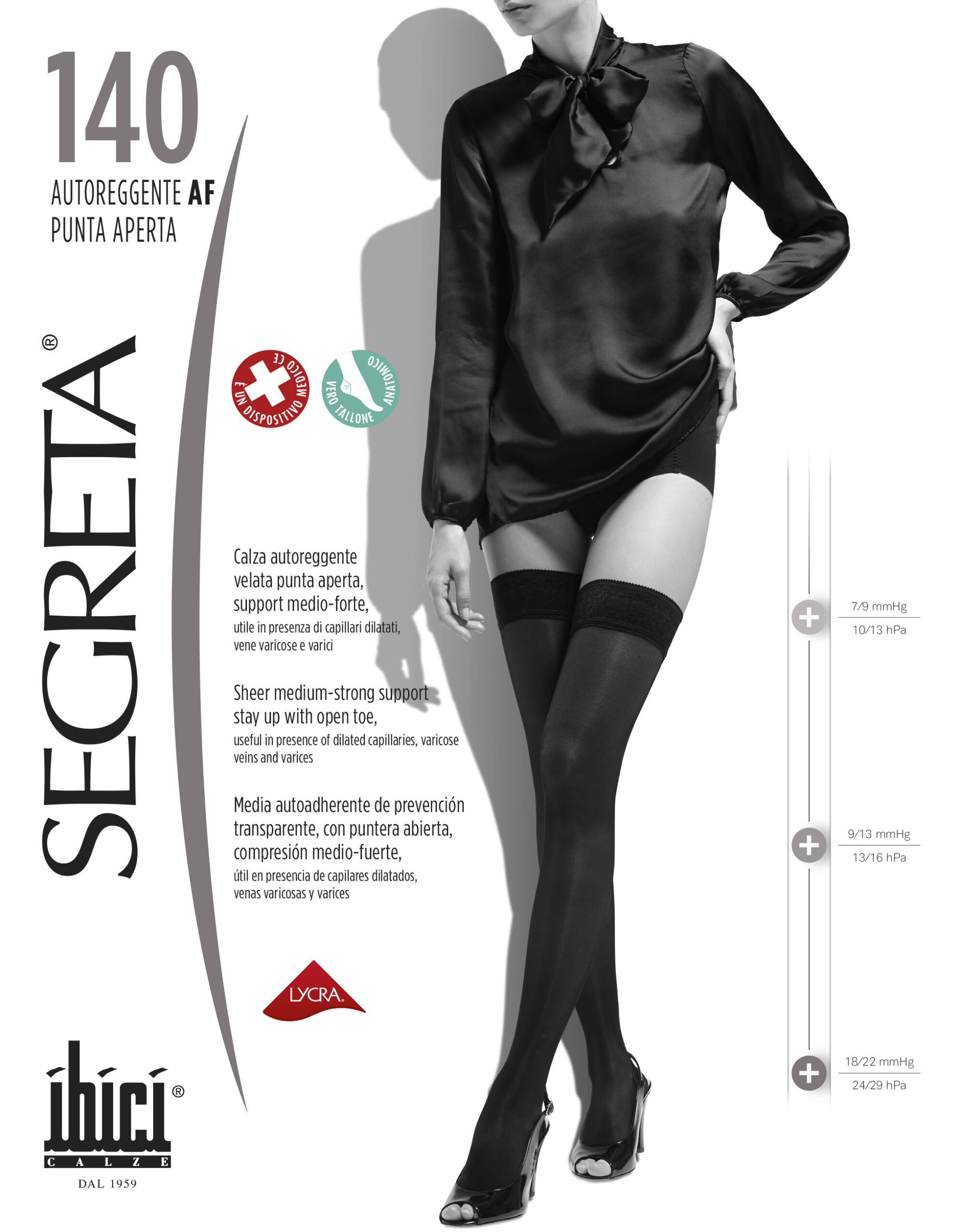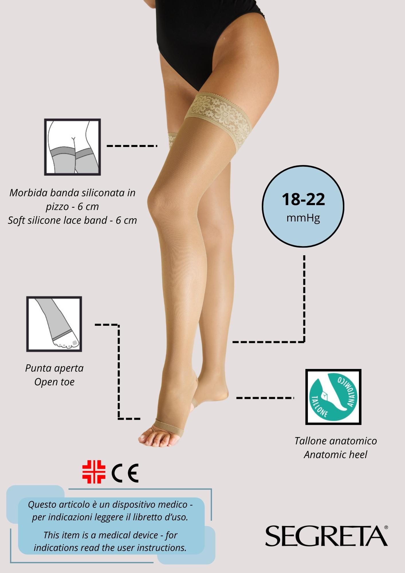 Calza autoreggente 140 den con punta aperta, support medio-forte, velato, maglia a rete. Morbida banda siliconata in pizzo, alt. 6 cm. Con vero tallone anatomico. Utile in presenza di capillari dilatati, vene varicose e varici.