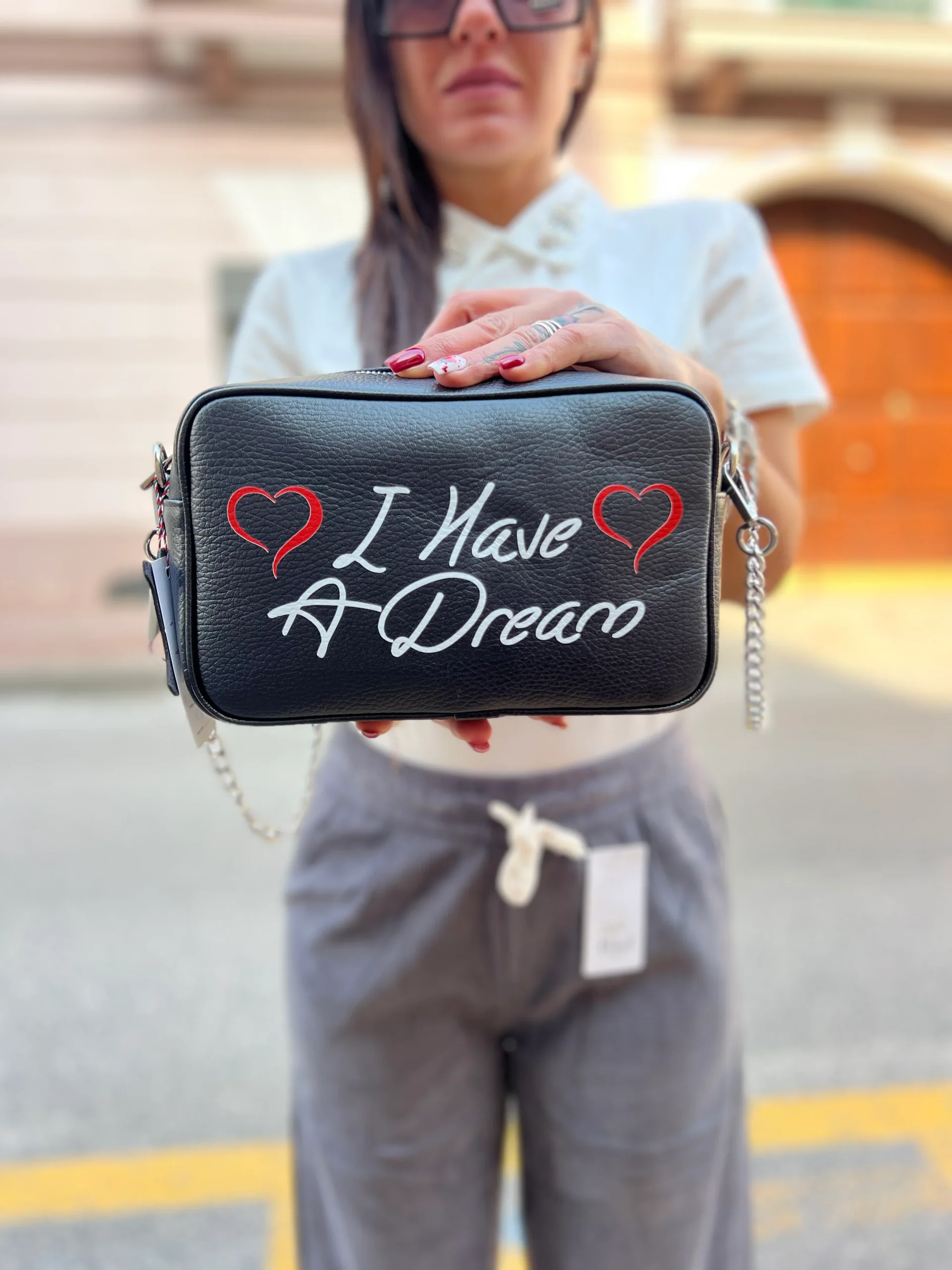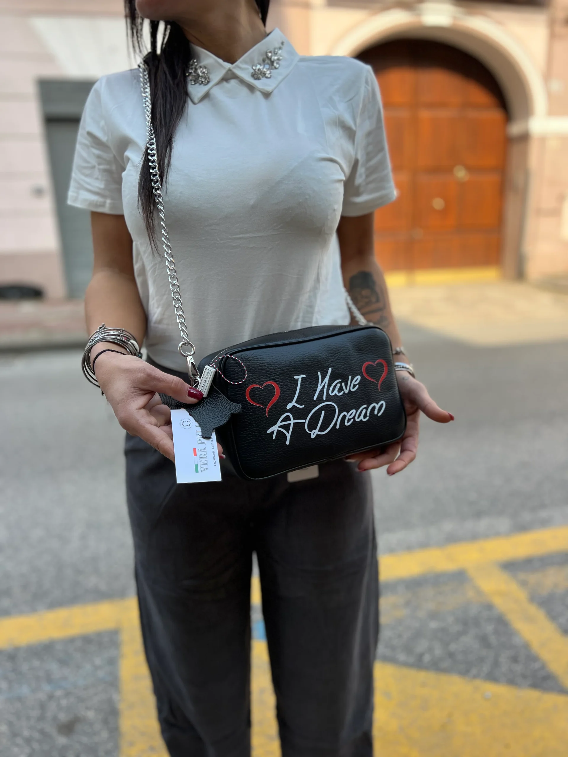 La Borsa piccola “I have a dream” รจ un’elegante borsa in vera pelle, prodotta in Italia. Con la sua scritta incisa sulla superficie, questa borsa non solo offre un look sofisticato, ma anche un’ispirazione per raggiungere i propri sogni. Porta con te questa borsa di alta qualitร e fai una dichiarazione di stile con un messaggio positivo.