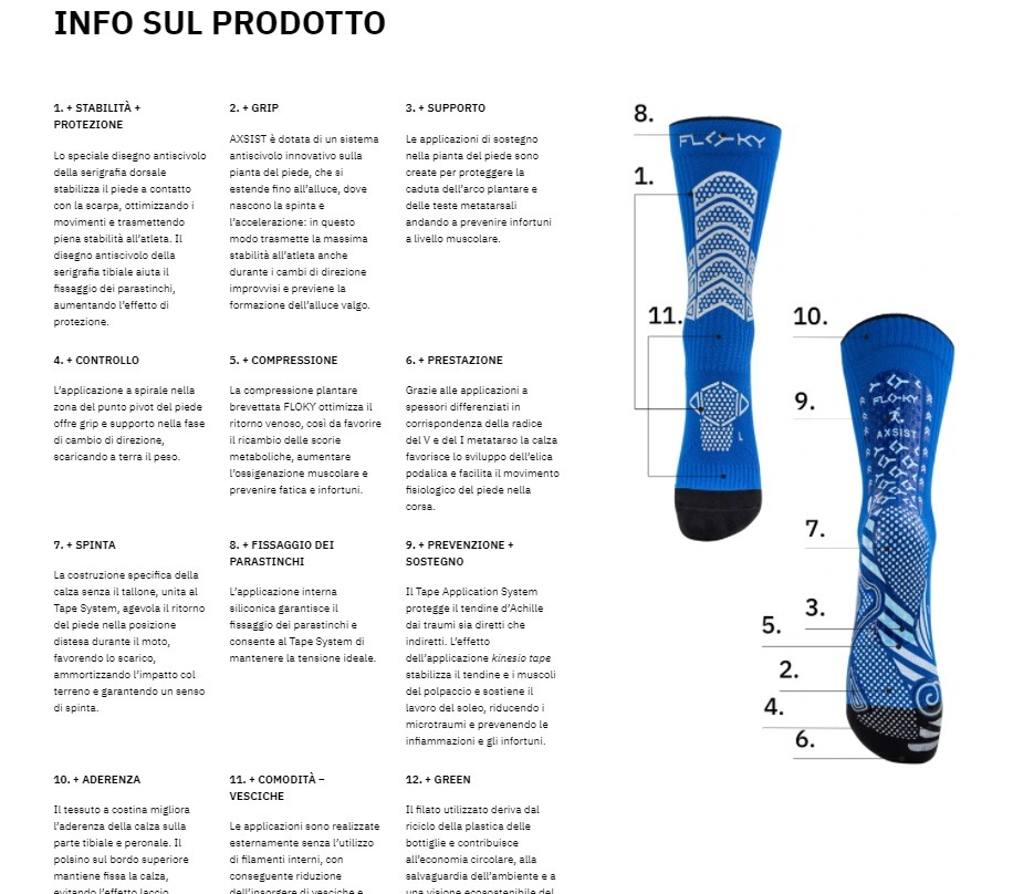 Calza calcio AXSIST FLOKY è la prima calza biomeccanica studiata e progettata per il calcio. Grazie alle applicazioni biomeccaniche e al lavoro di compressione localizzata, trasmette stabilità al piede durante la corsa e durante i cambi di direzione, aiutando al tempo stesso il fissaggio dei parastinchi alla gamba. Previene l’insorgere di infortuni e infiammazioni e velocizza il recupero post allenamento e post gara.