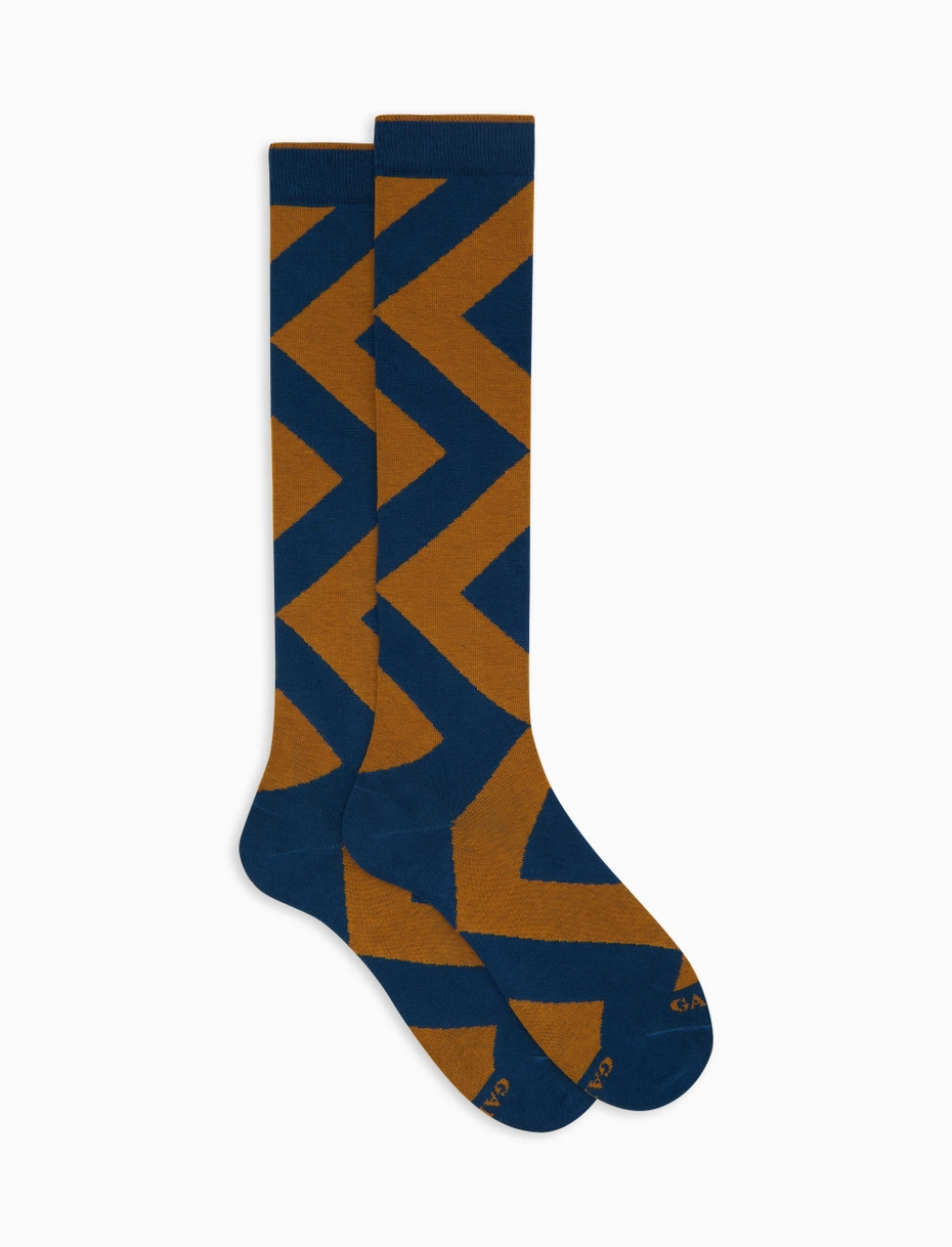 Calze lunghe da uomo realizzate in cotone di alta qualità, caratterizzate da una sofisticata fantasia a maxi rombo nei toni del blu.