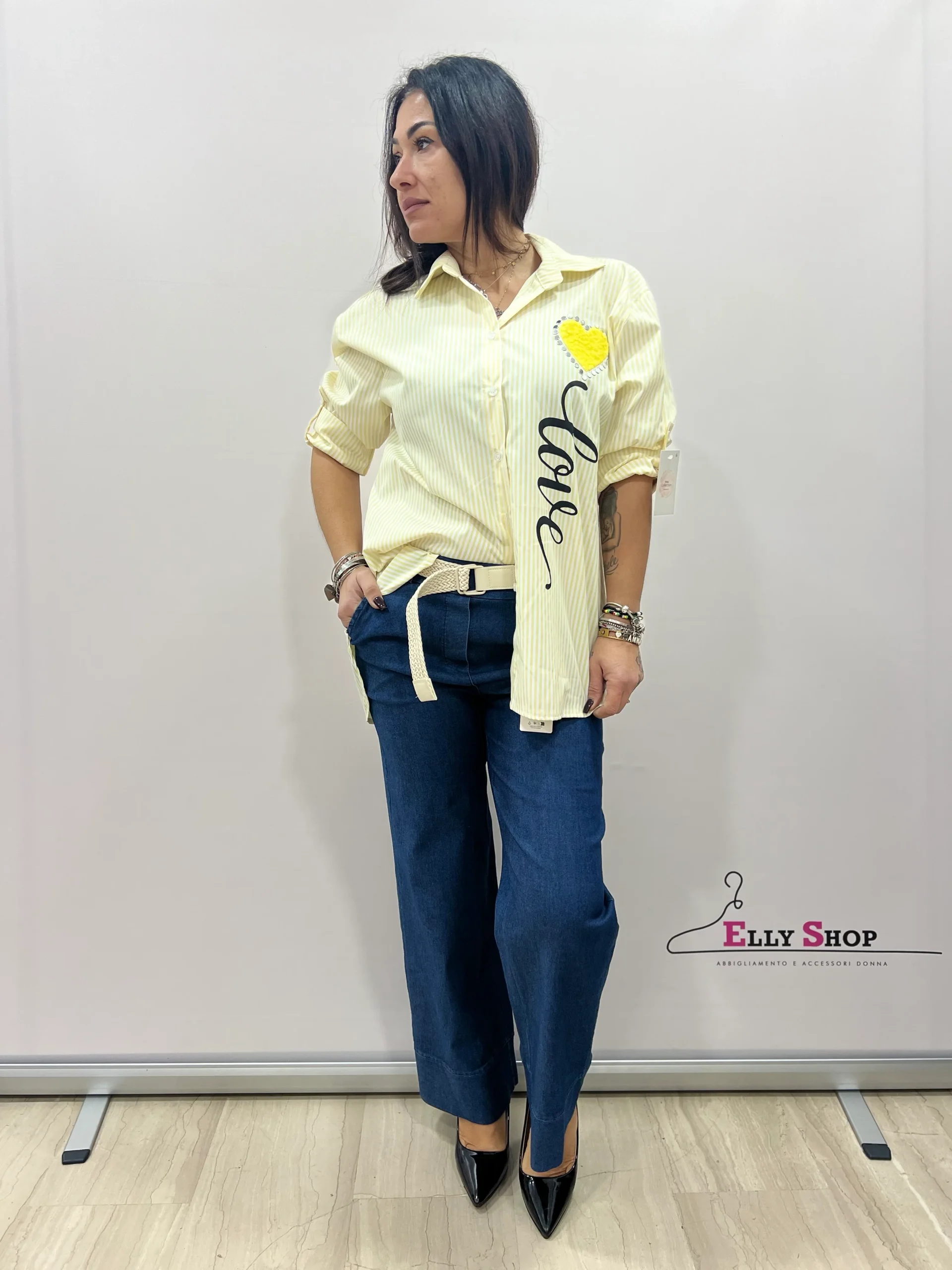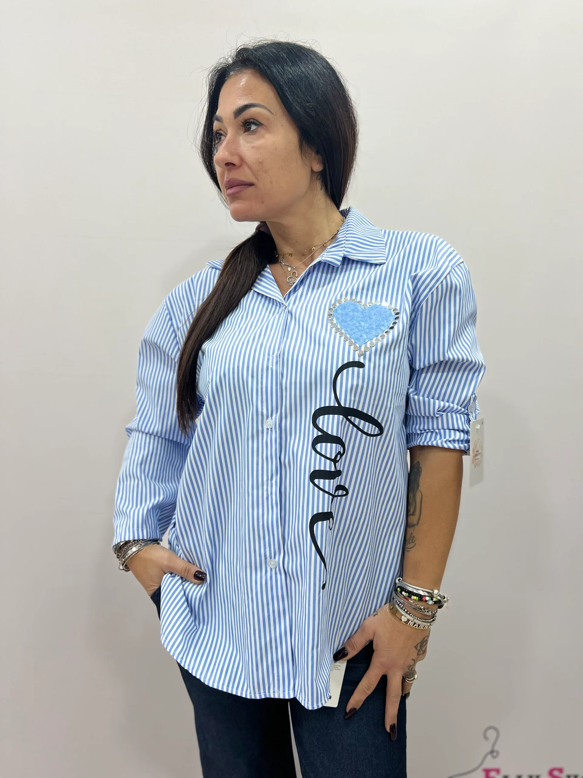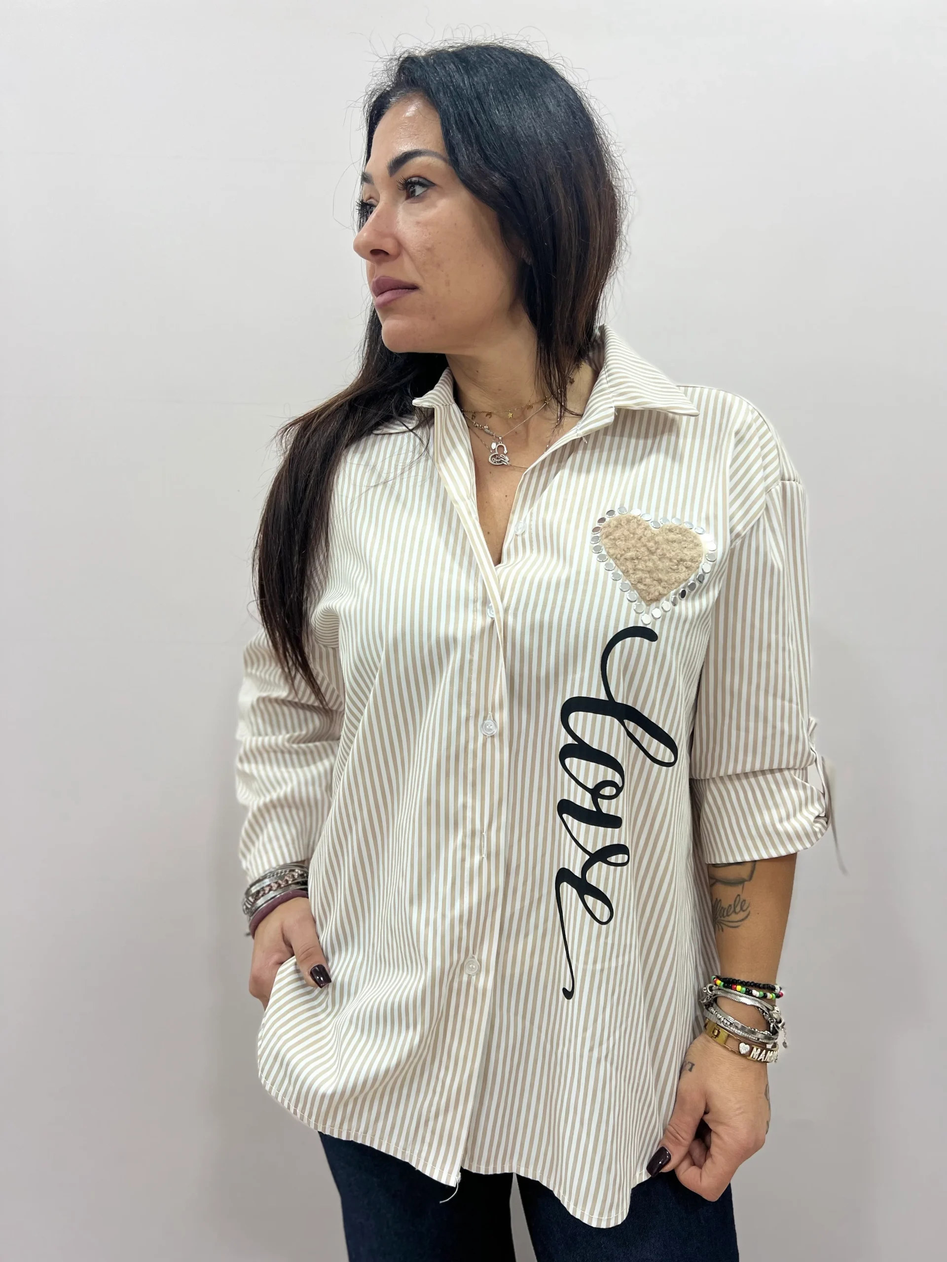 Camicia donna dallo stile casual chic, caratterizzata da una raffinata fantasia a righe verticali che slancia la figura. Il design è impreziosito dalla stampa laterale “Love” e dall’applicazione a cuore sul petto, che dona un tocco femminile e originale al capo. La vestibilità morbida la rende confortevole e versatile, perfetta da indossare sia aperta che chiusa, abbinata a jeans o pantaloni sartoriali. Ideale per il tempo libero, l’ufficio informale o per creare look curati ma rilassati. Disponibile in diverse varianti colore.