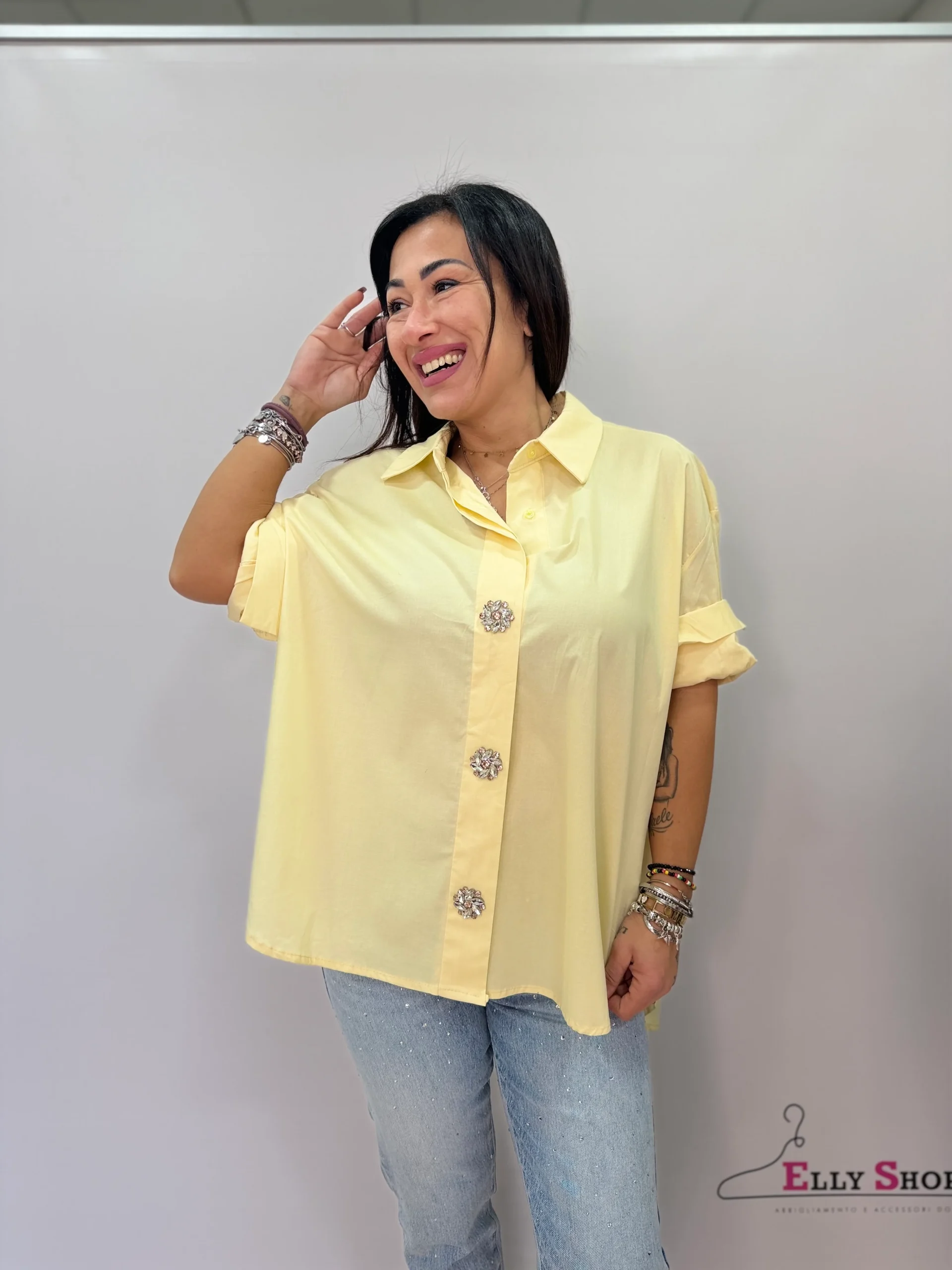 Camicia donna dallo stile elegante e contemporaneo, caratterizzata da una vestibilità oversize che garantisce comfort e libertà di movimento. Il design essenziale è impreziosito da raffinati bottoni gioiello frontali, che donano luminosità e un tocco glamour al capo. Perfetta per look casual chic, da indossare con jeans o pantaloni sartoriali, si adatta facilmente sia ad outfit da giorno che a occasioni serali più curate. Disponibile in delicate tonalità pastello e neutre, ideali per ogni stagione.