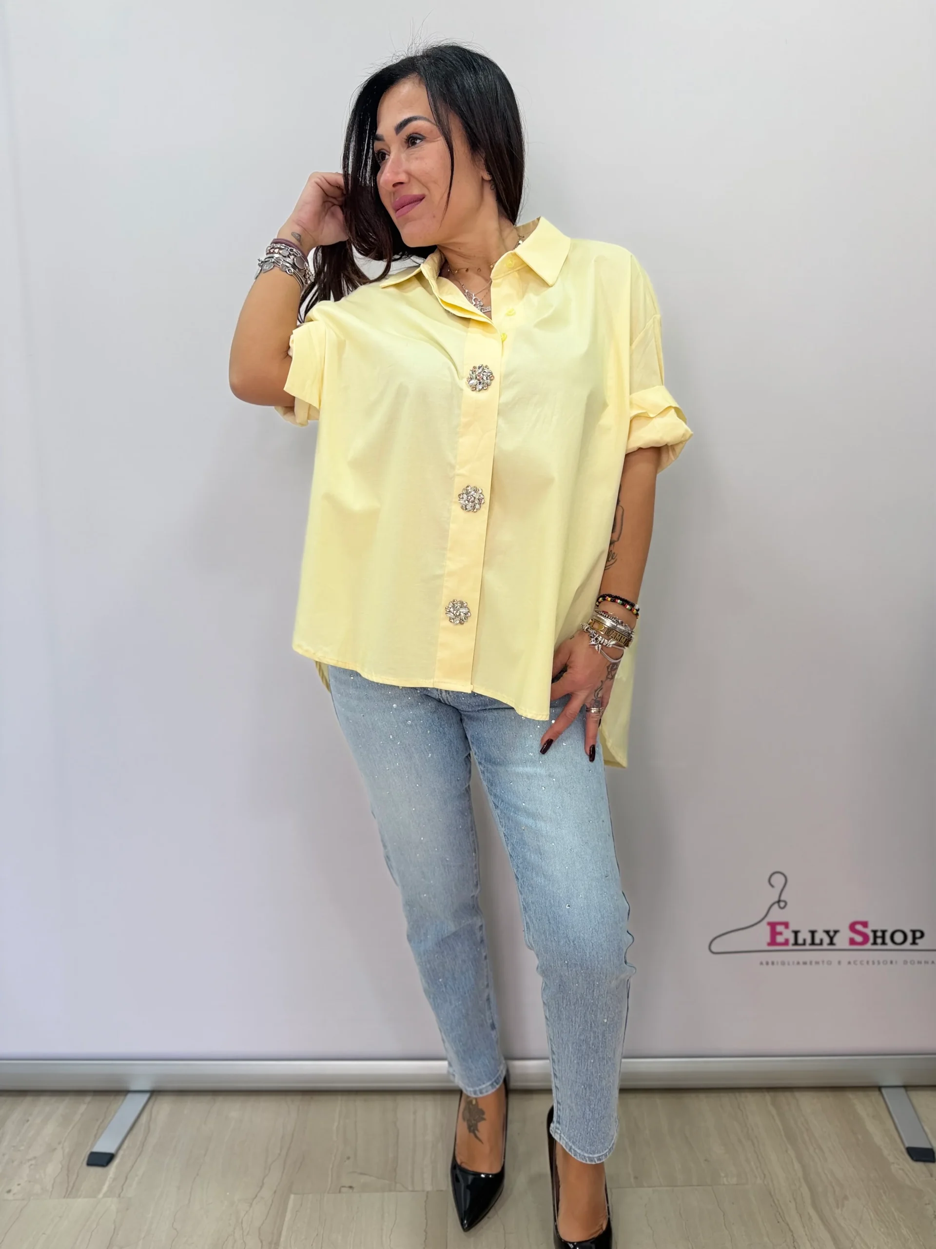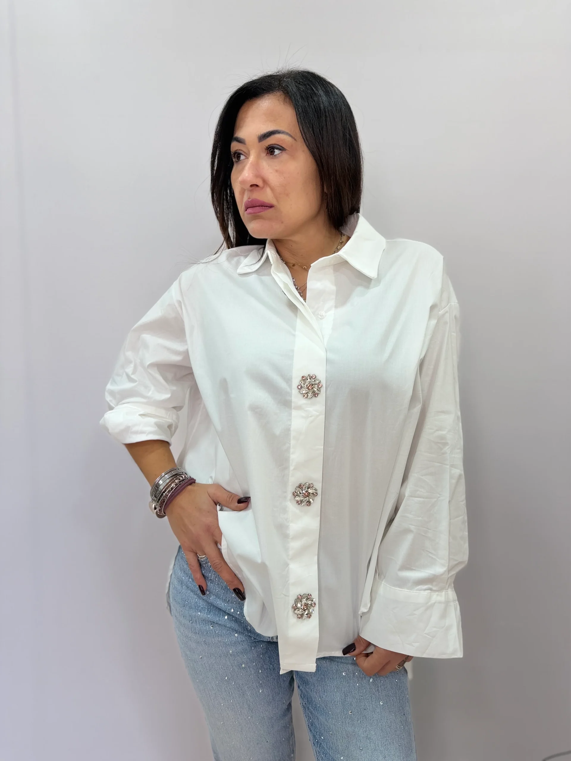 Camicia donna oversize con bottoni gioiello