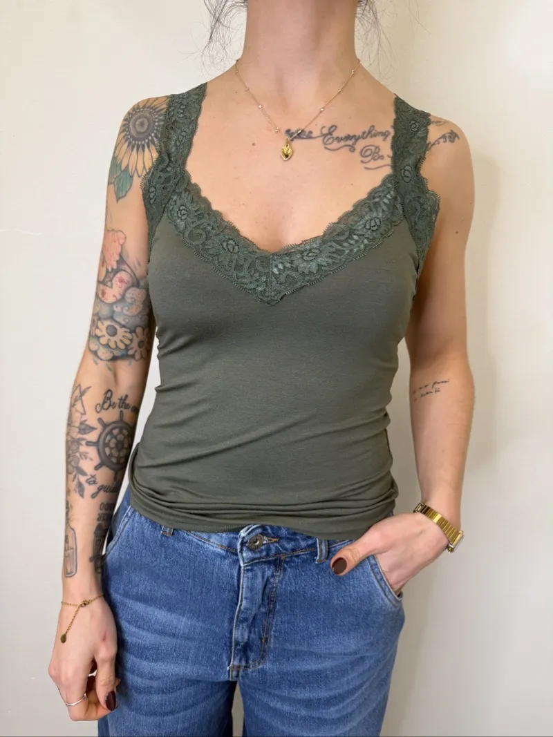 Canotta Elasticizzata Scollo V con Pizzo. TU La modella è alta 170cm e veste la taglia unica.