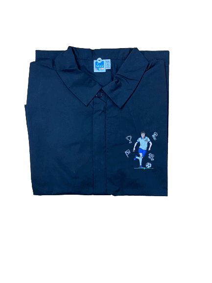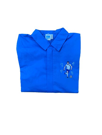 Casacca bambino elementari con giocatore di Calcio, con cerniera e colletto NON incluso. L’ecogrembiulino oggi è ancora più sicuro!