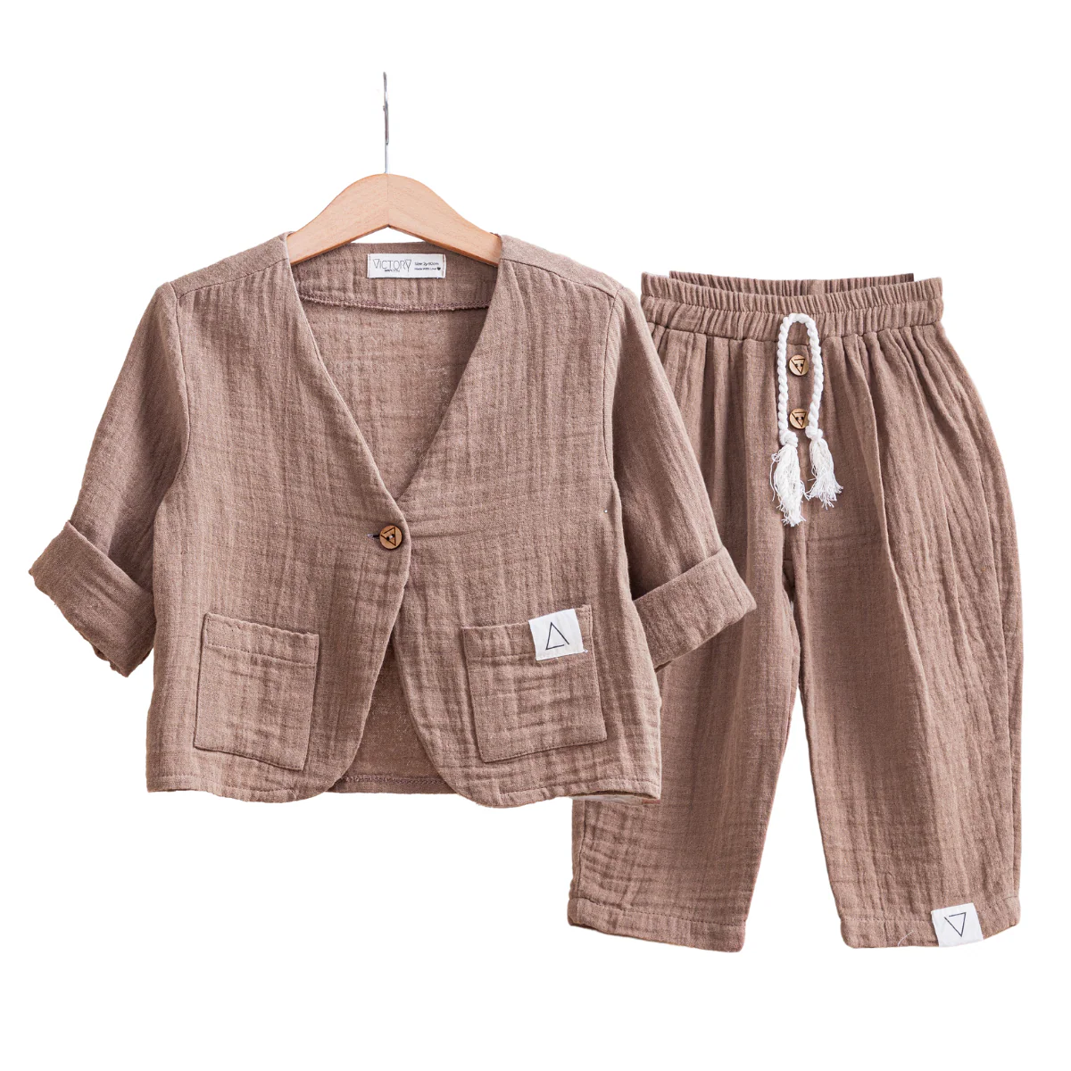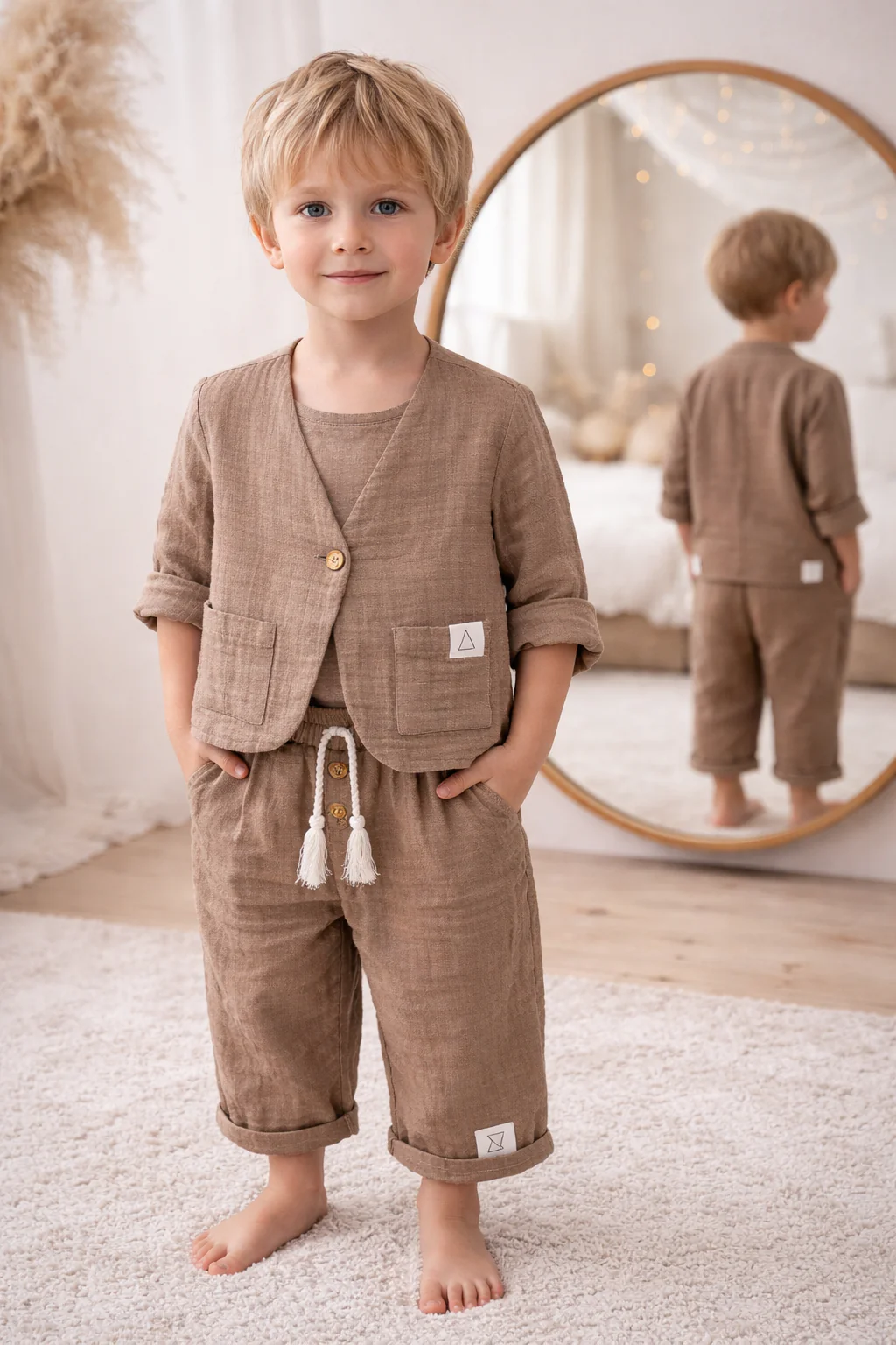 Completo due pezzi per bambino realizzato in mussola di cotone morbida e traspirante, dal colore marrone naturale caldo, identico su giacca e pantalone. Un capo essenziale dallo stile pulito e contemporaneo, pensato per unire comfort, eleganza e libertร di movimento.
