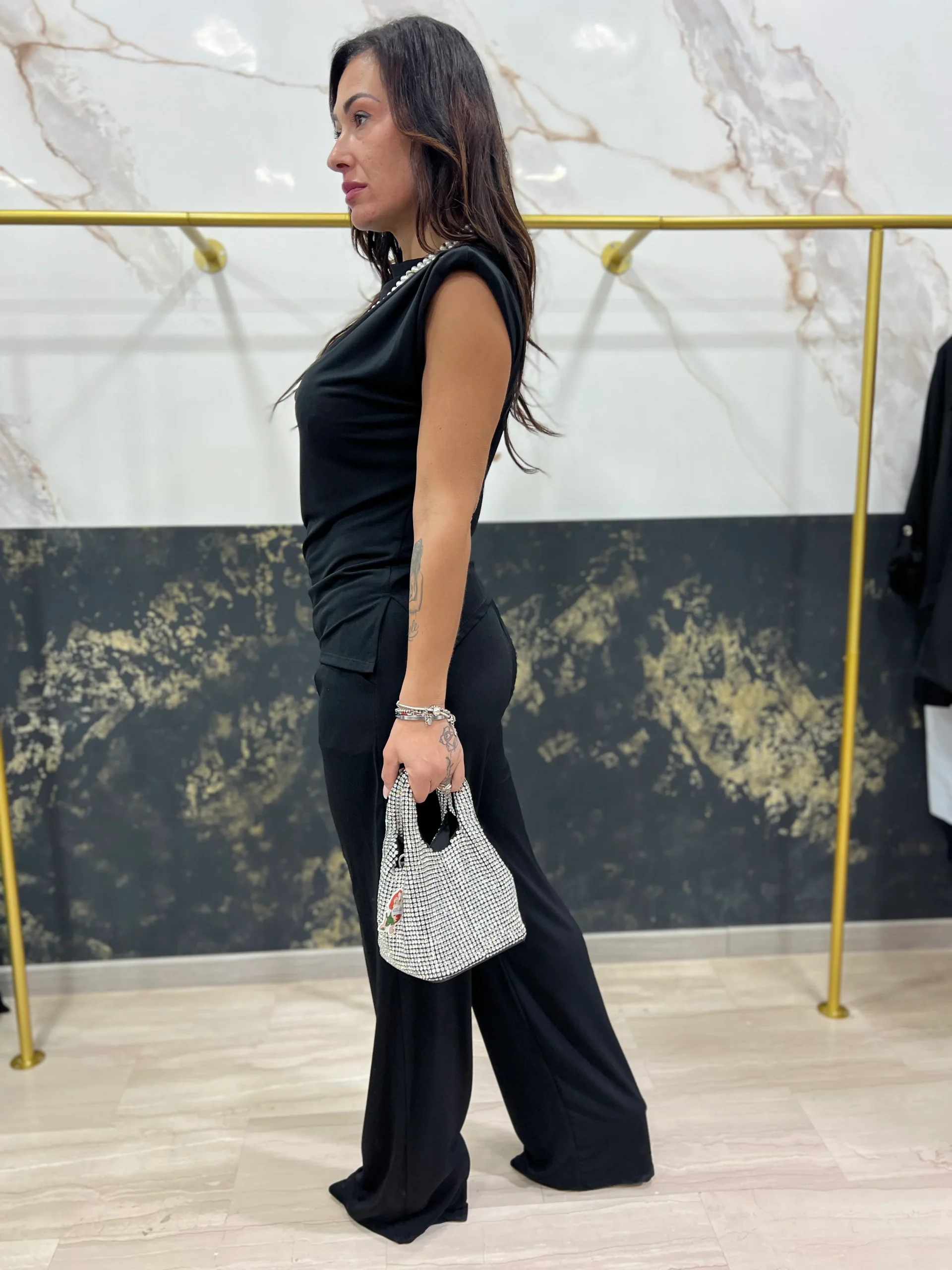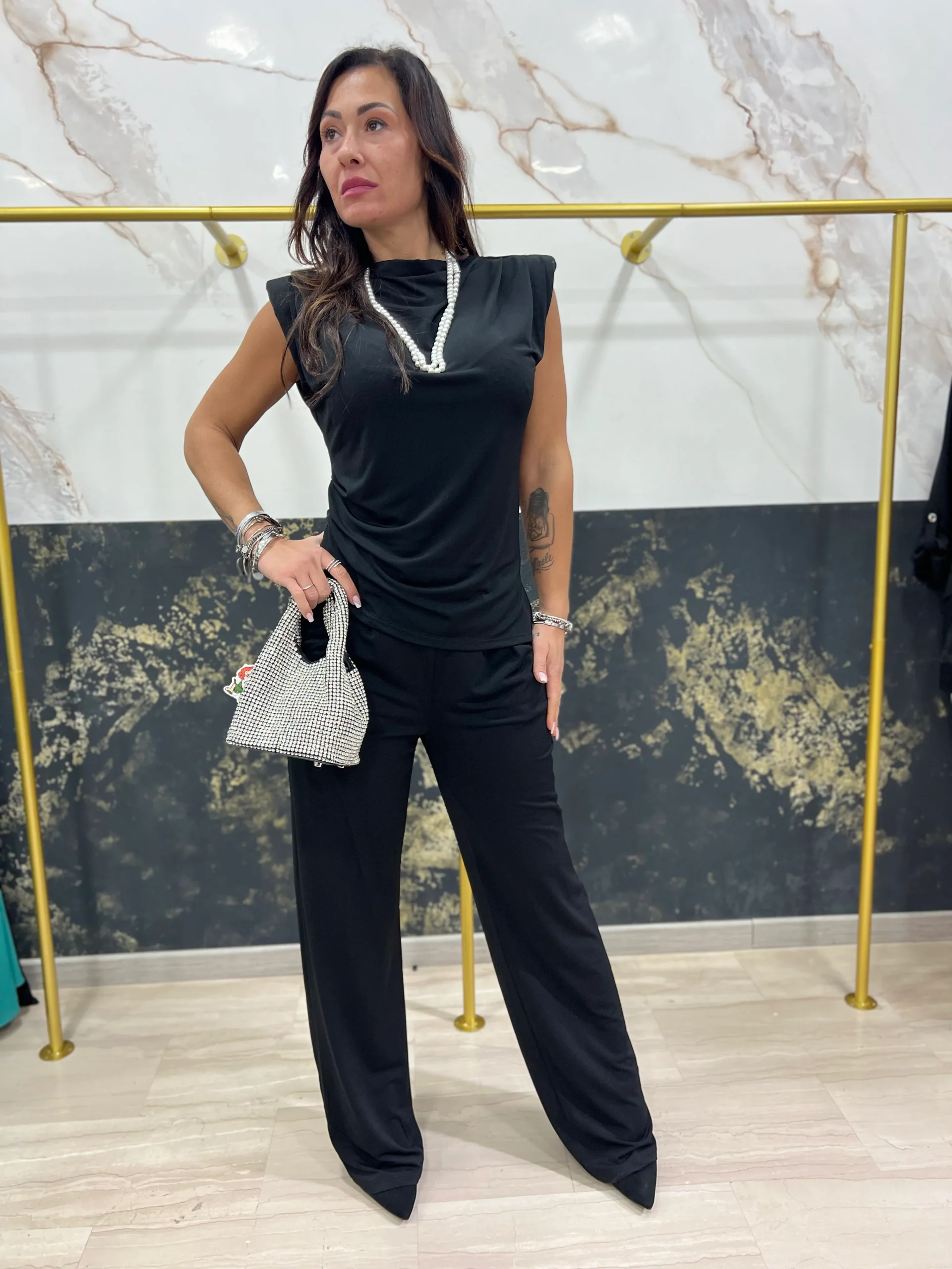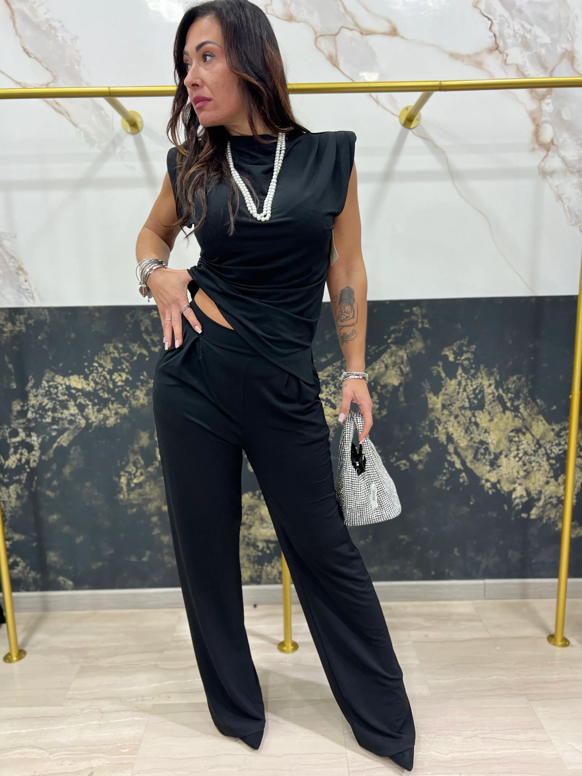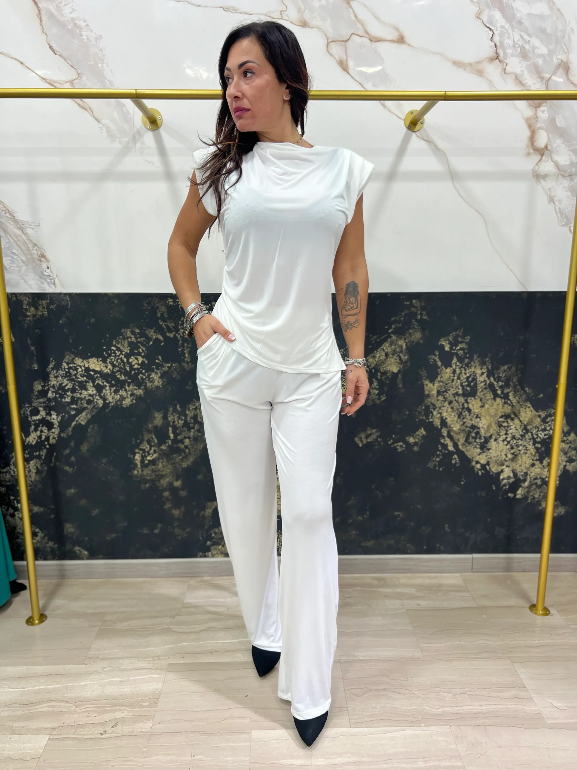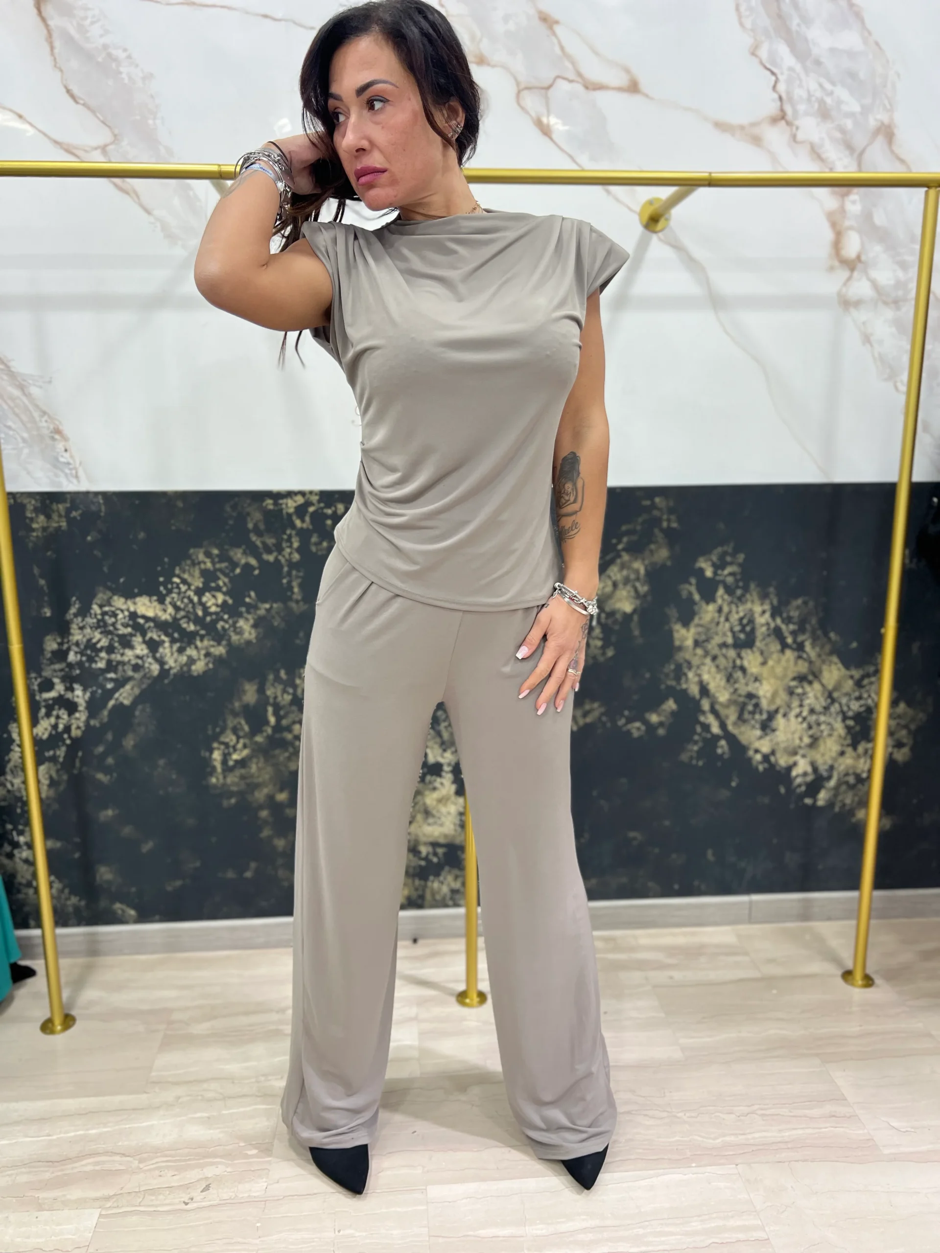 LA RAGAZZA IN FOTO VESTE TAGLIA M. Questo completo Belen รจ perfetto per chi cerca un look elegante e confortevole. Il pantalone comodo con elastico garantisce una vestibilitร perfetta, mentre la maglia con spalline e spalla larga aggiunge un tocco di stile. Indossalo per un’occasione speciale o per un outfit casual ma alla moda.