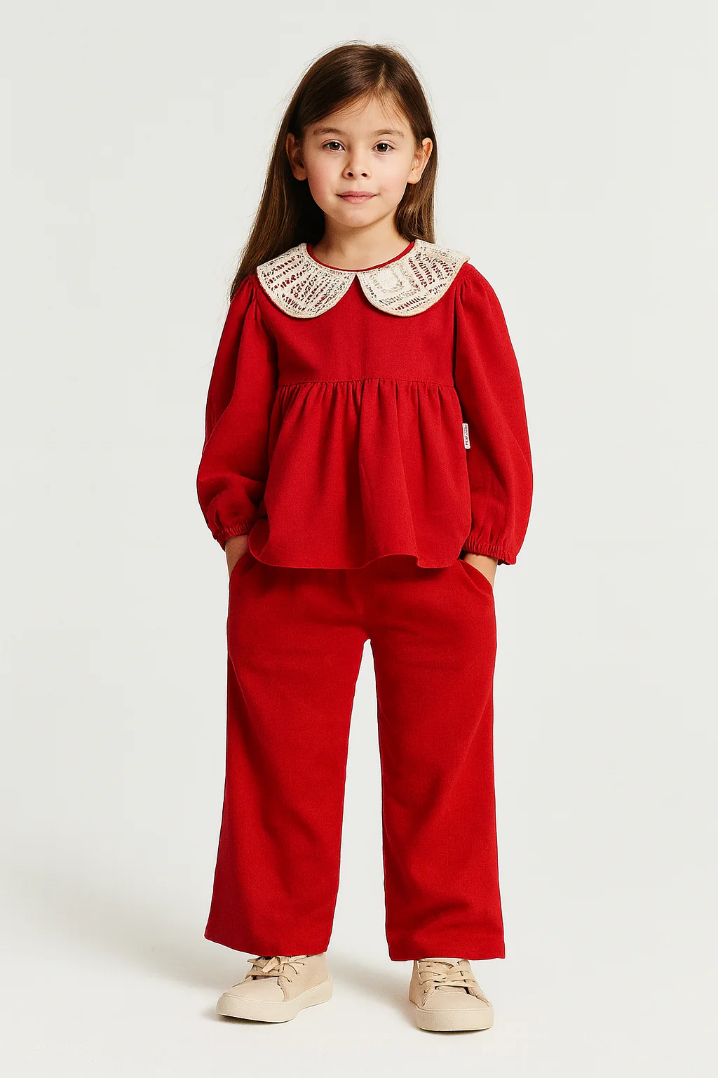 Un set realizzato in morbido cotone, composto da: โขBlusa a maniche lunghe con elegante colletto in pizzo crochet โขPantalone ampio con elastico in vita, pratico e confortevole per i movimenti quotidiani. Perfetto per cerimonie, feste o semplicemente per un look romantico e chic anche tutti i giorni.