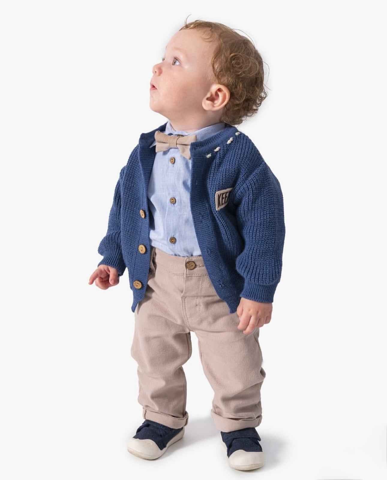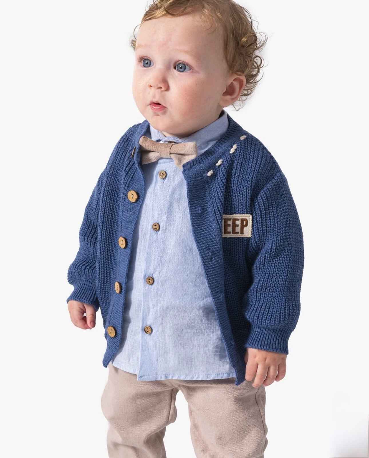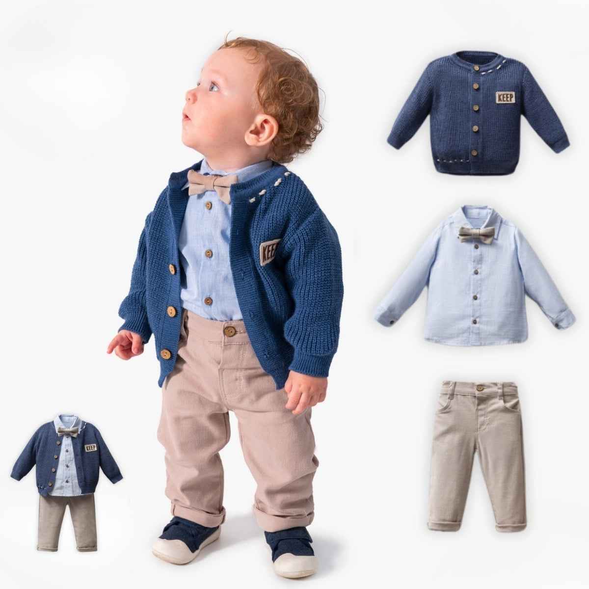 Completo bimbo composto da camicia in cotone con papillon coordinato al pantalone, cardigan in lana e pantalone. โ๏ธ Camicia celeste con papillon coordinato al pantalone โ๏ธ Cardigan blu con bottoni in legno e patch ricamata โ๏ธ Pantaloni beige dal taglio moderno