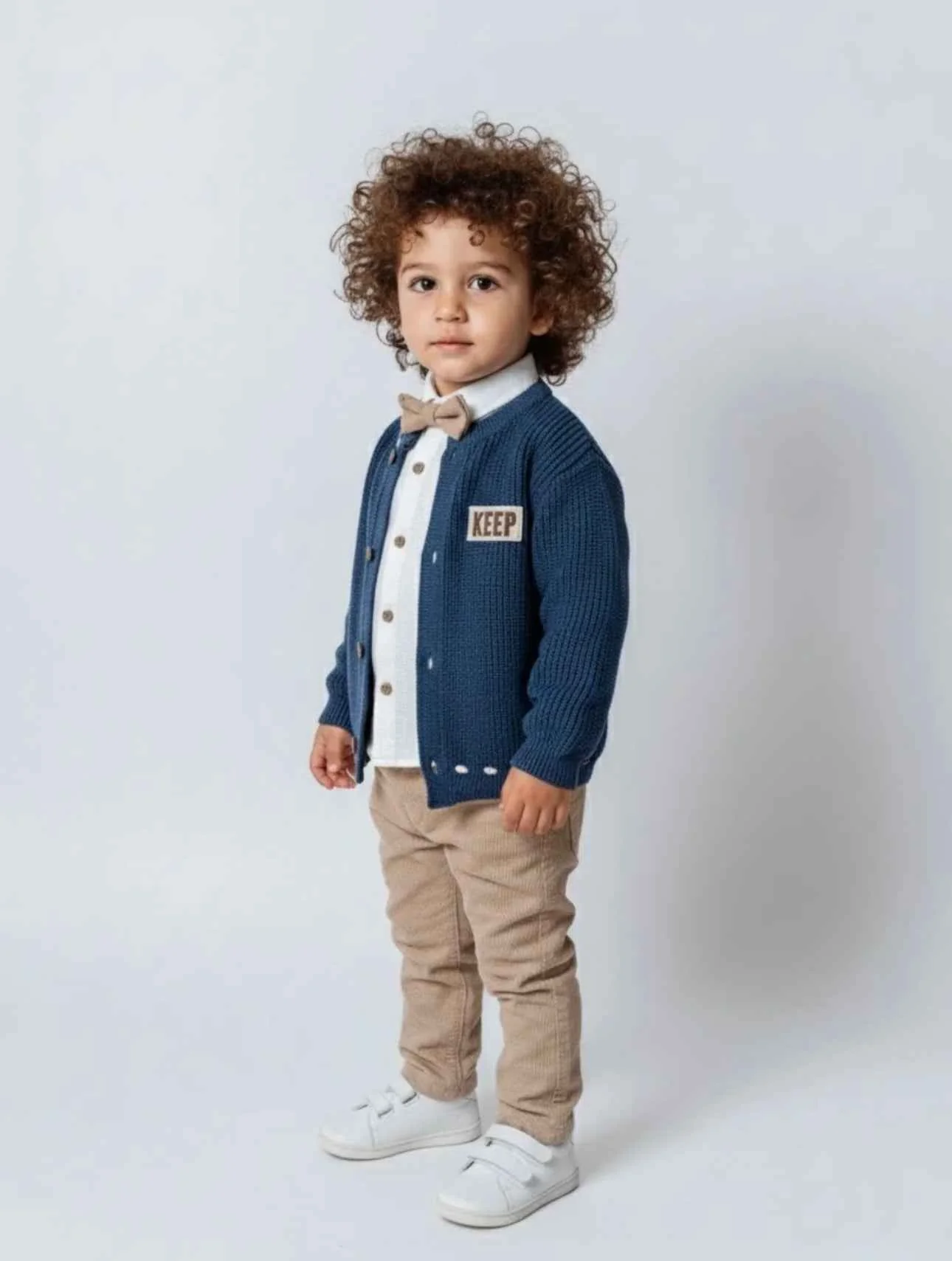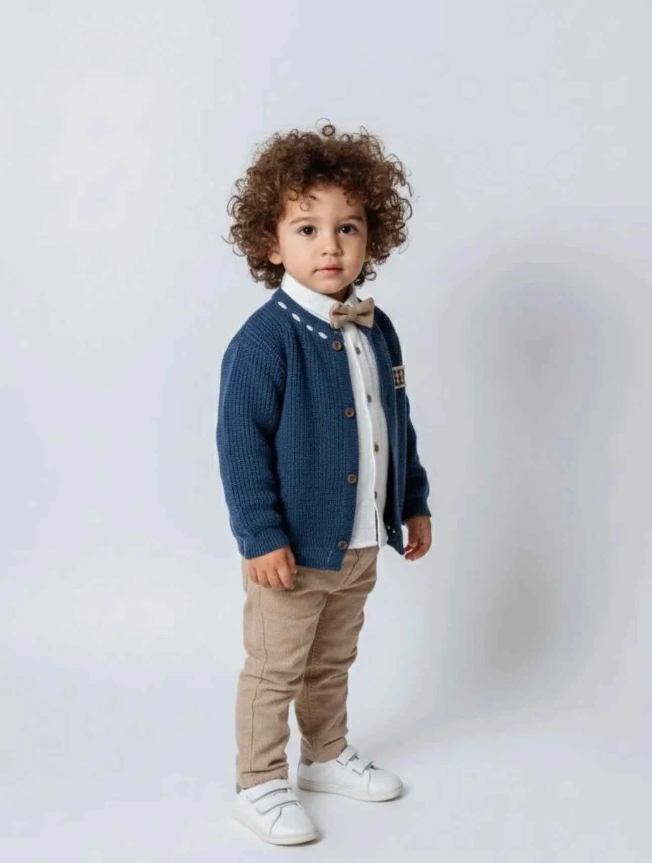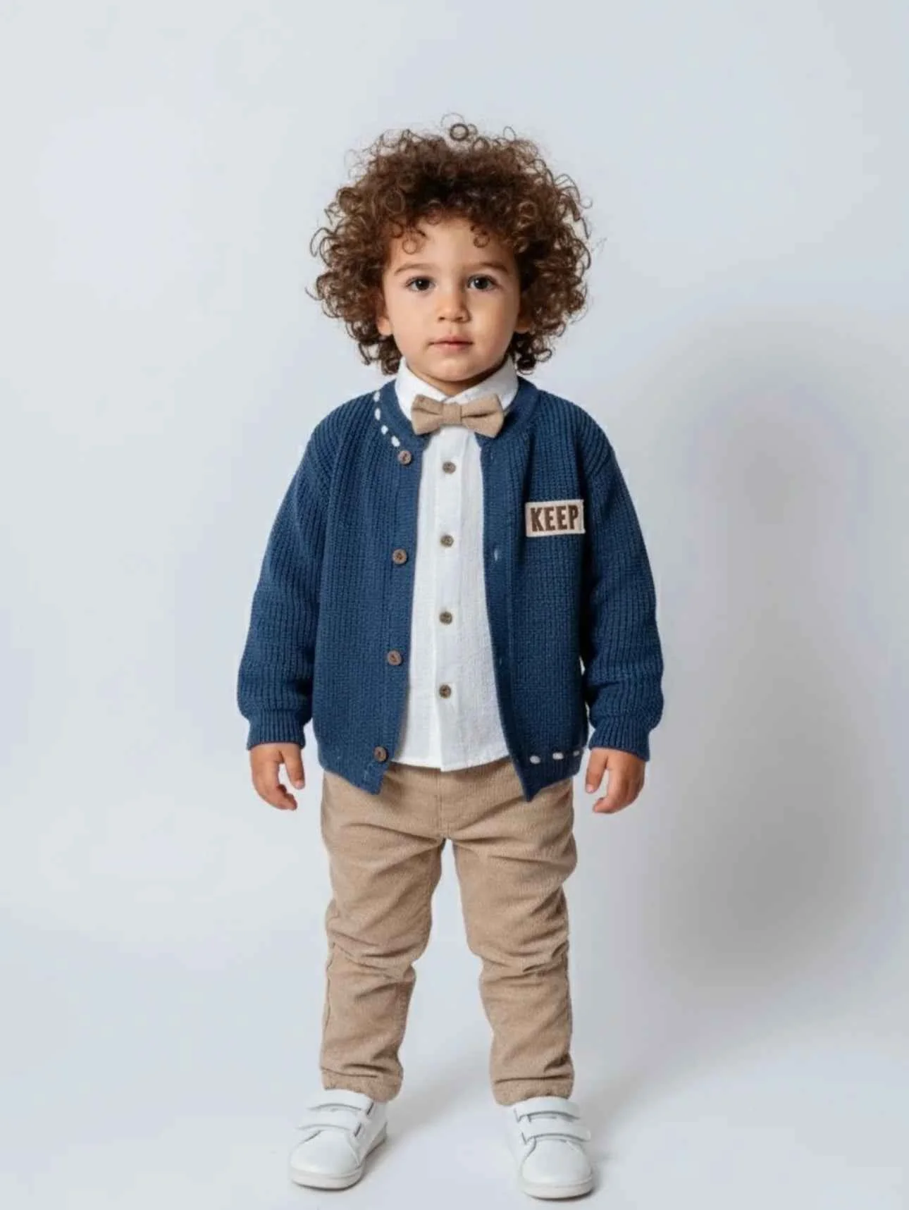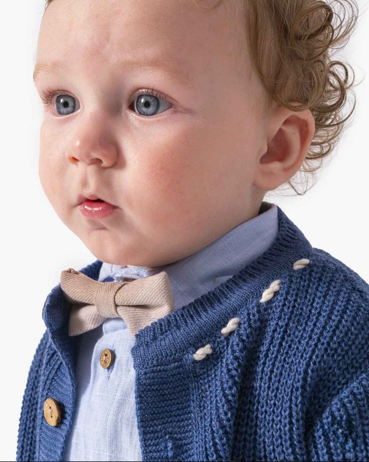 Completo bimbo composto da camicia in cotone con papillon coordinato al pantalone, cardigan in lana e pantalone. โ๏ธ Camicia celeste con papillon coordinato al pantalone โ๏ธ Cardigan blu con bottoni in legno e patch ricamata โ๏ธ Pantaloni beige dal taglio moderno