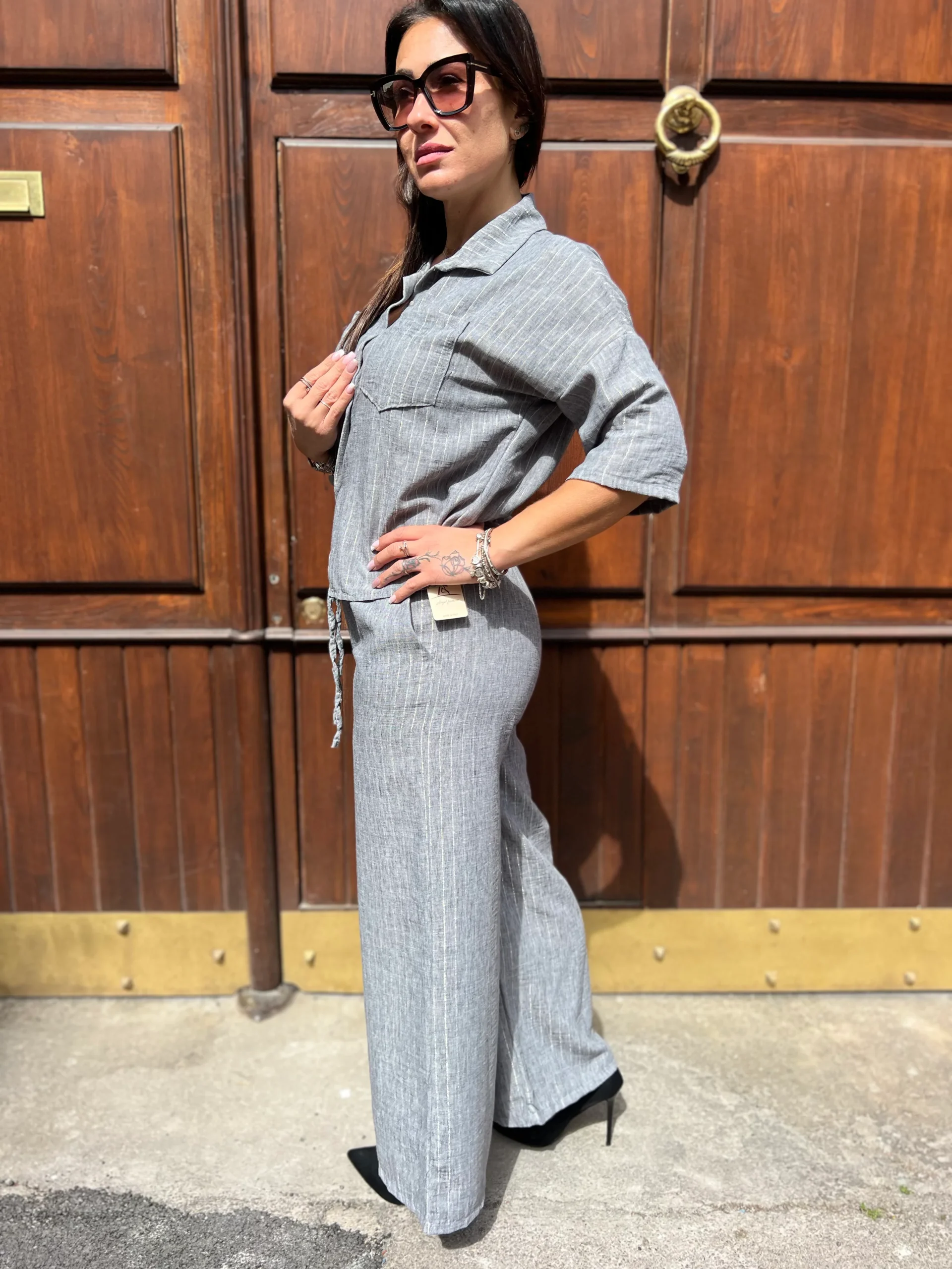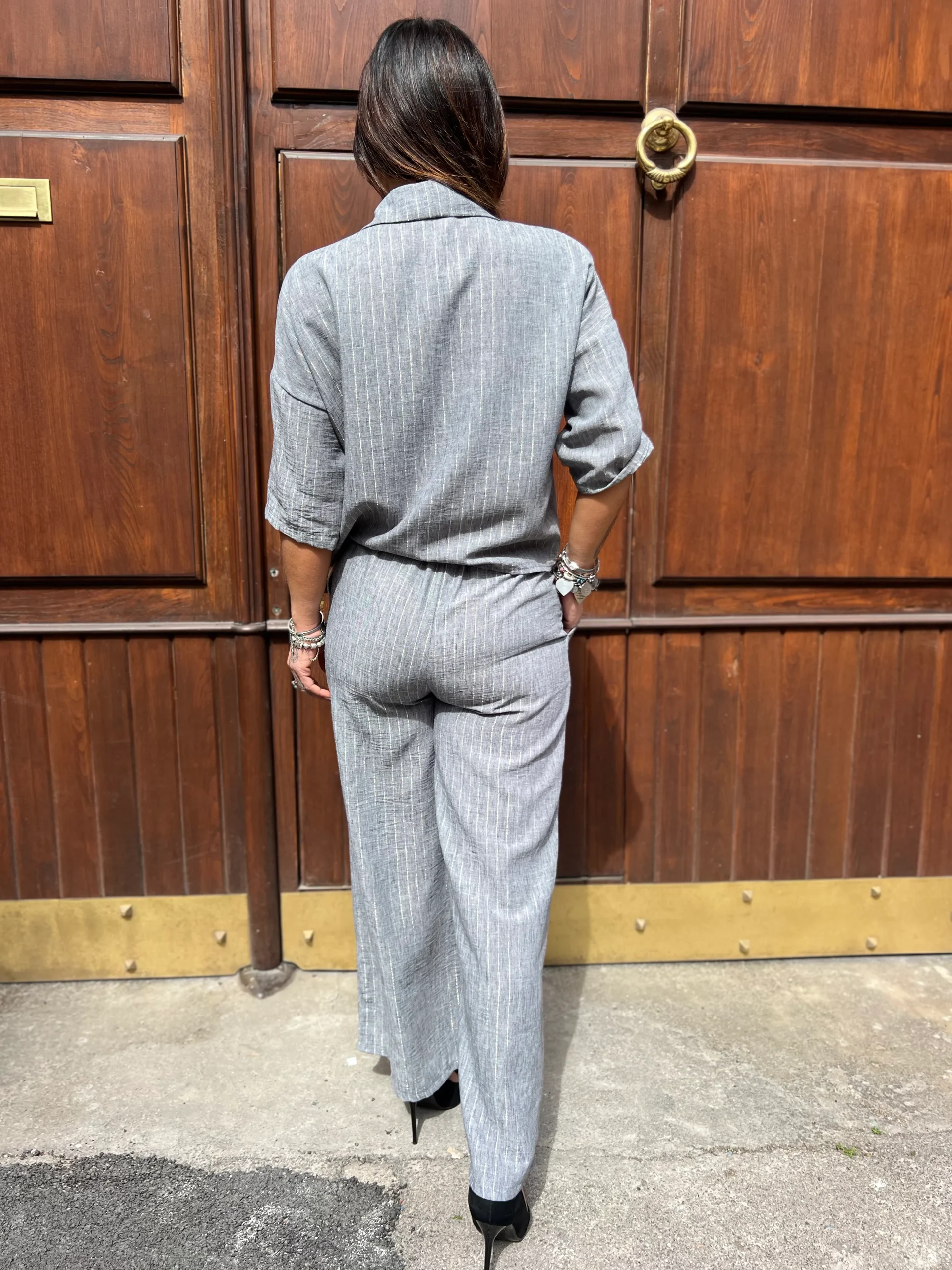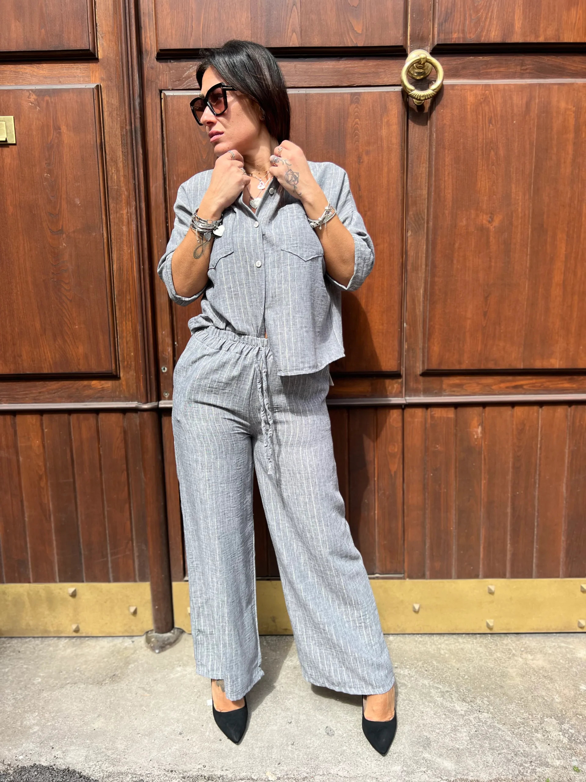 Questo completo camicia e pantalone gessato รจ perfetto per un look formale e sofisticato. La camicia presenta righini brillantinati che conferiscono un tocco di eleganza al completo. Il pantalone gessato, invece, dona un’allure professionale e raffinato. Un ottimo investimento per il tuo guardaroba di lavoro.