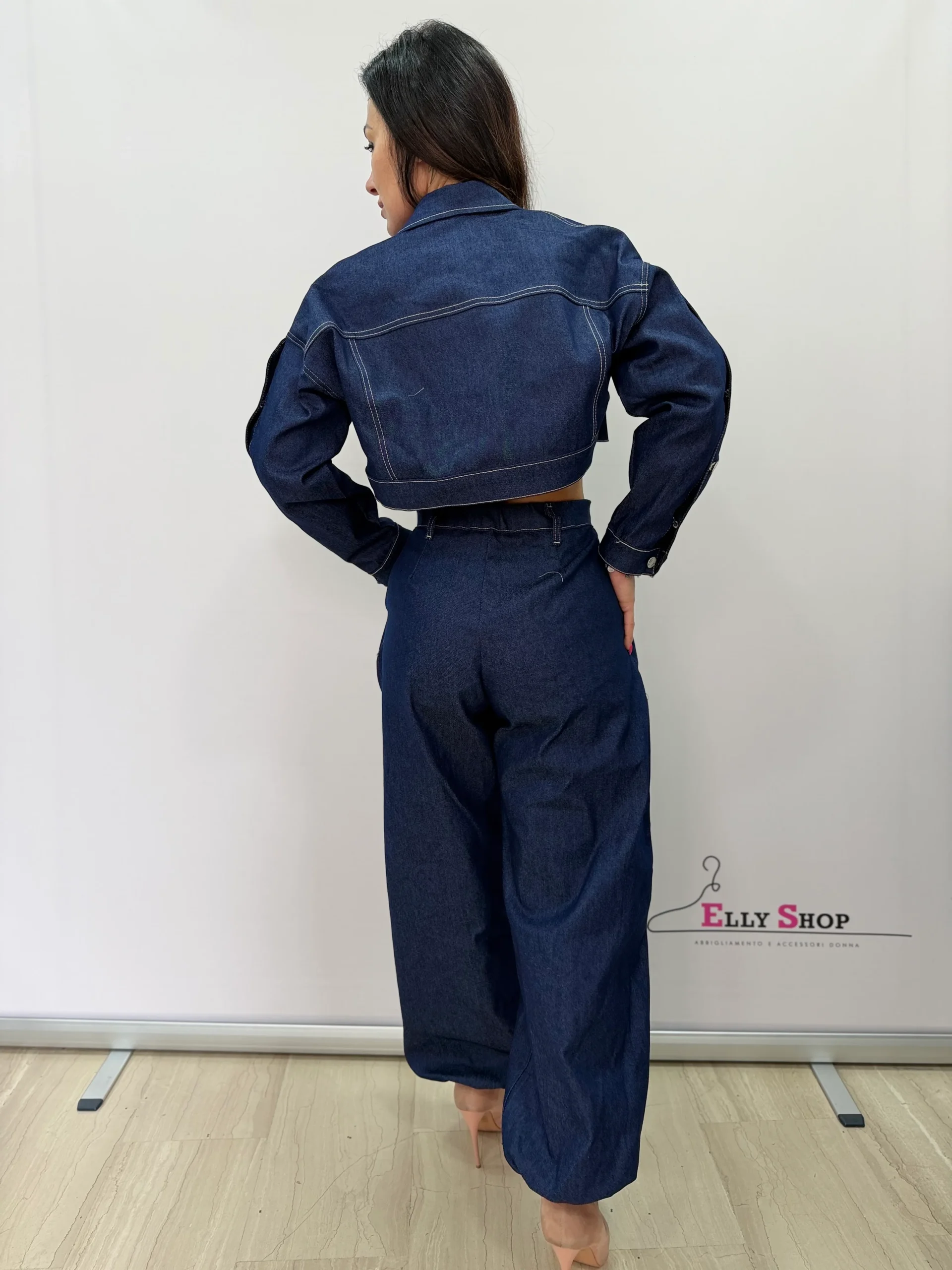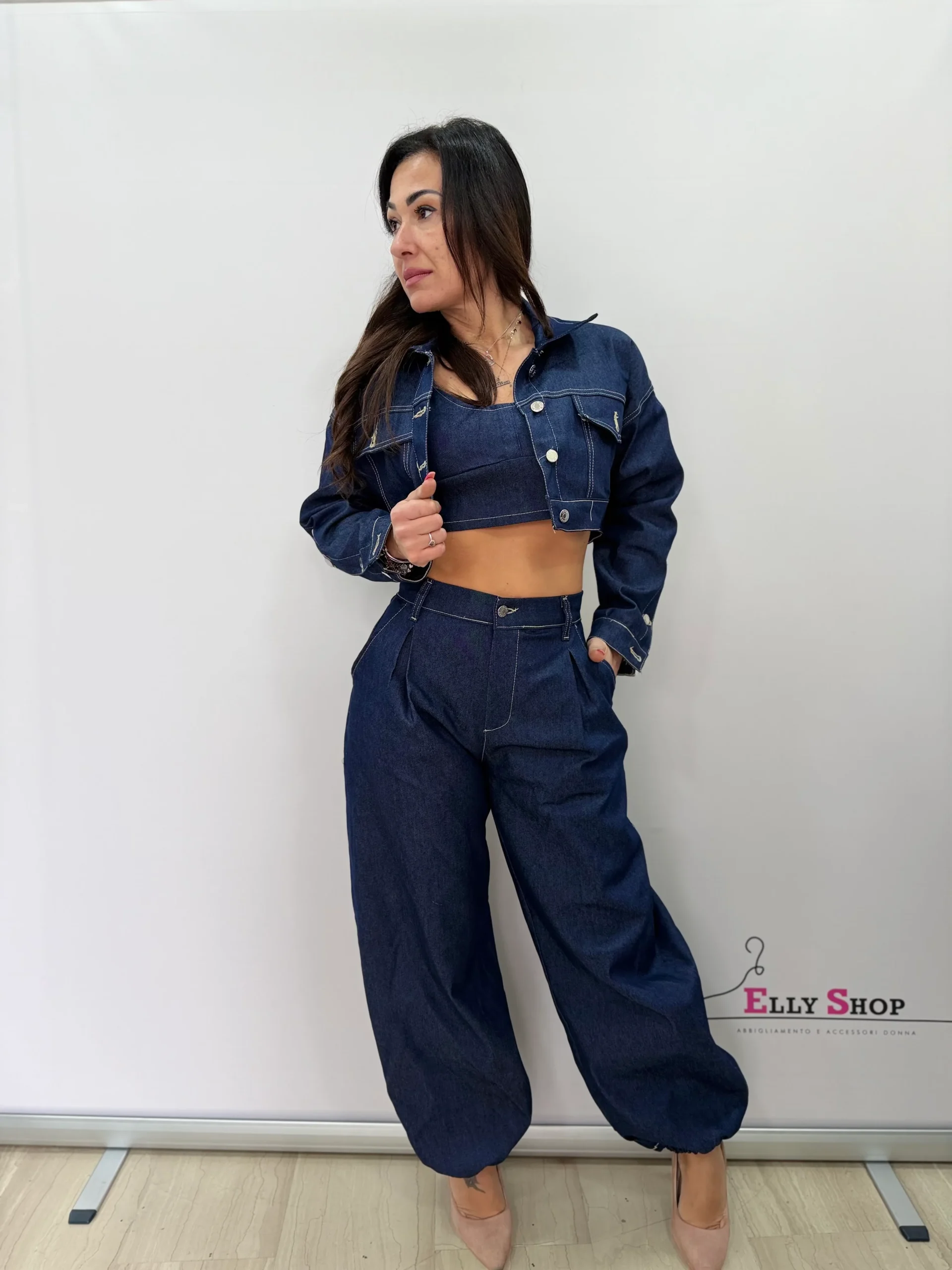 Completo donna tre pezzi in denim dal carattere deciso e contemporaneo, perfetto per look audaci e di tendenza. Il set è composto da giacca cropped con bottoni metallici e cuciture a contrasto, top coordinato dal taglio aderente e pantaloni a vita alta con linea ampia e fondo leggermente arricciato. Un outfit versatile che può essere indossato completo per un effetto wow oppure spezzato per creare abbinamenti sempre nuovi. Ideale per tempo libero, serate casual chic e occasioni fashion. Il lavaggio denim scuro dona eleganza e slancia la figura. Vestibilità regolare con pantalone morbido sulla gamba.