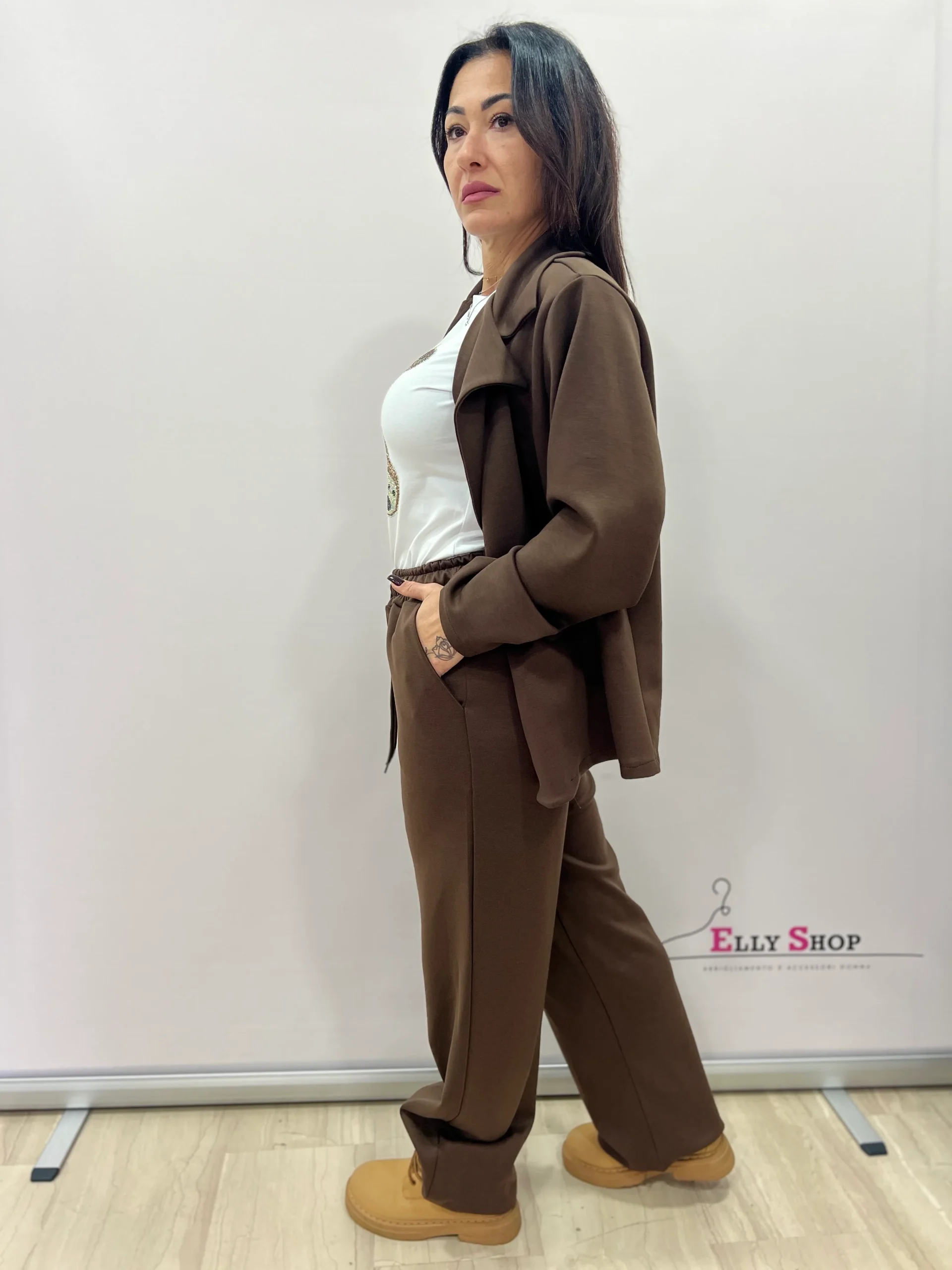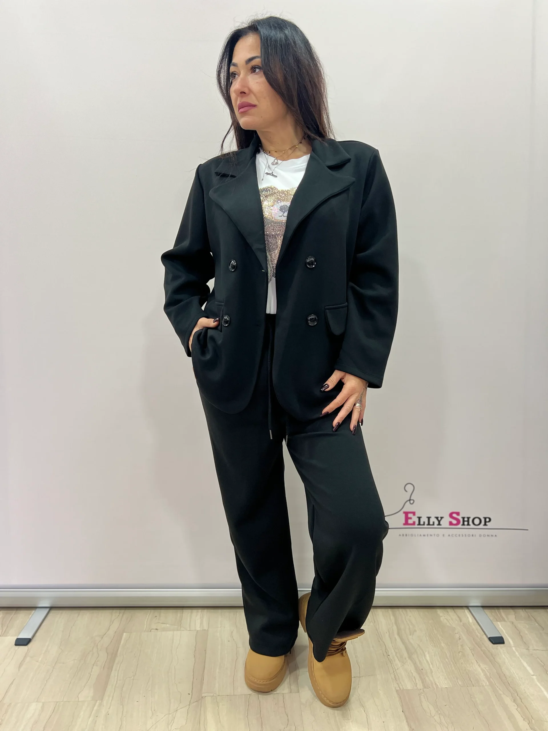 Completo donna dallo stile contemporaneo e versatile, composto da blazer doppiopetto e pantalone coordinato. Il design unisce eleganza e comfort, rendendolo perfetto sia per look casual chic quotidiani che per occasioni più curate, come ufficio, tempo libero o uscite serali informali. La vestibilità è morbida e confortevole, valorizza la silhouette senza costringere ed è ideale per chi ama un look rilassato ma ricercato. Disponibile in diverse tonalità di tendenza, facilmente abbinabili.