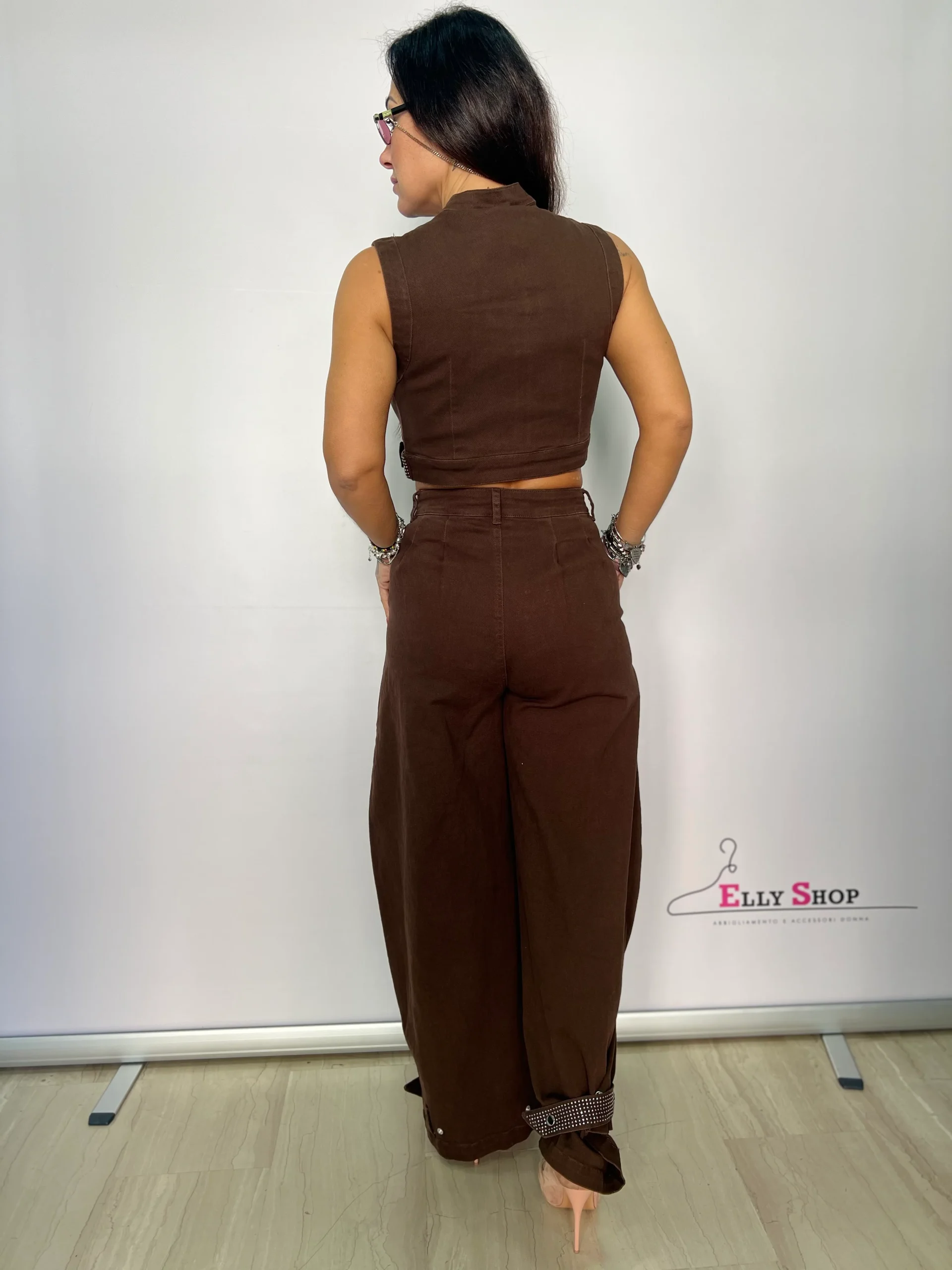 Completo donna dal carattere deciso e contemporaneo, composto da top crop smanicato con collo alto e cintura coordinata con fibbia gioiello, abbinato a pantalone palazzo a vita alta. Un outfit perfetto per chi ama distinguersi con uno stile grintoso ma raffinato. La linea ampia del pantalone slancia la figura mentre il top corto valorizza il punto vita, creando un equilibrio moderno e femminile. Ideale per aperitivi, serate ed eventi glamour. Disponibile nelle varianti bianco, marrone e denim chiaro.