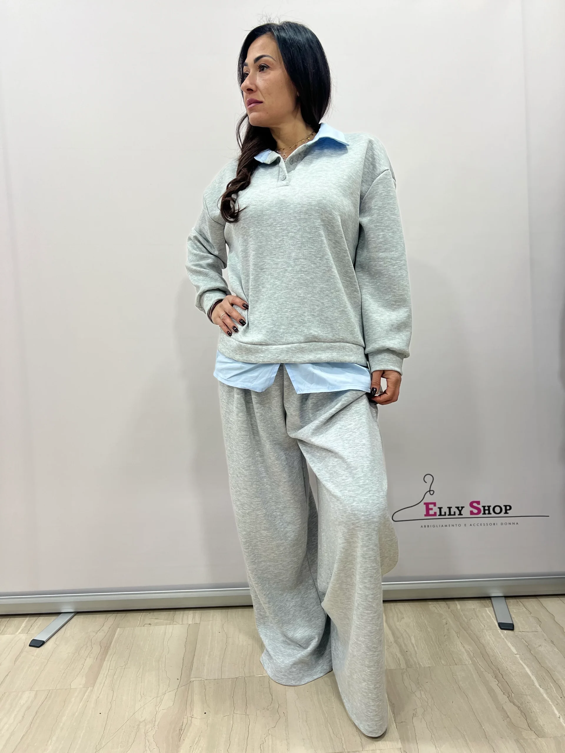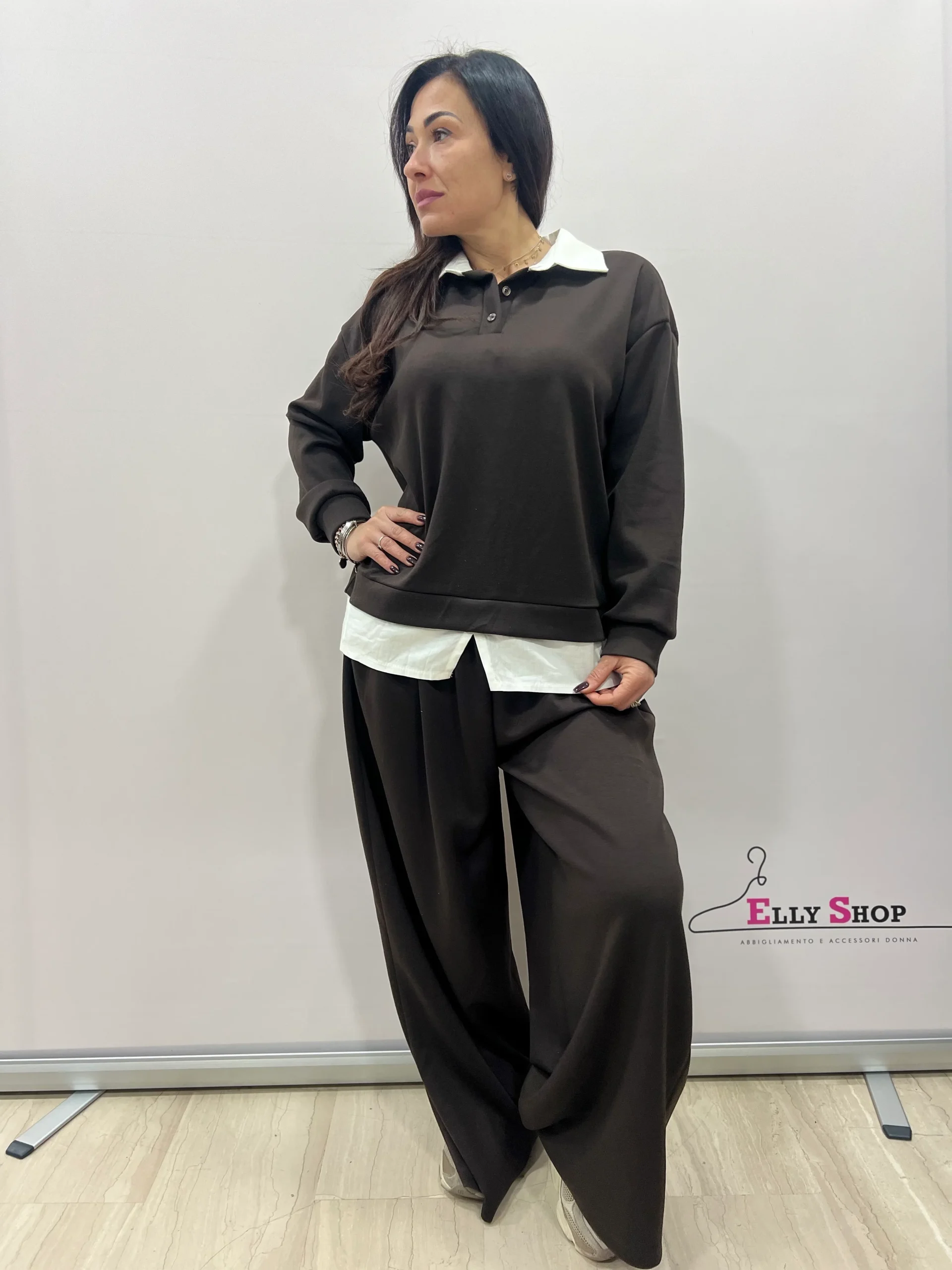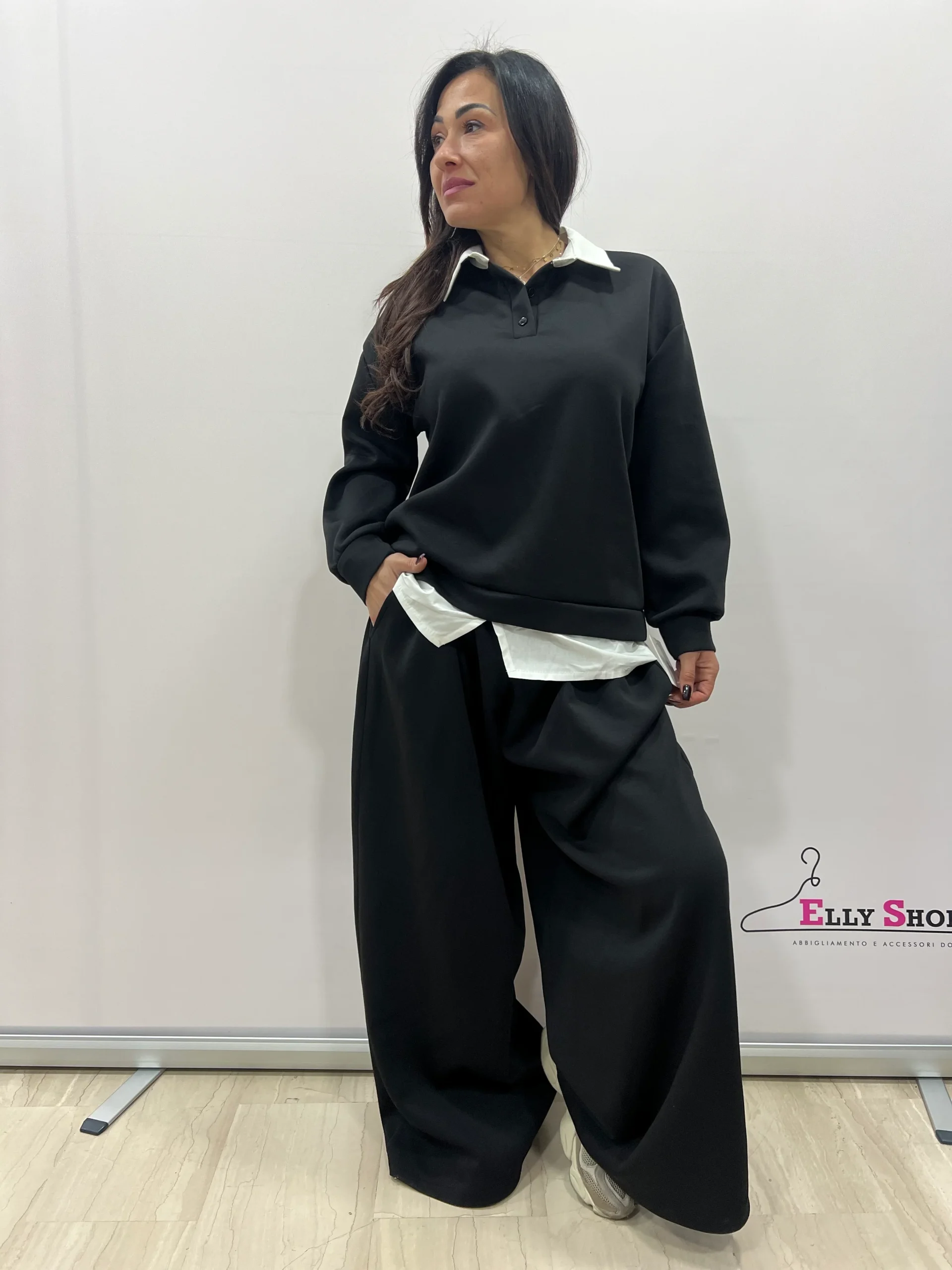 Completo due pezzi dallo stile casual-chic, pensato per valorizzare le forme con una vestibilità confortevole e moderna. Il design richiama l’effetto camicia sotto la felpa, per un look curato ma rilassato, ideale sia per il tempo libero che per outfit quotidiani raffinati. Il pantalone ampio slancia la figura e garantisce massima comodità. Disponibile in diverse varianti colore, è un capo versatile perfetto da indossare in ogni momento della giornata.