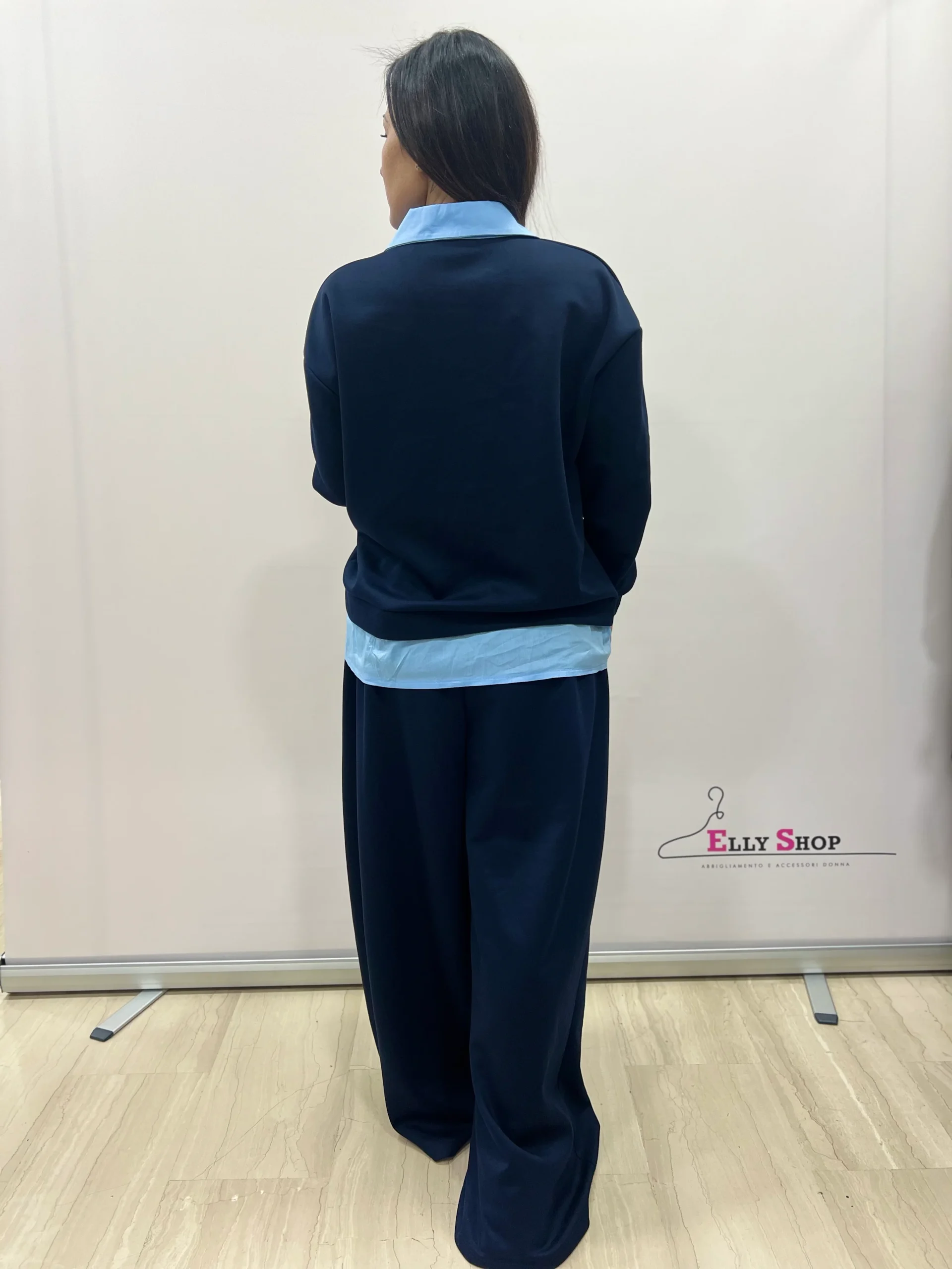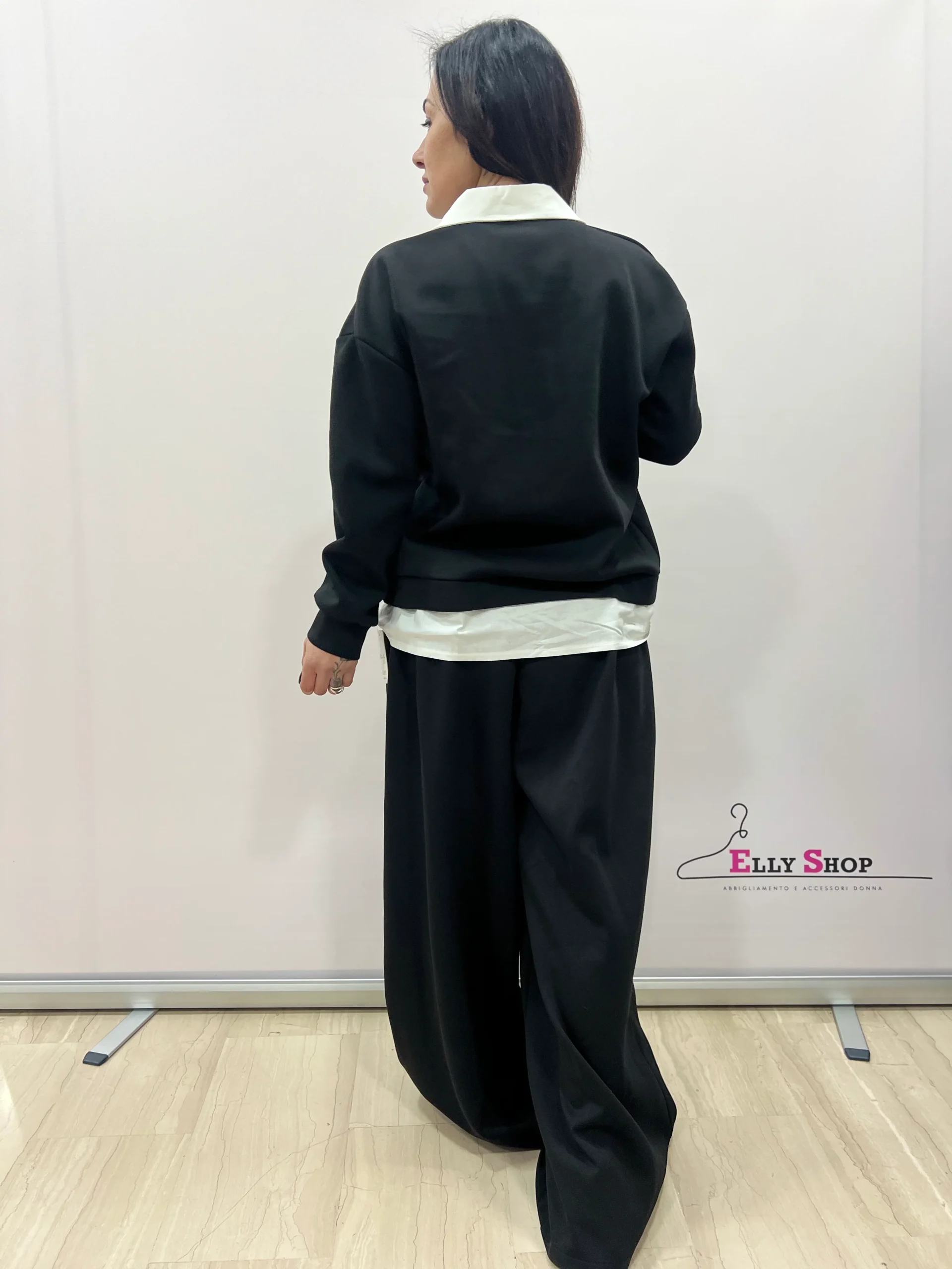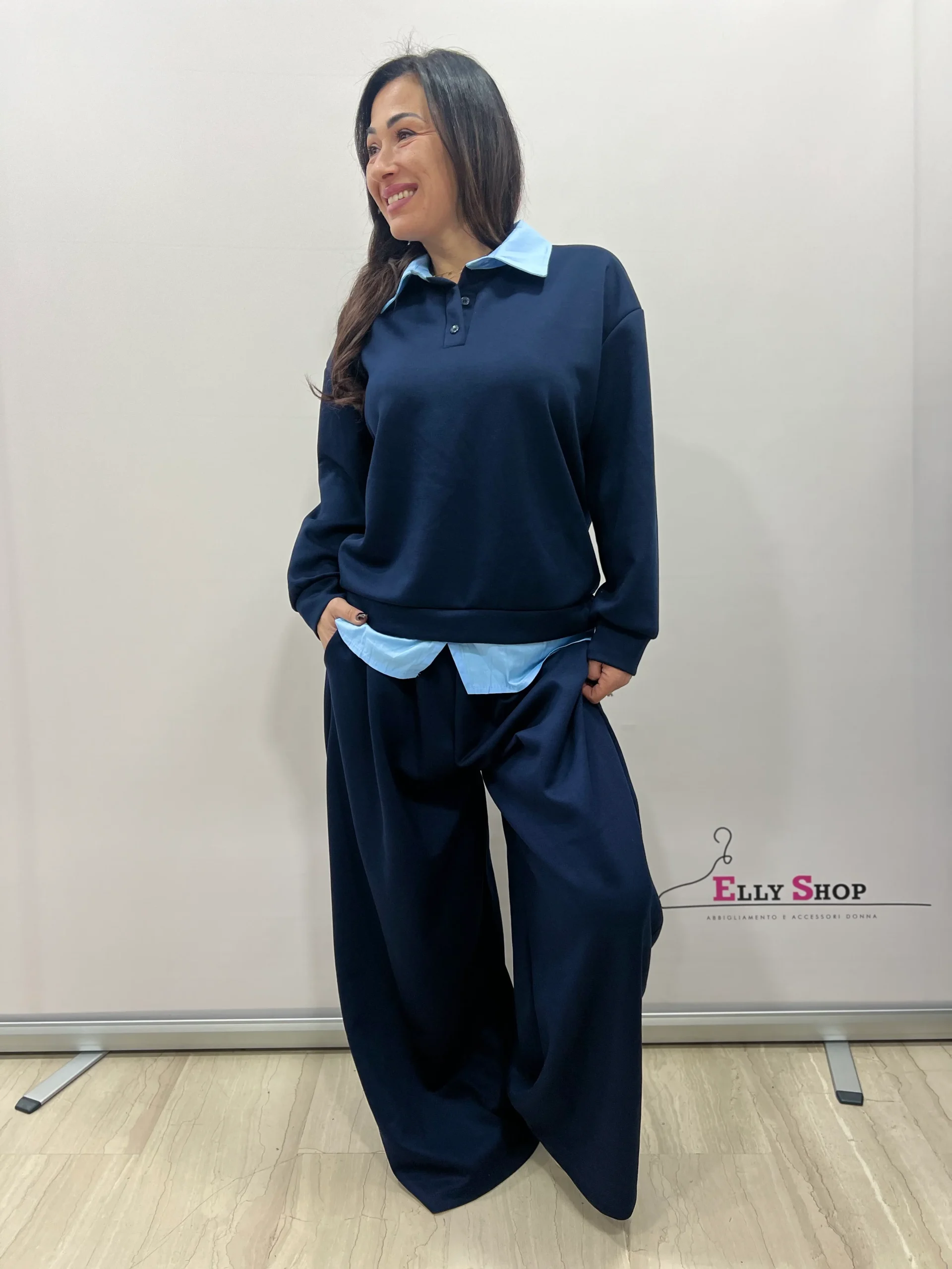Completo due pezzi dallo stile casual-chic, pensato per valorizzare le forme con una vestibilità confortevole e moderna. Il design richiama l’effetto camicia sotto la felpa, per un look curato ma rilassato, ideale sia per il tempo libero che per outfit quotidiani raffinati. Il pantalone ampio slancia la figura e garantisce massima comodità. Disponibile in diverse varianti colore, è un capo versatile perfetto da indossare in ogni momento della giornata.