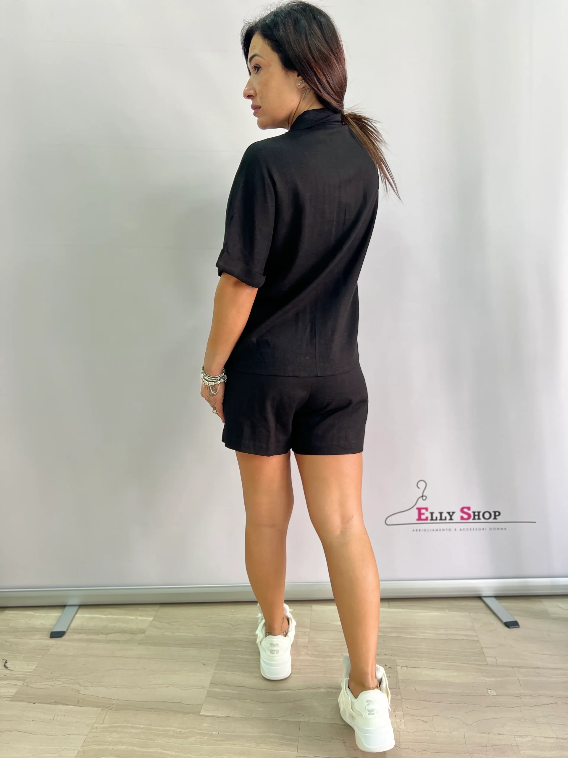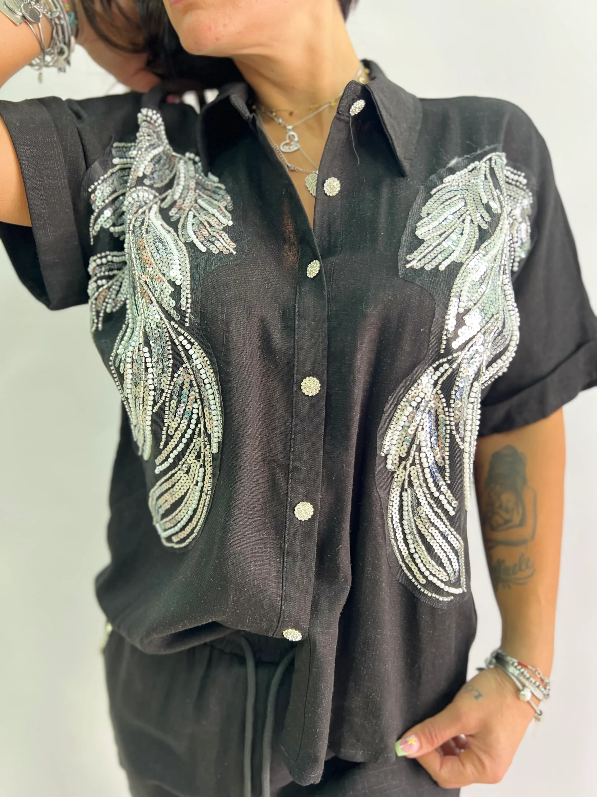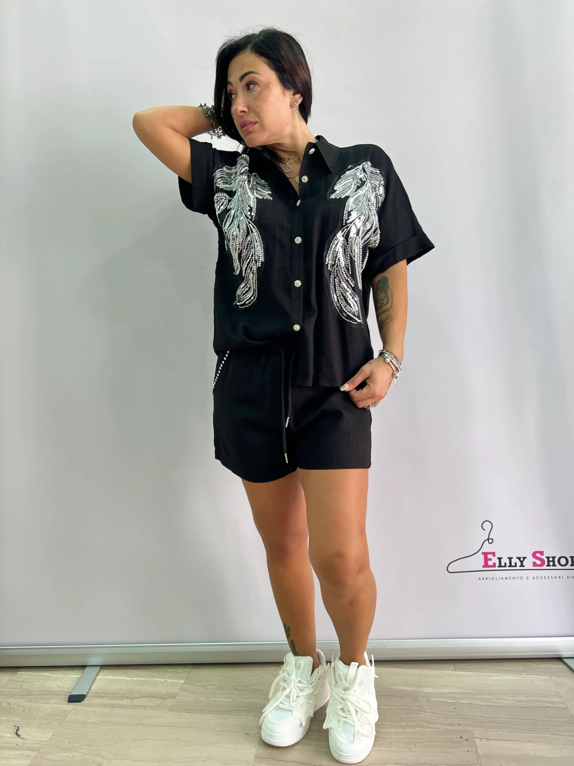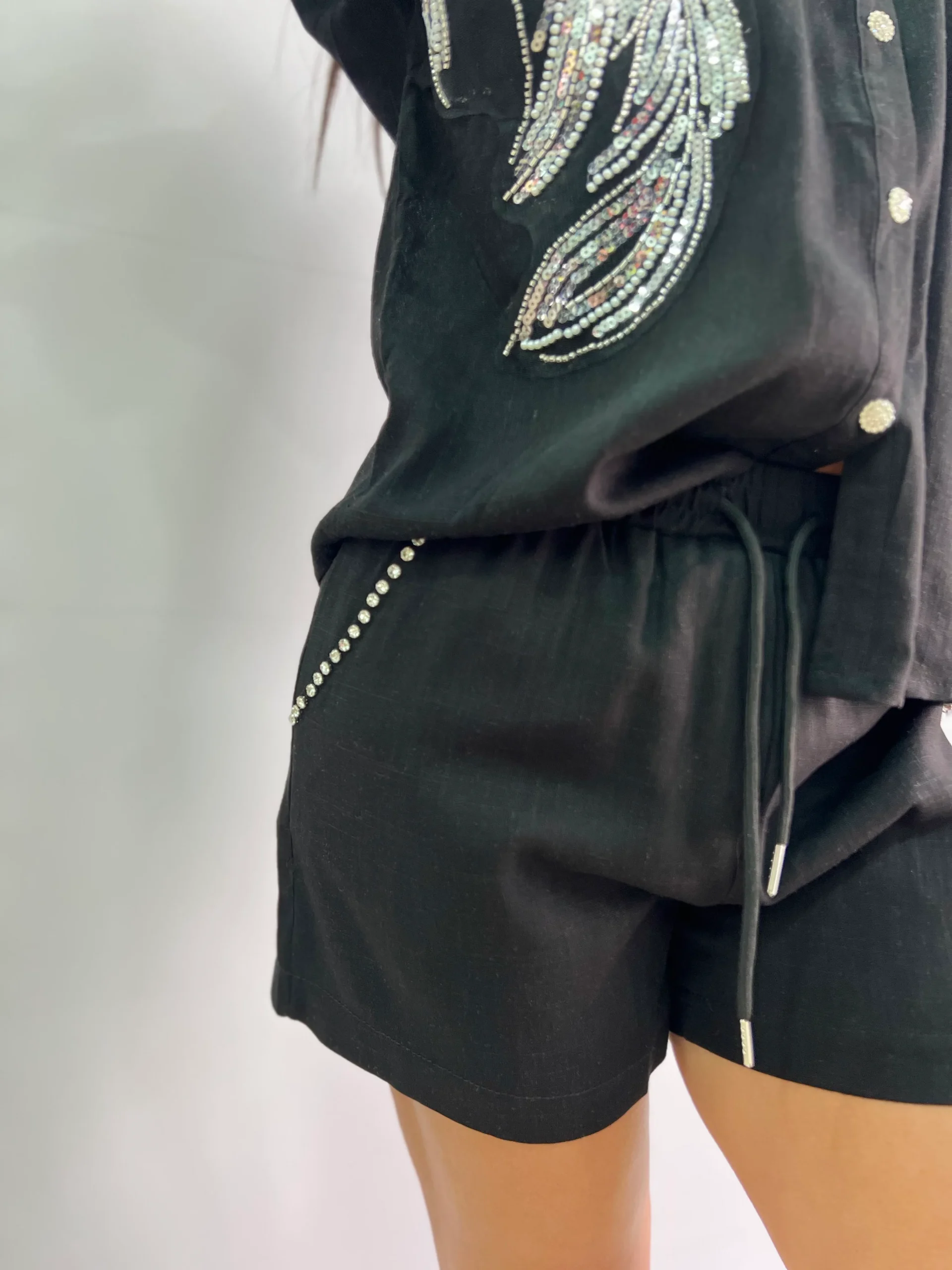 Completo estivo da donna composto da camicia a manica corta con bottoni e pantaloncini con coulisse in vita. Il capo è impreziosito da eleganti ricami a forma di piume in paillettes argento sul davanti, che donano luce e stile al look. Perfetto per le serate estive, aperitivi o outfit casual chic. Vestibilità comoda e fluida, adatta fino a una L/XL. Disponibile in colore nero.