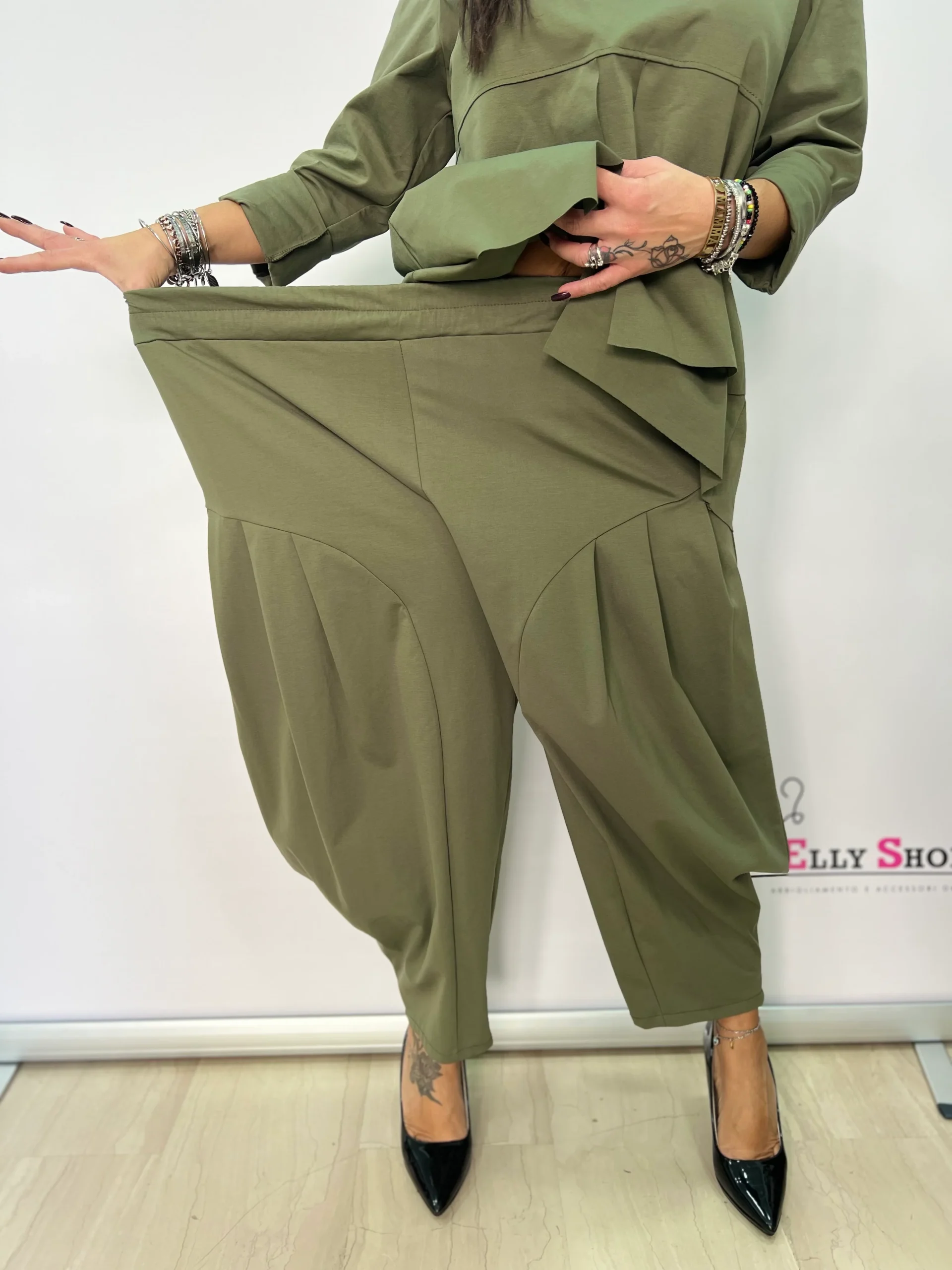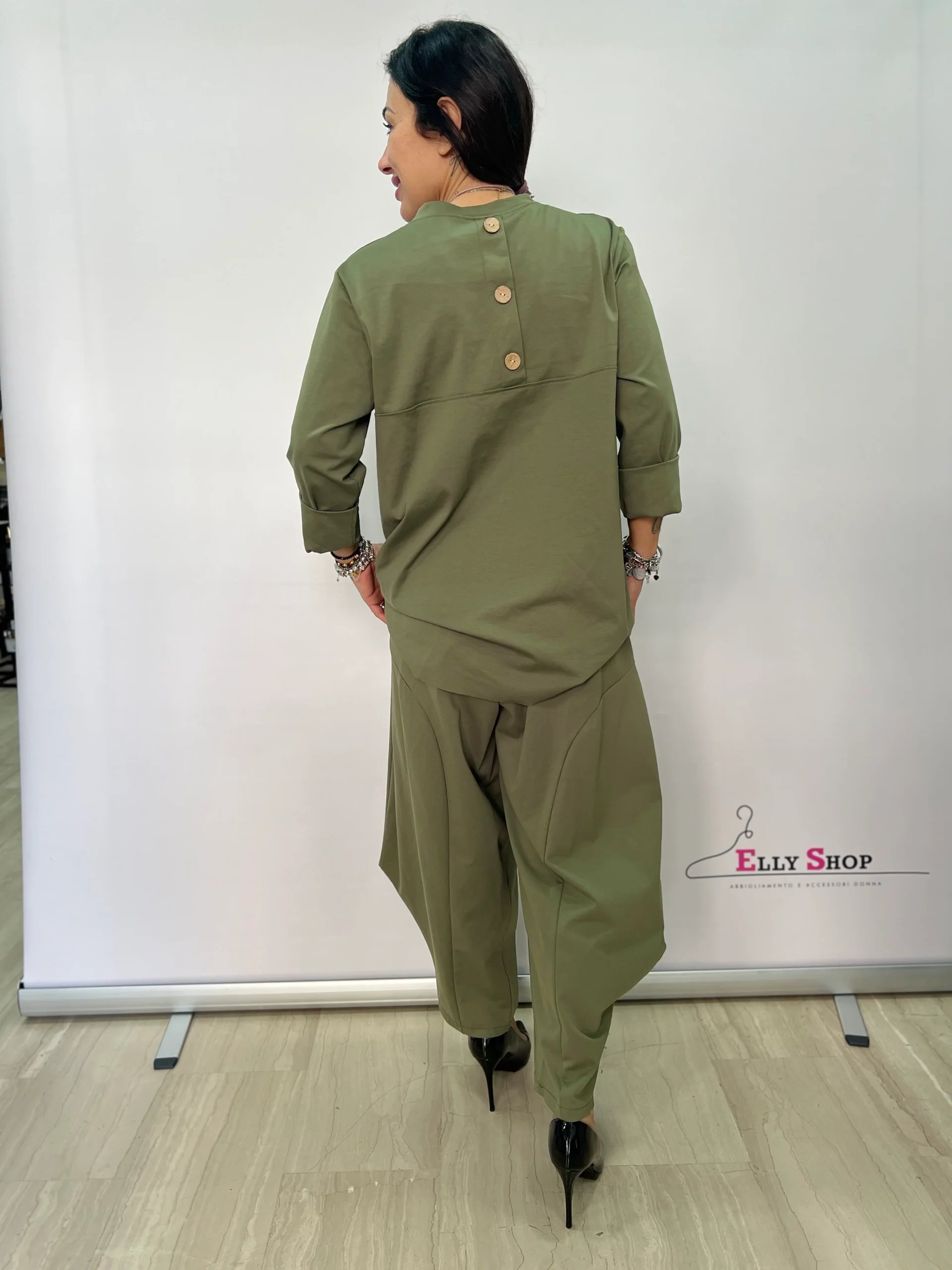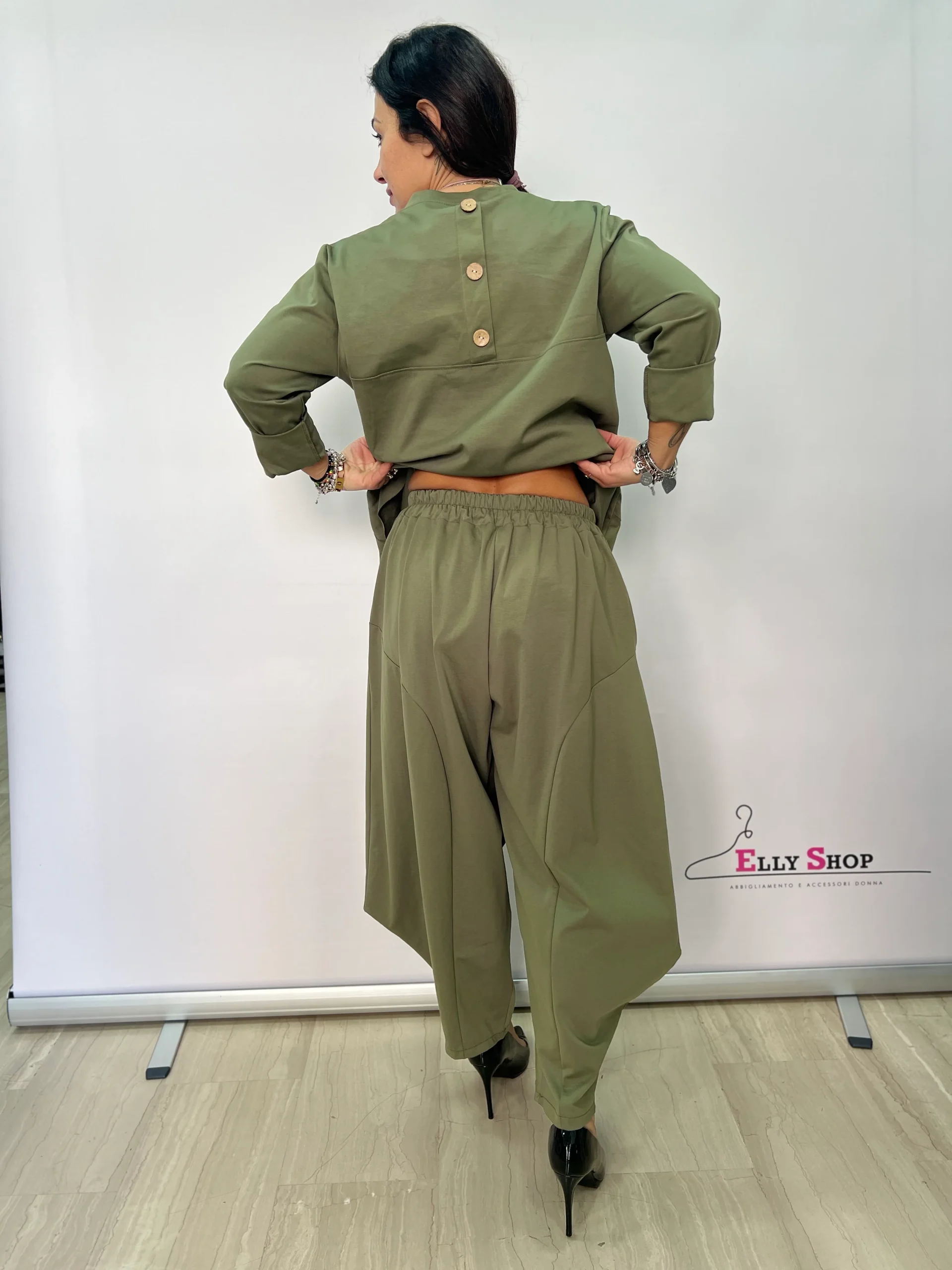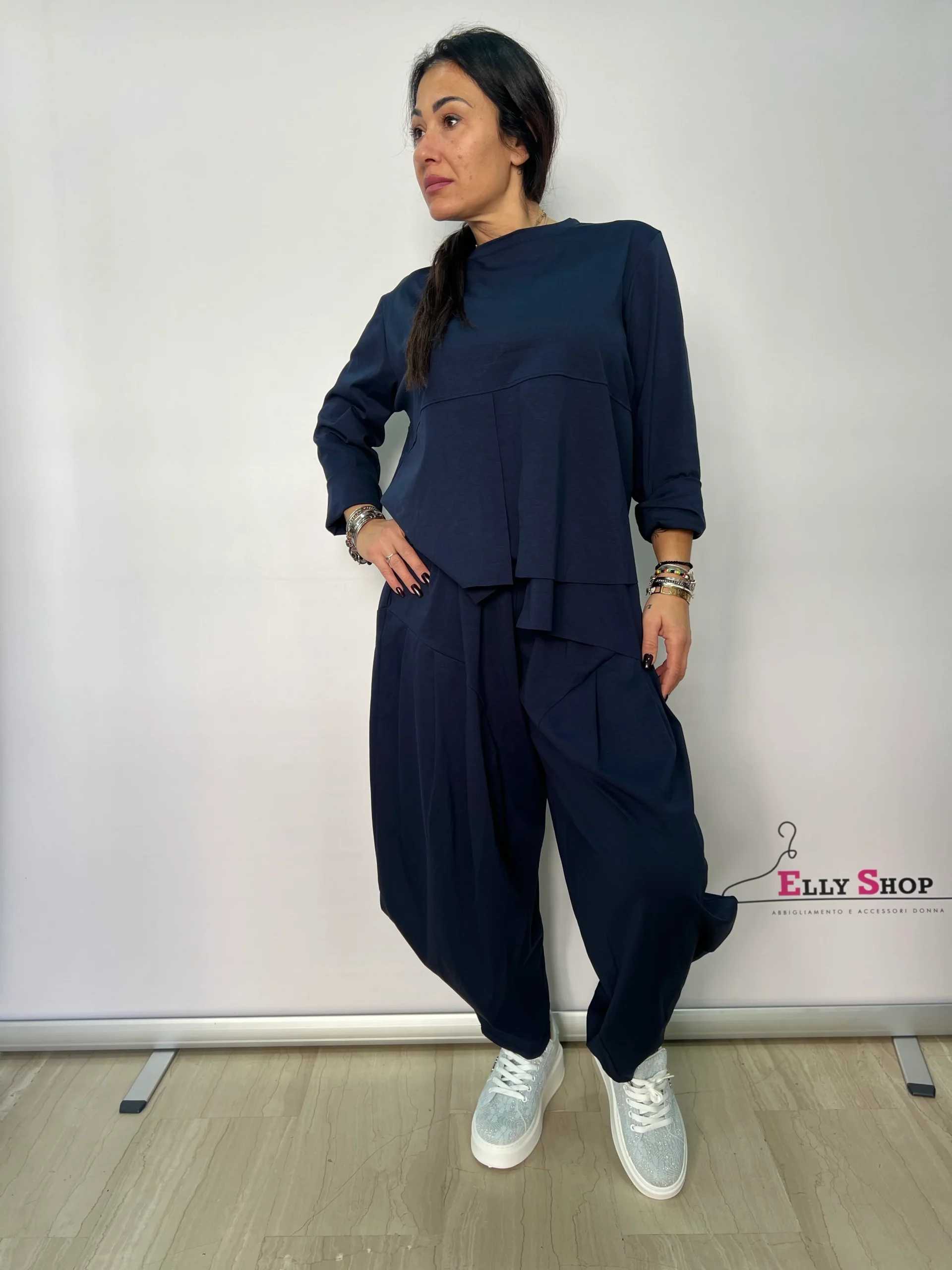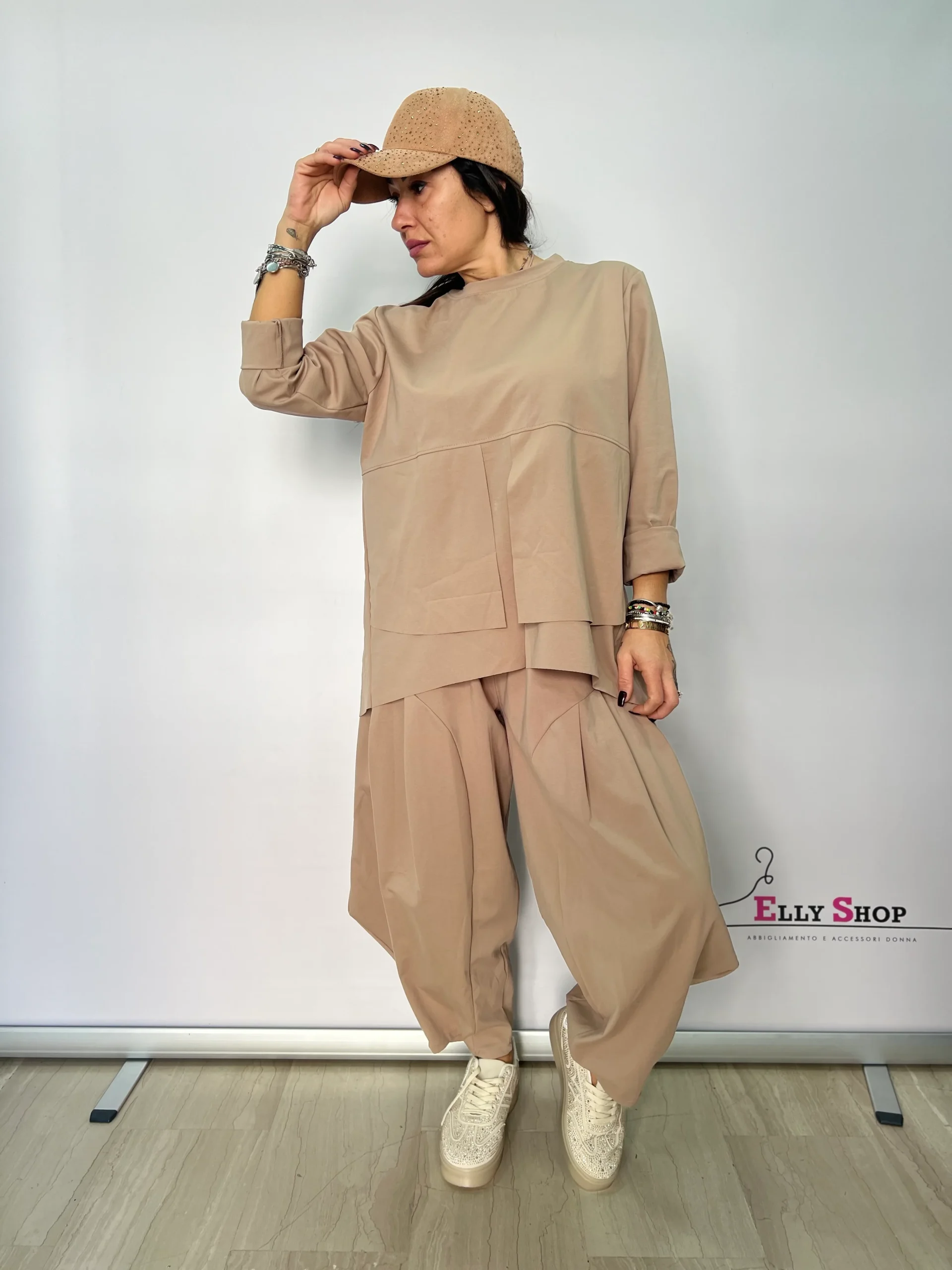 Completo due pezzi dallo stile moderno e ricercato, caratterizzato da linee pulite e volumi morbidi. La vestibilità oversize garantisce comfort assoluto e libertà di movimento, rendendolo ideale sia per il quotidiano che per occasioni casual chic. Il top presenta una linea scivolata con taglio sotto il seno e fondo asimmetrico, mentre il pantalone ampio dona un look sofisticato e attuale. Perfetto da indossare con sneakers per il giorno o con décolleté per un outfit più elegante. Disponibile in tonalità versatili e di tendenza.