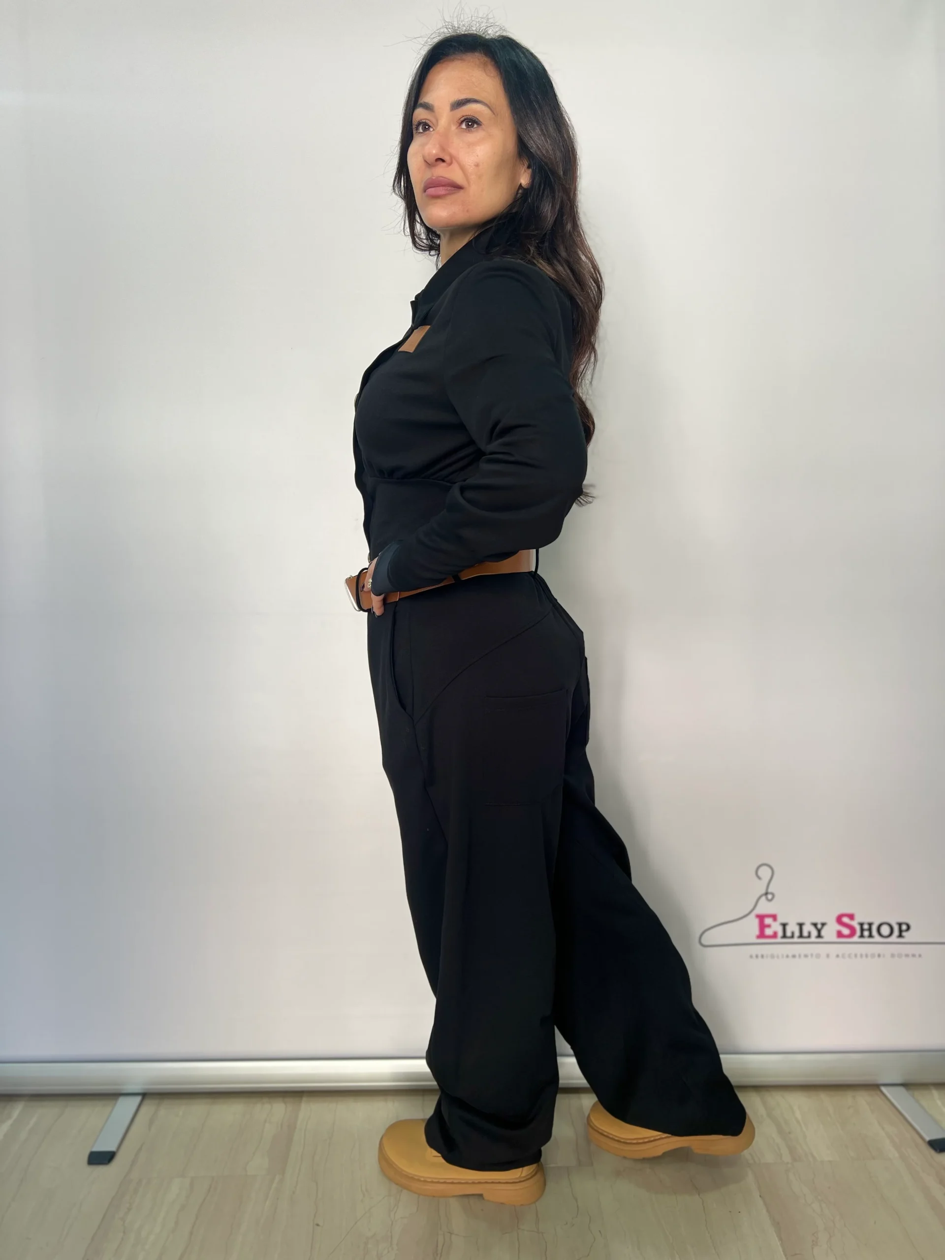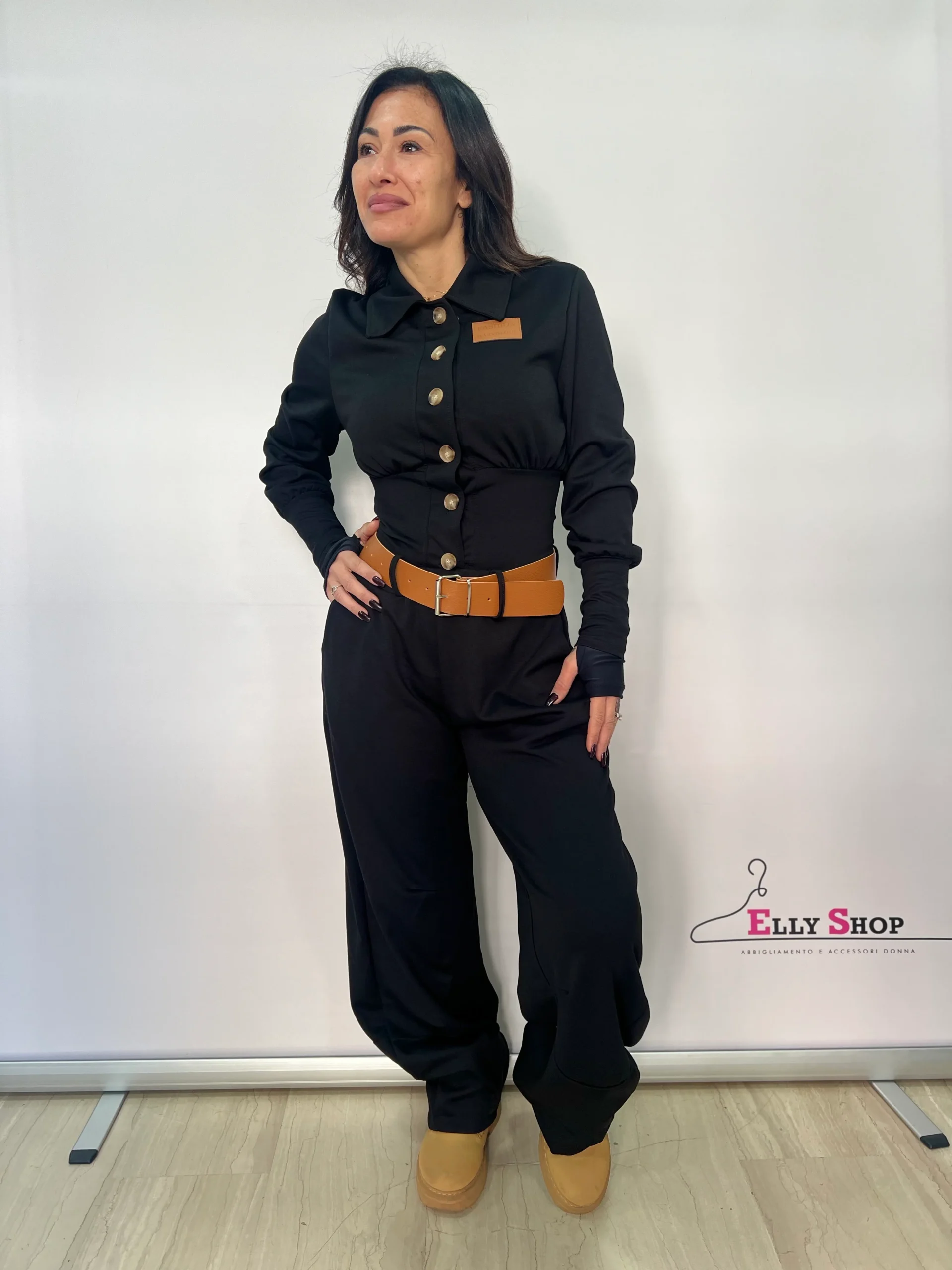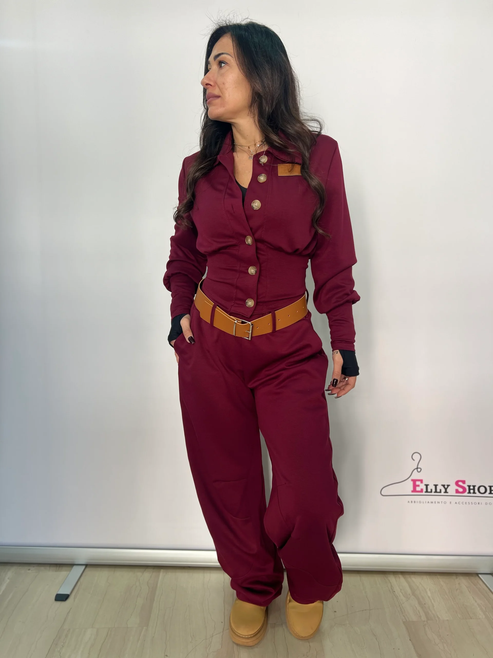 Dettaglio: Giacca corta con chiusura frontale a bottoni e pantalone lungo con tasche laterali; cintura in vita inclusa