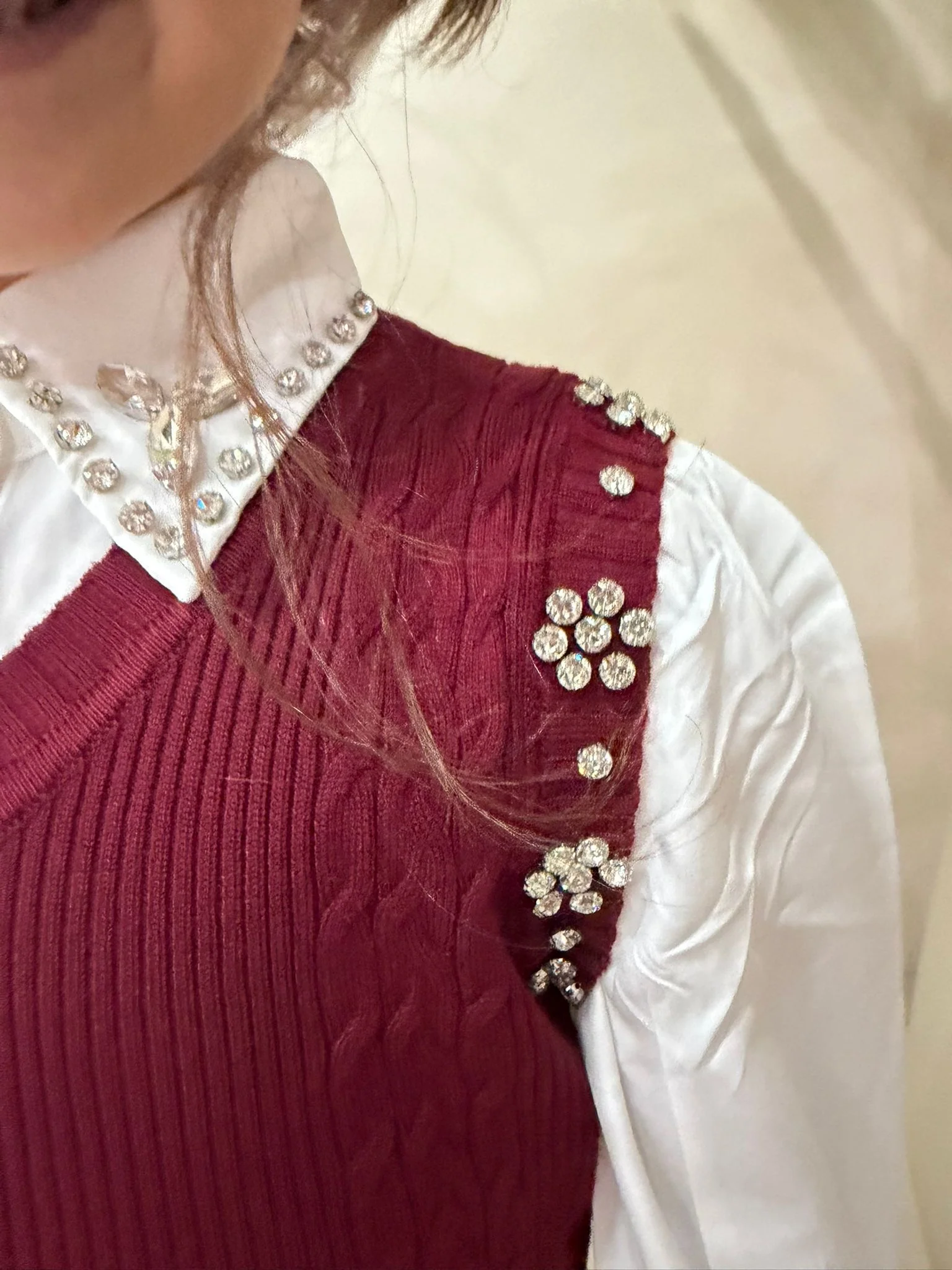 Dettaglio: Abito in maglia a trecce con scollo a V e applicazioni brillanti sulle spalle; camicia bianca con colletto decorato