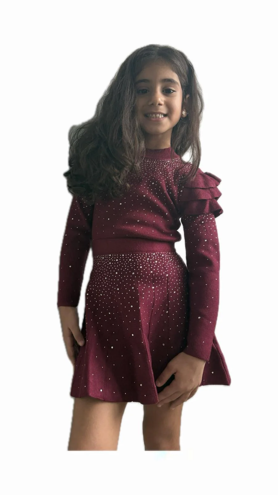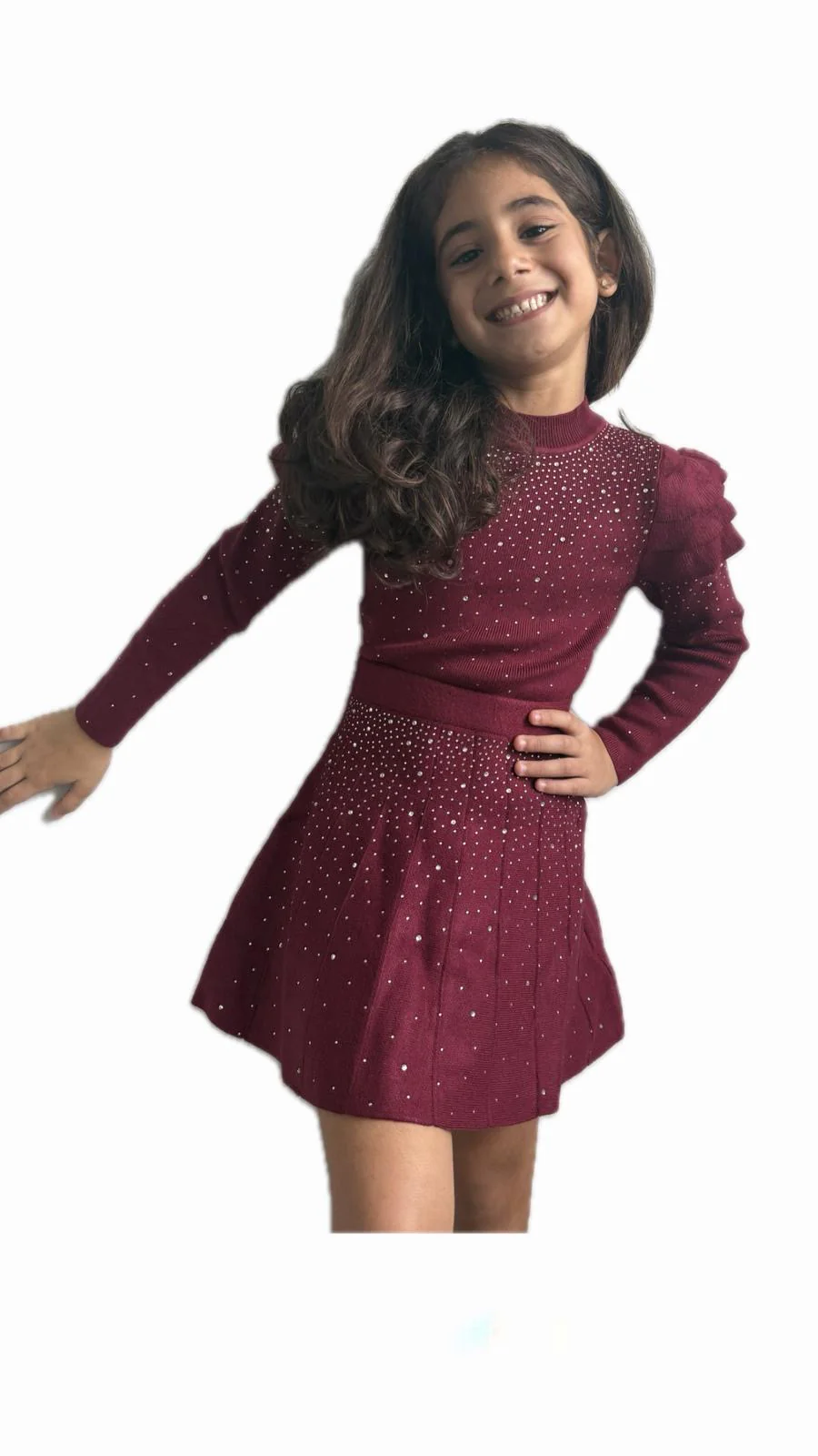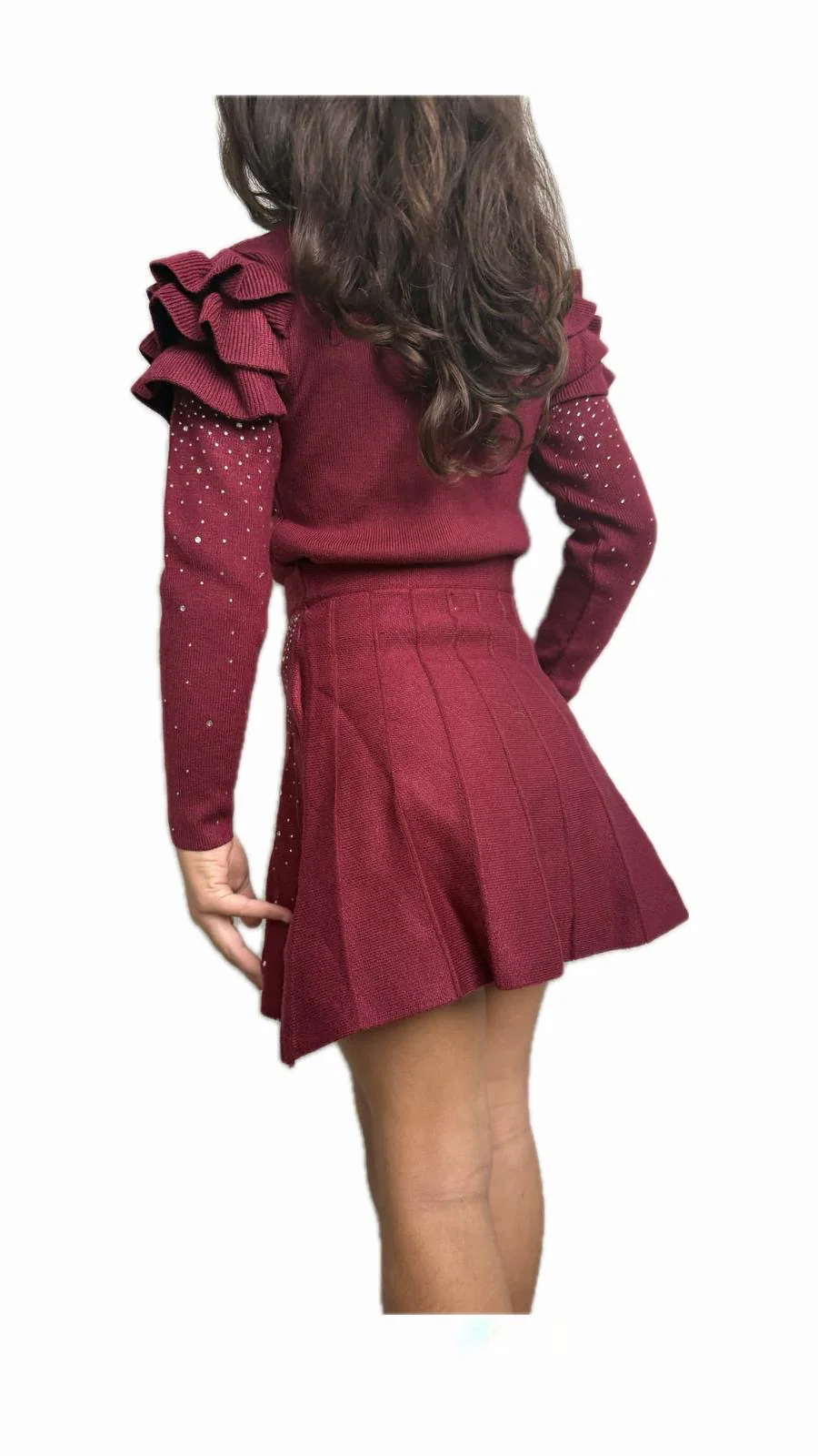 Completo raffinato e di tendenza composto da maglia a maniche lunghe e gonna a pieghe, impreziosito da luminose applicazioni brillanti. Perfetto per occasioni speciali, cerimonie o feste, unisce eleganza e comfort grazie alla vestibilità regolare e alla morbidezza del tessuto. Il colore bordeaux dona un tocco sofisticato e moderno, ideale per la stagione autunno-inverno.