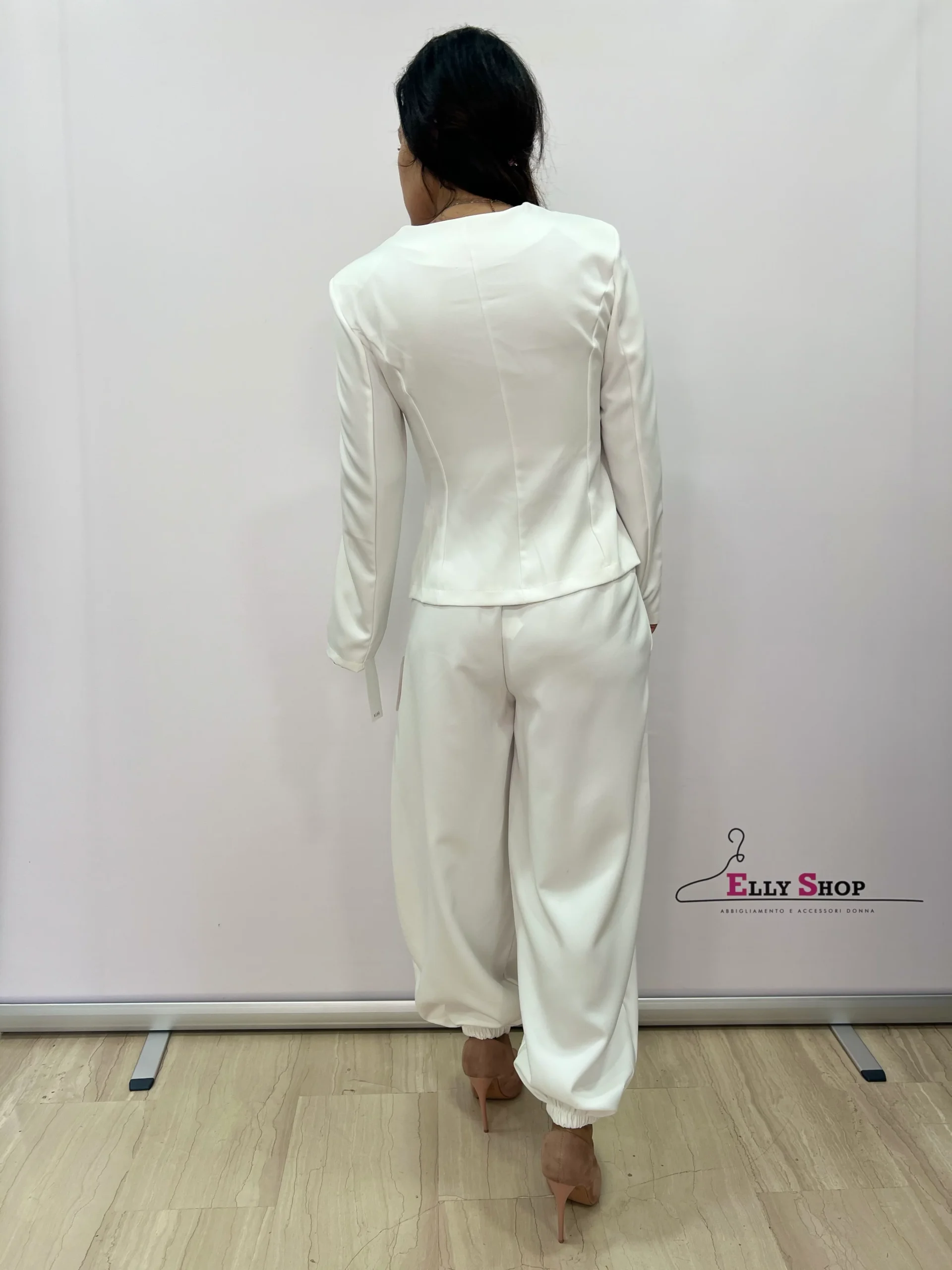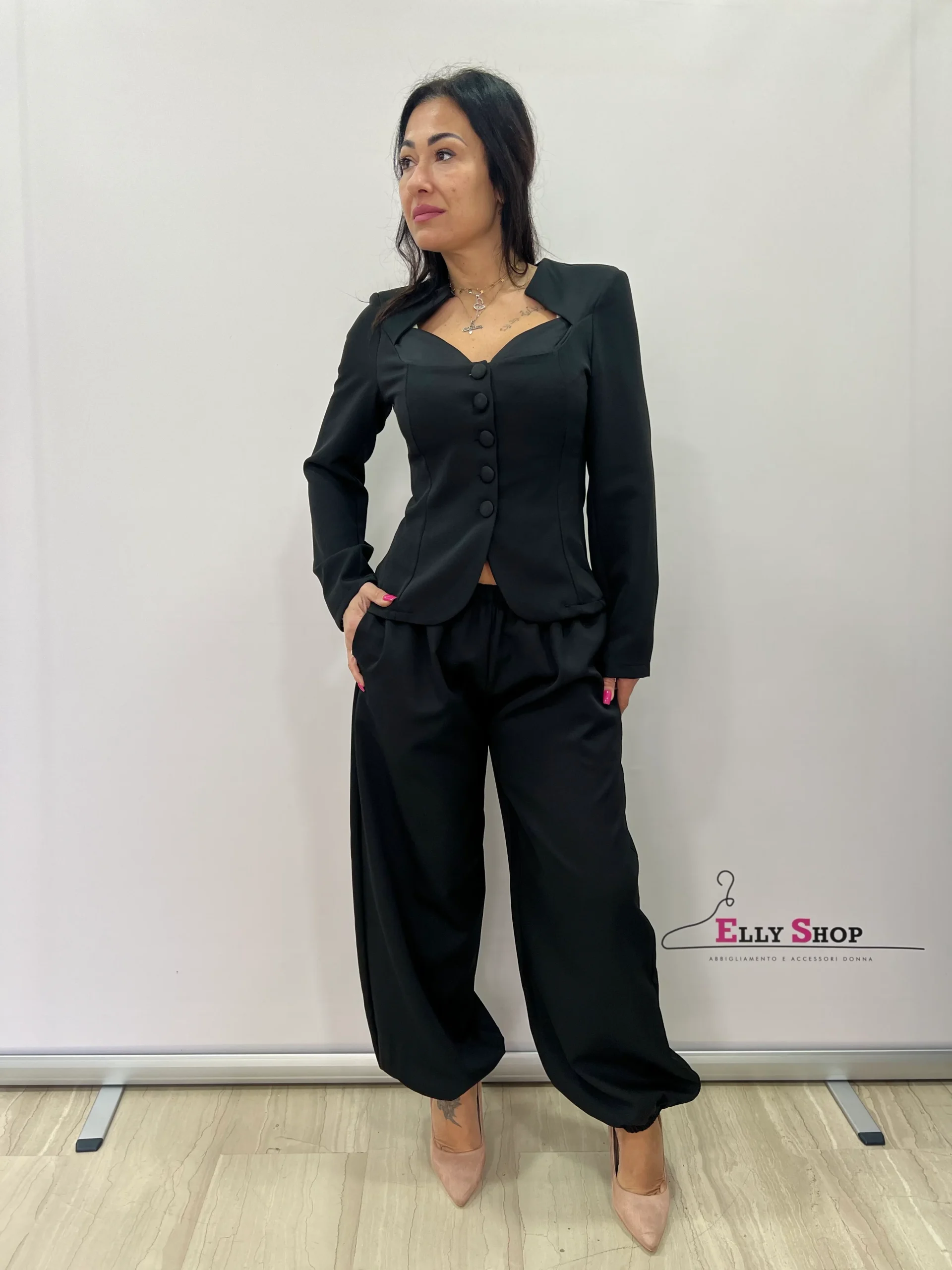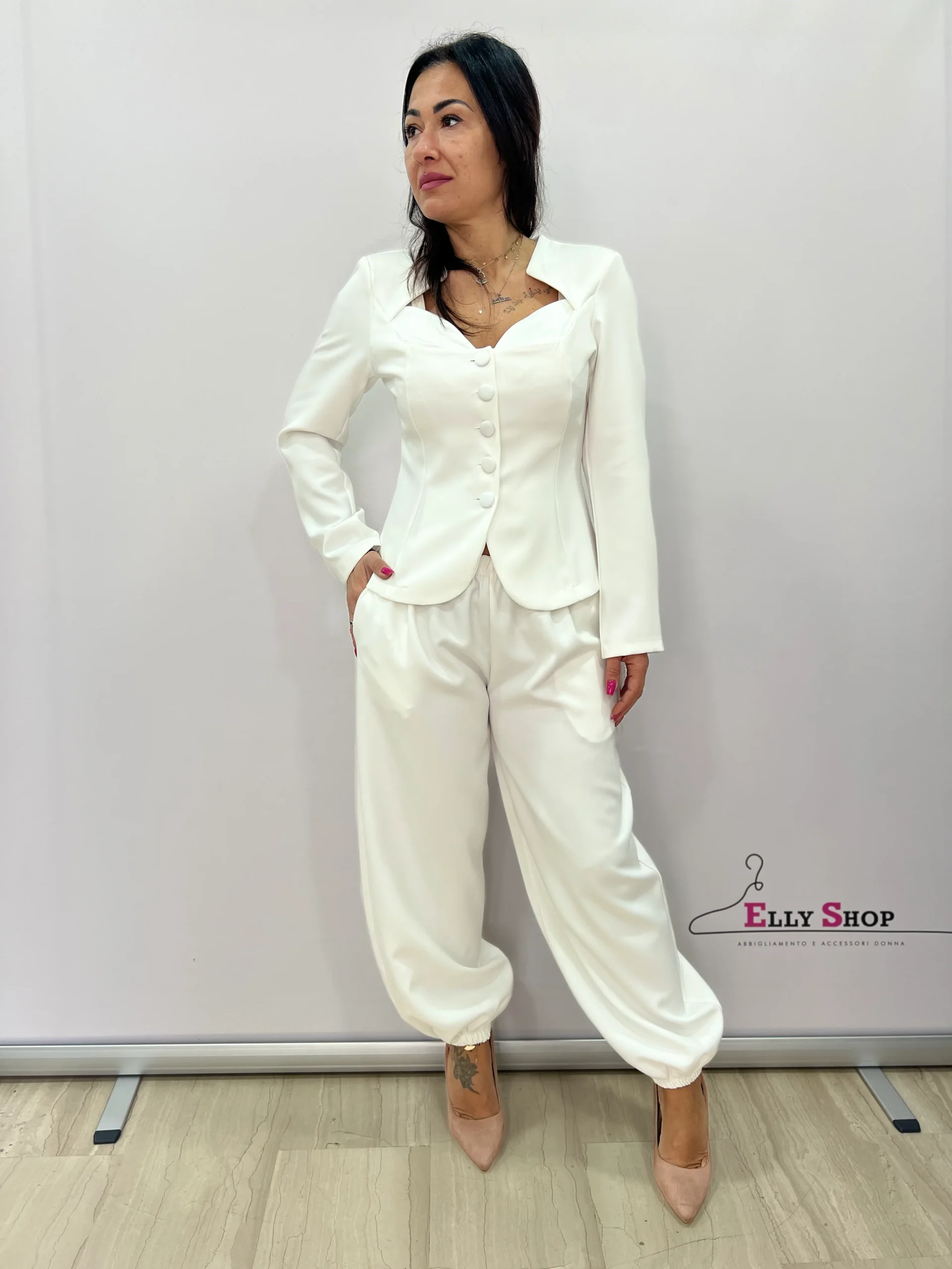 Completo donna dal taglio sofisticato e contemporaneo, composto da giacca strutturata con scollo sagomato e pantalone morbido a gamba ampia con fondo elasticizzato. La giacca, caratterizzata da linea avvitata e bottoni frontali tono su tono, valorizza il punto vita e slancia la figura, donando un’allure femminile e raffinata. Il pantalone, fluido e confortevole, crea un piacevole contrasto tra struttura e morbidezza, rendendo il completo perfetto per cerimonie, eventi eleganti, occasioni formali o look da ufficio ricercati. Disponibile nelle varianti colore nero e bianco, per uno stile intramontabile e versatile.