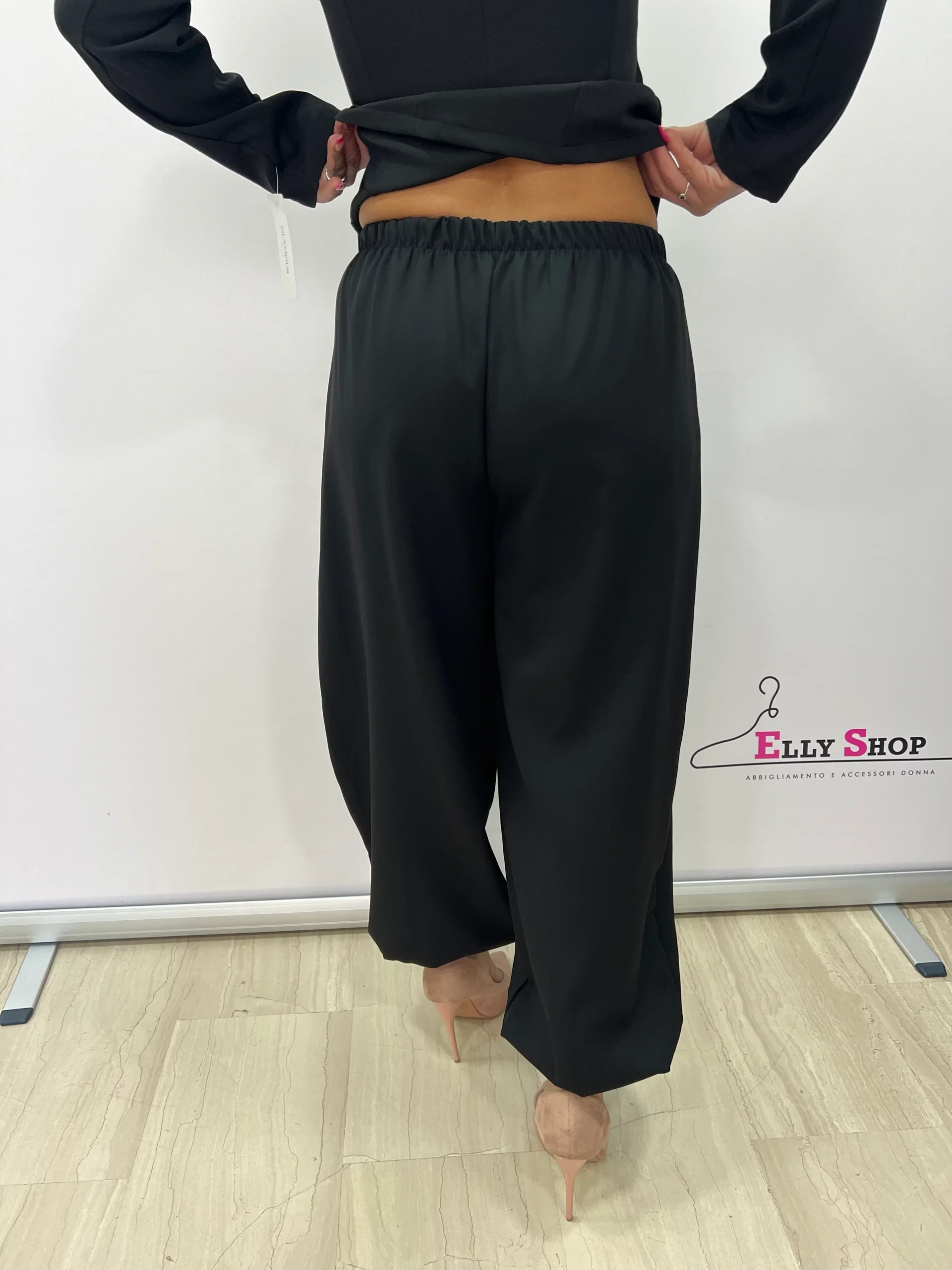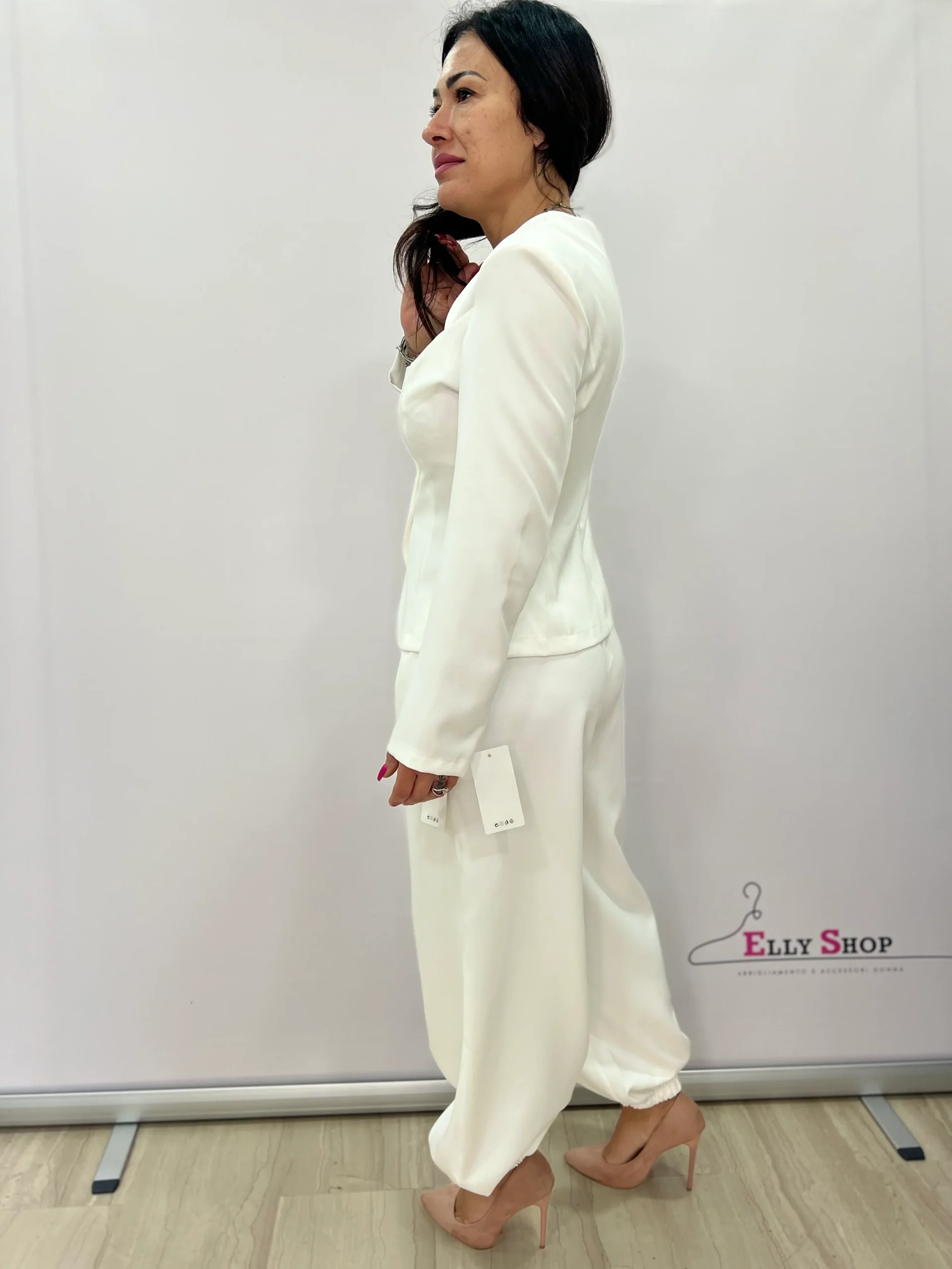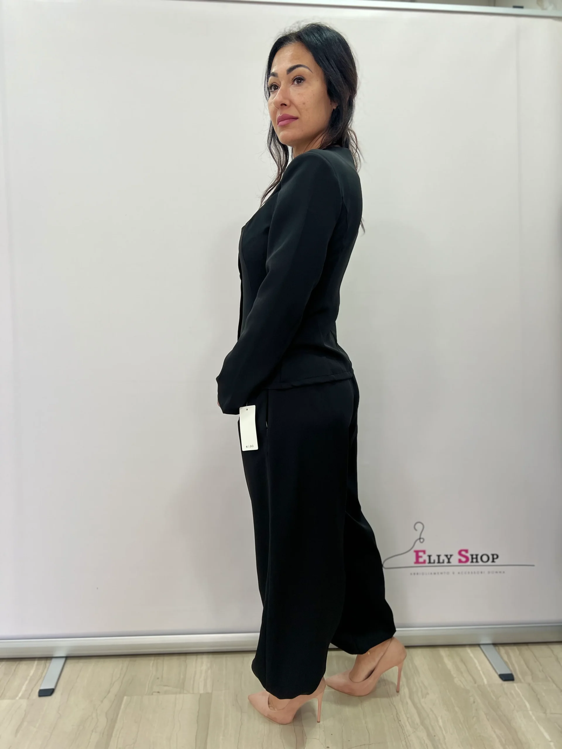 Completo donna dal taglio sofisticato e contemporaneo, composto da giacca strutturata con scollo sagomato e pantalone morbido a gamba ampia con fondo elasticizzato. La giacca, caratterizzata da linea avvitata e bottoni frontali tono su tono, valorizza il punto vita e slancia la figura, donando un’allure femminile e raffinata. Il pantalone, fluido e confortevole, crea un piacevole contrasto tra struttura e morbidezza, rendendo il completo perfetto per cerimonie, eventi eleganti, occasioni formali o look da ufficio ricercati. Disponibile nelle varianti colore nero e bianco, per uno stile intramontabile e versatile.
