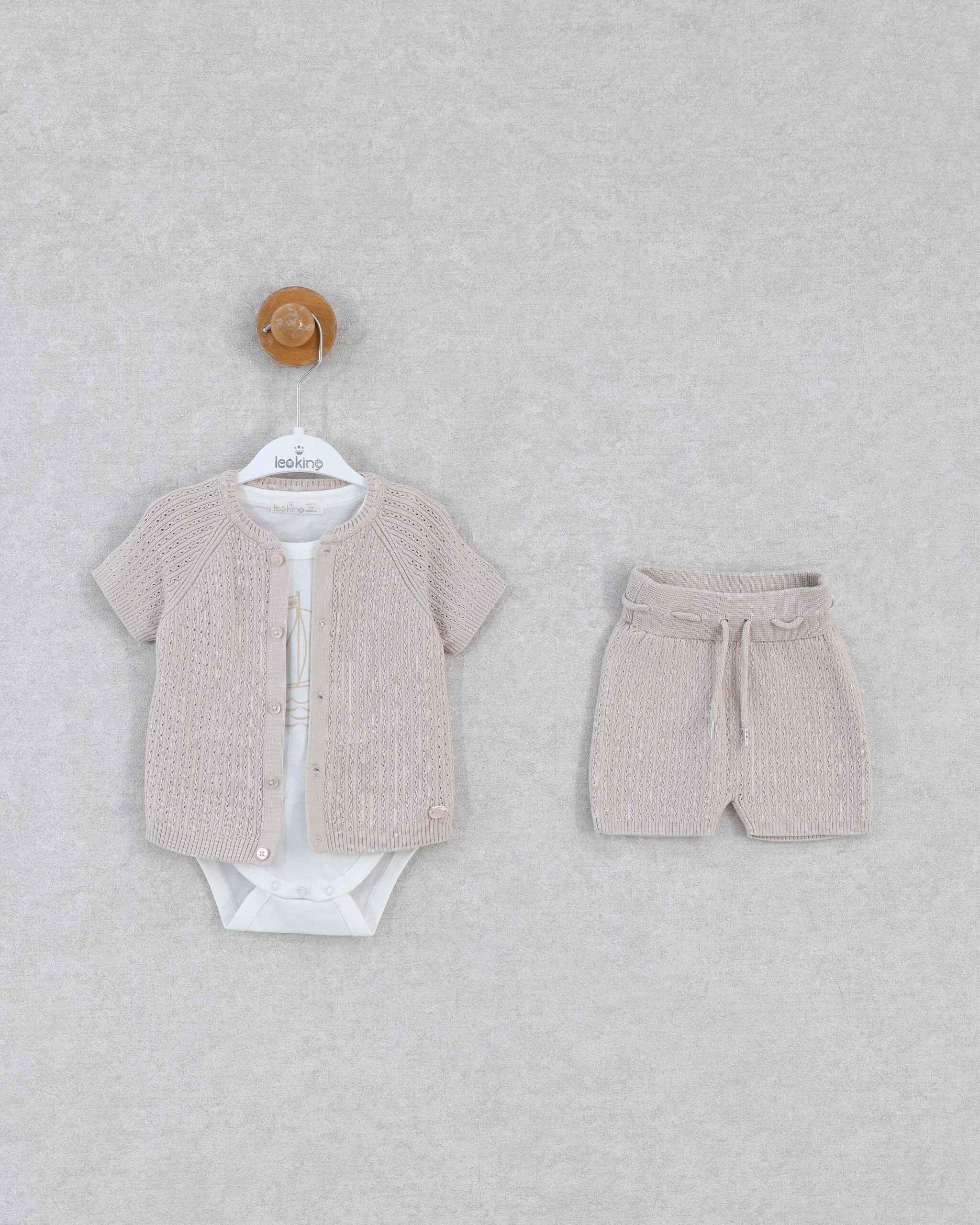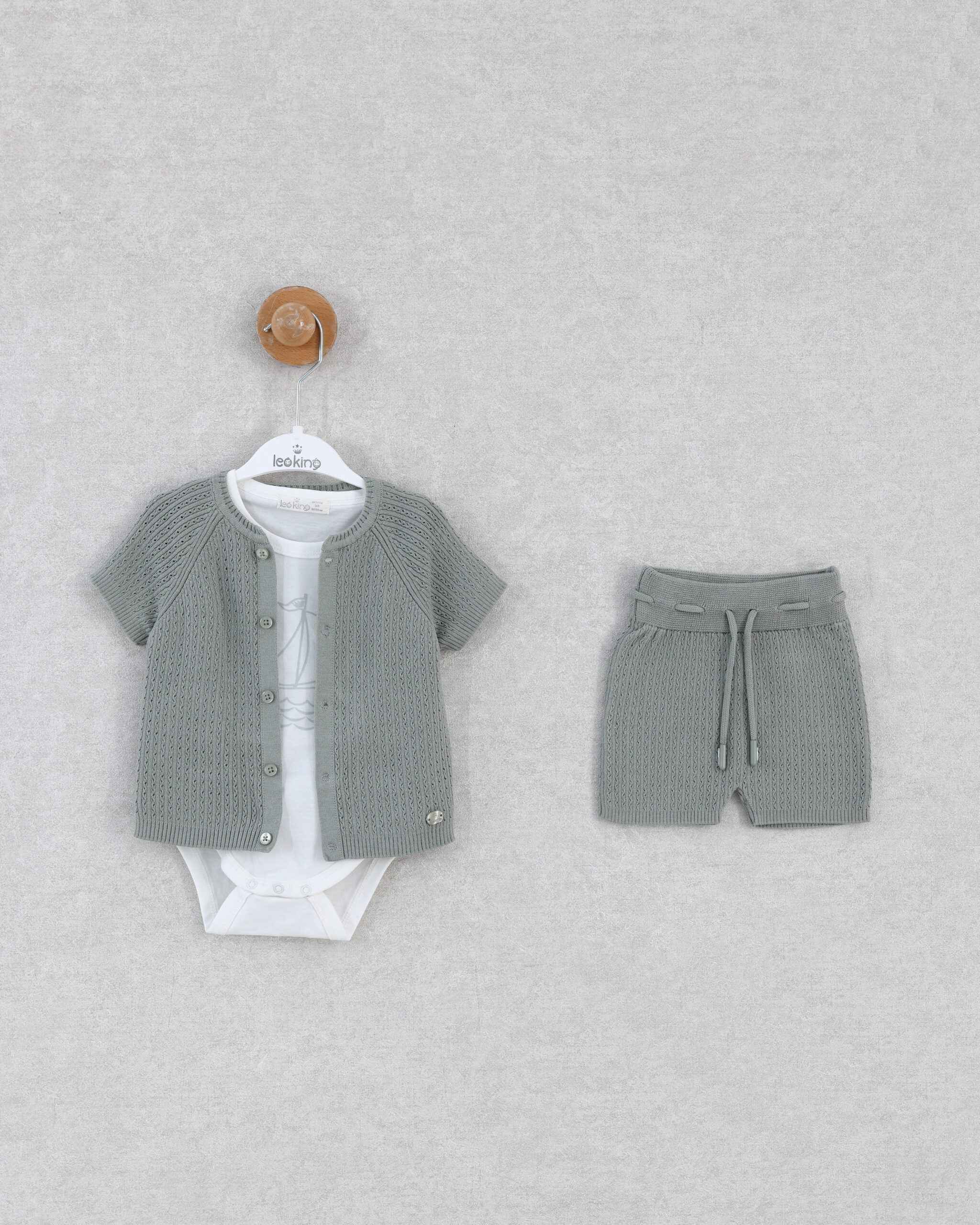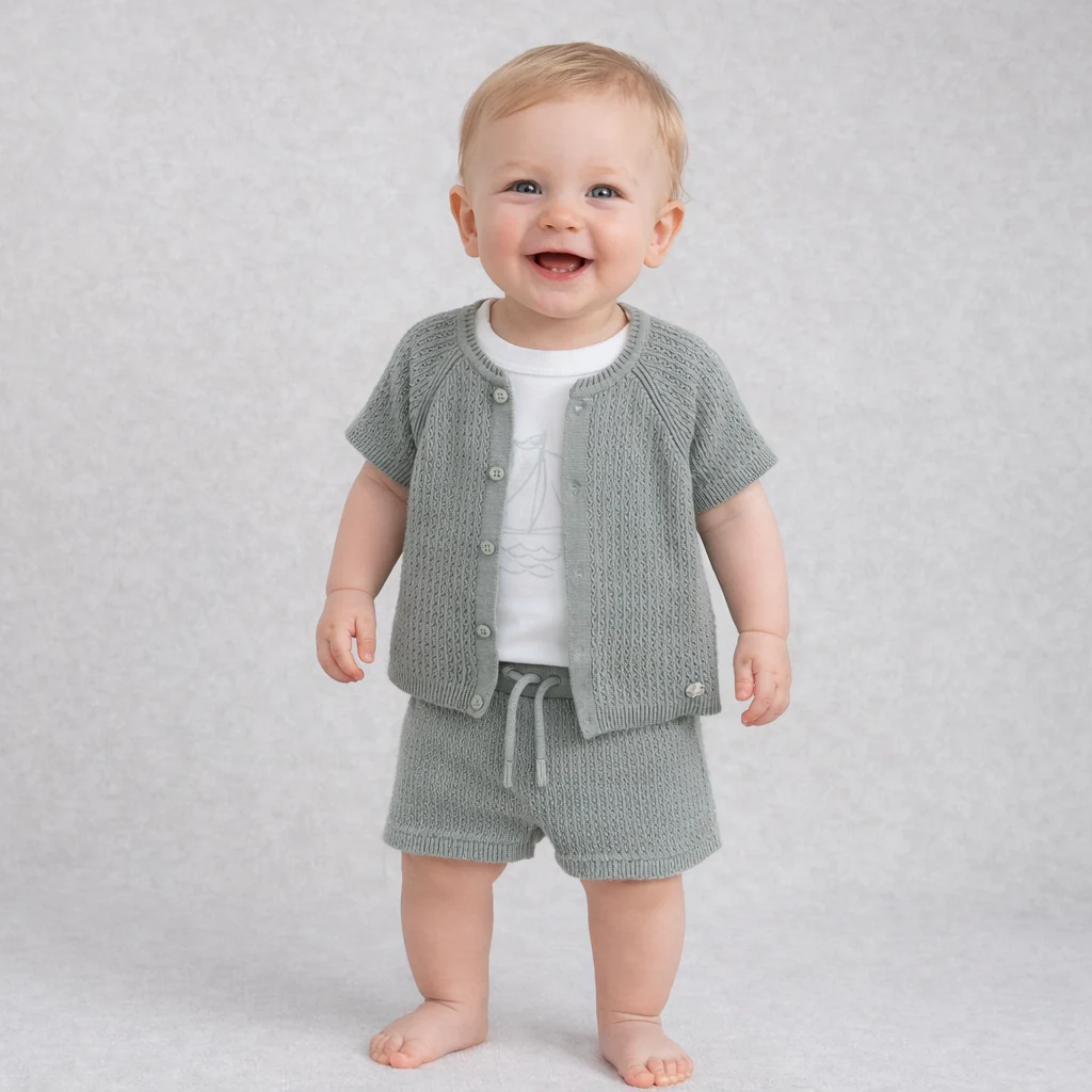 Completo estivo in maglia per neonatoIl set include: * Cardigan in maglia: * Materiale: Maglia leggera e traspirante, ideale per le giornate calde. * Design: Modello a mezza manica, con lavorazione a nido d’ape per un effetto elegante e raffinato. * Chiusura: Bottoni frontali, facili da aprire e chiudere per un cambio rapido. * Dettagli: […]