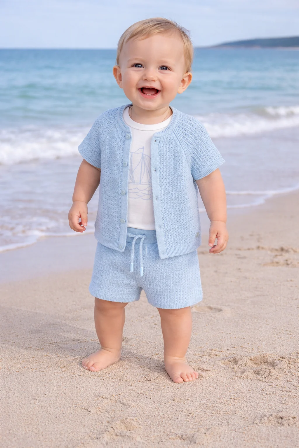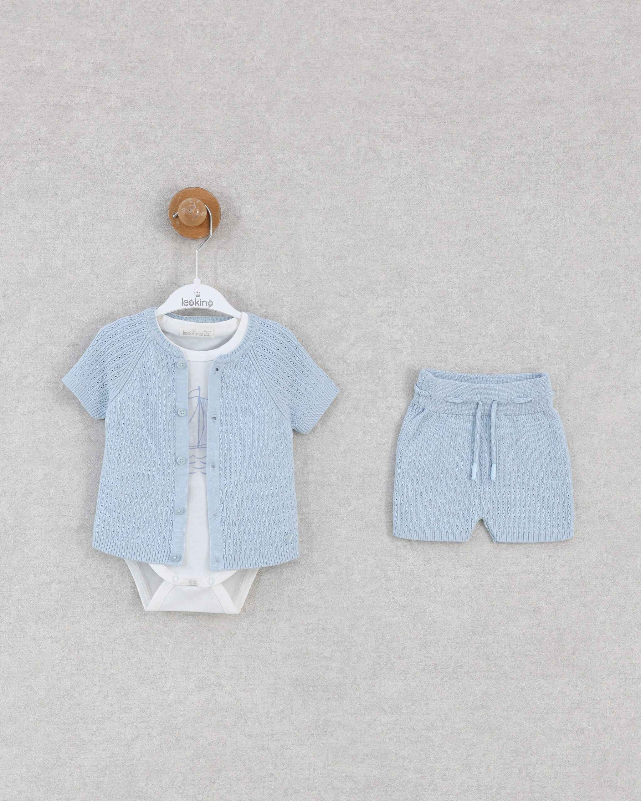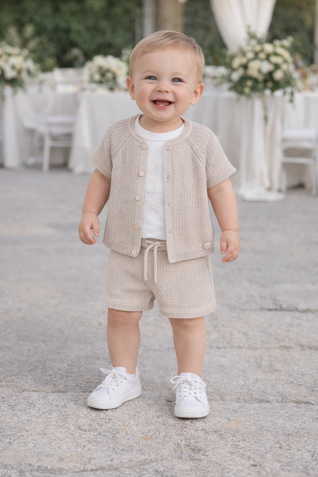 Completo estivo in maglia per neonatoIl set include: * Cardigan in maglia: * Materiale: Maglia leggera e traspirante, ideale per le giornate calde. * Design: Modello a mezza manica, con lavorazione a nido d’ape per un effetto elegante e raffinato. * Chiusura: Bottoni frontali, facili da aprire e chiudere per un cambio rapido. * Dettagli: […]