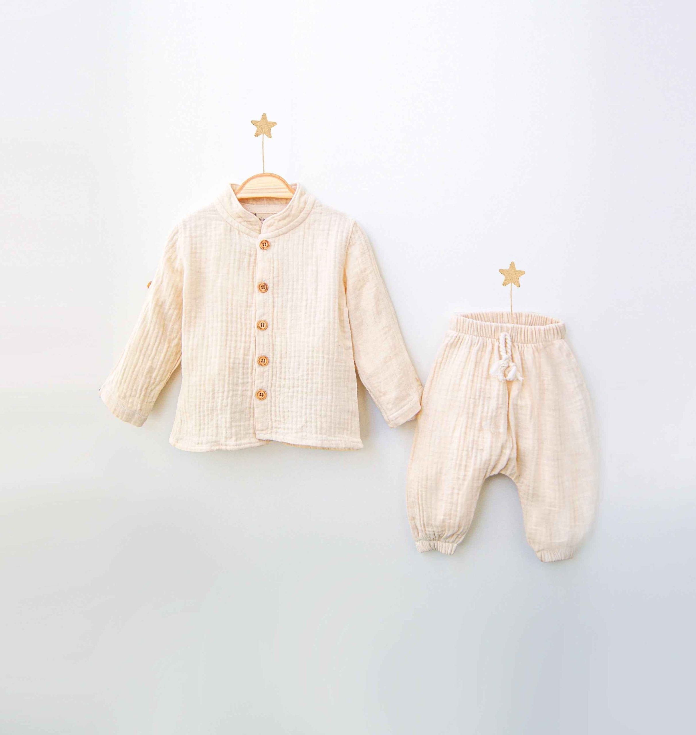 Regala comfort e stile al tuo piccolo con questo adorabile set in mussola di cotone, perfetto per ogni stagione.