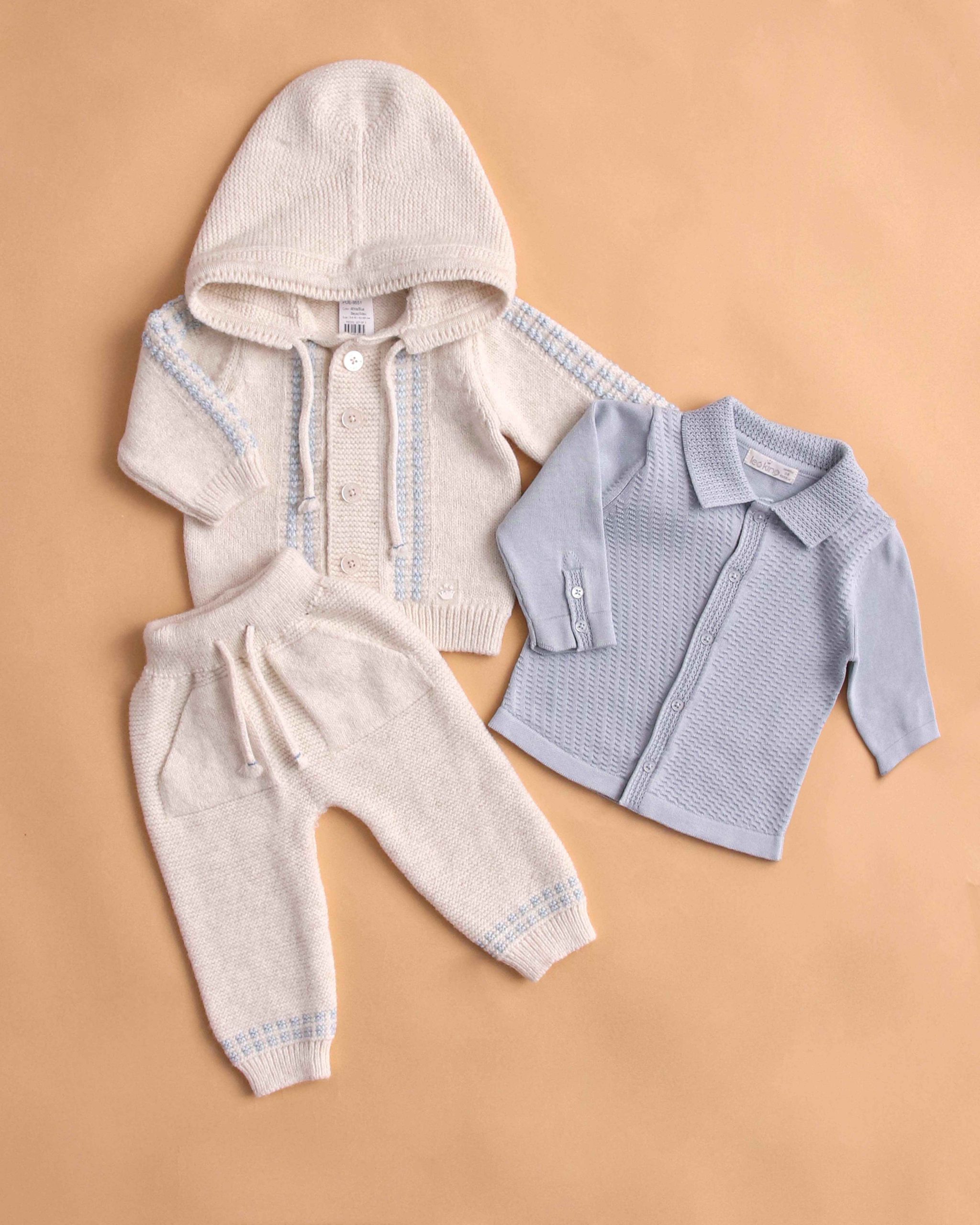 Questo elegante set neonato รจ composto da tre capi coordinati in tonalitร delicate e raffinate: bianco e azzurro polvere. I tessuti morbidi e le lavorazioni a maglia rendono ogni pezzo confortevole, caldo e ideale per la pelle sensibile dei piรน piccoli.