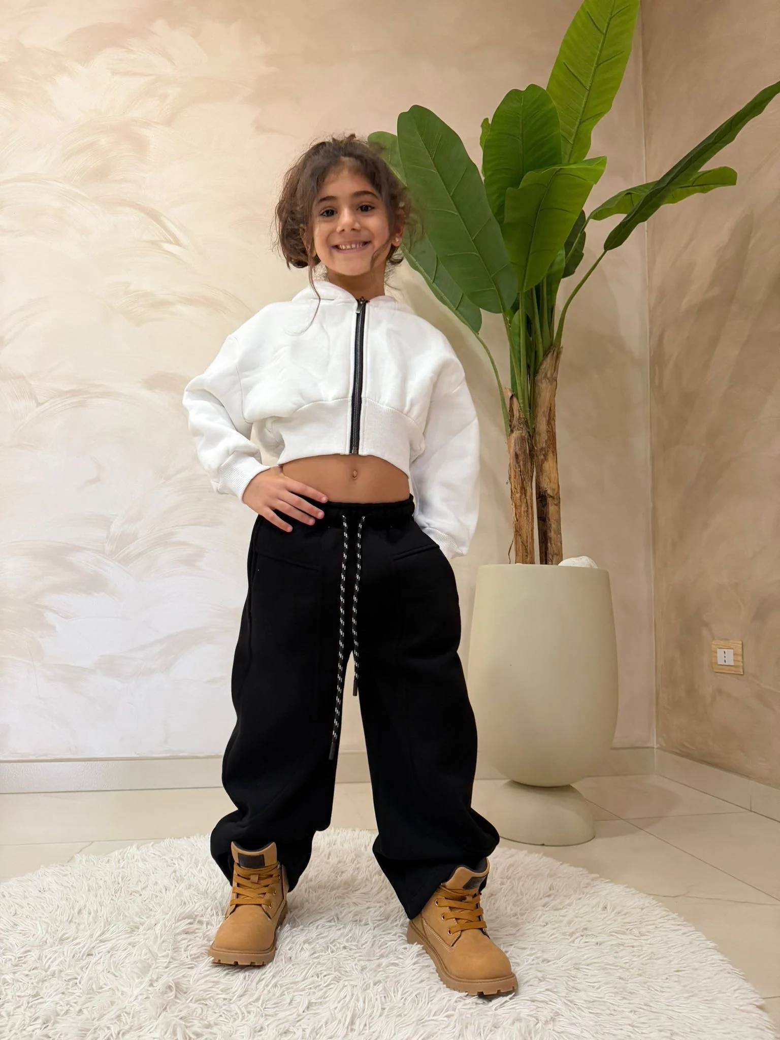 Completo sportivo per bambina Un completo sportivo moderno e di tendenza, perfetto per outfit comodi e grintosi. La felpa cropped con zip frontale aggiunge un tocco attuale e dinamico, mentre i pantaloni ampi con coulisse regolabile garantiscono massima libertà di movimento. Ideale per la scuola, il tempo libero o attività quotidiane, questo set combina comfort […]